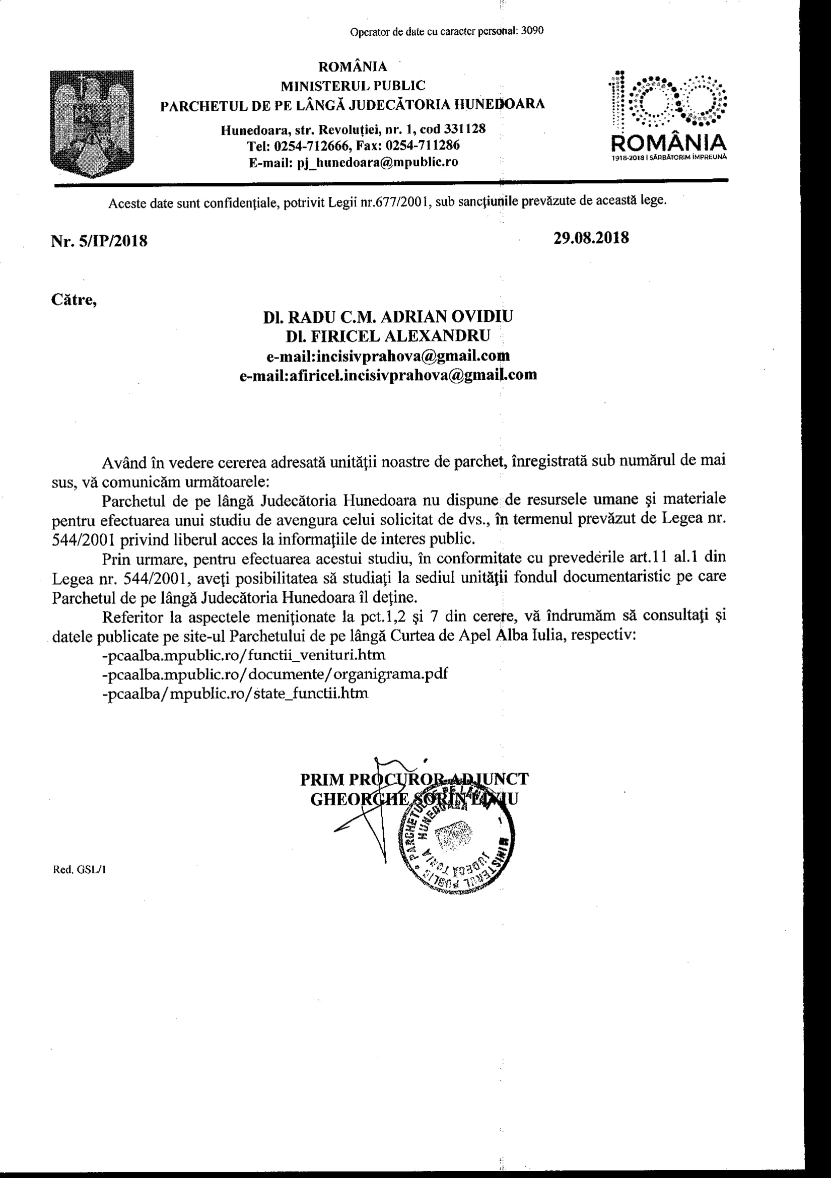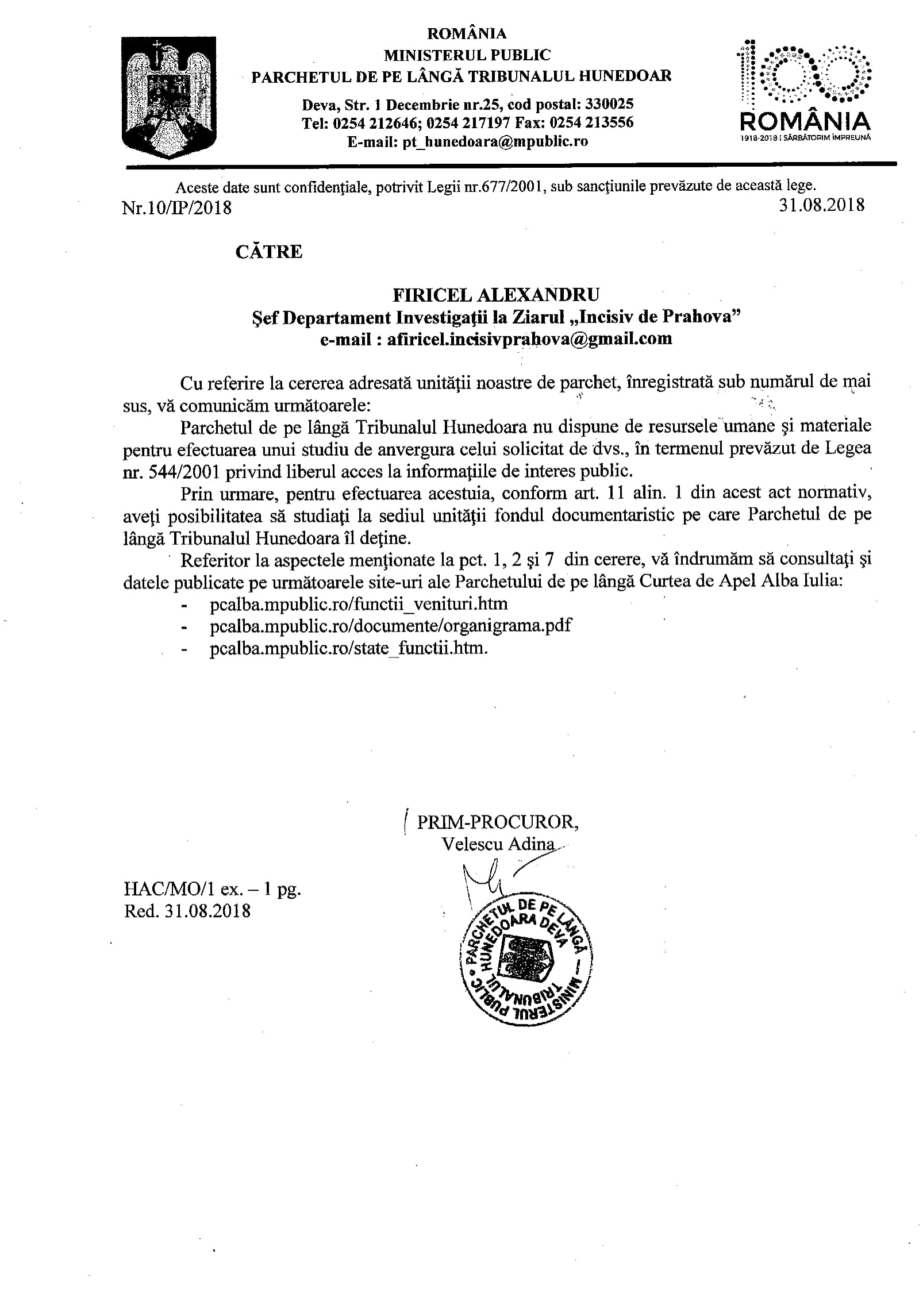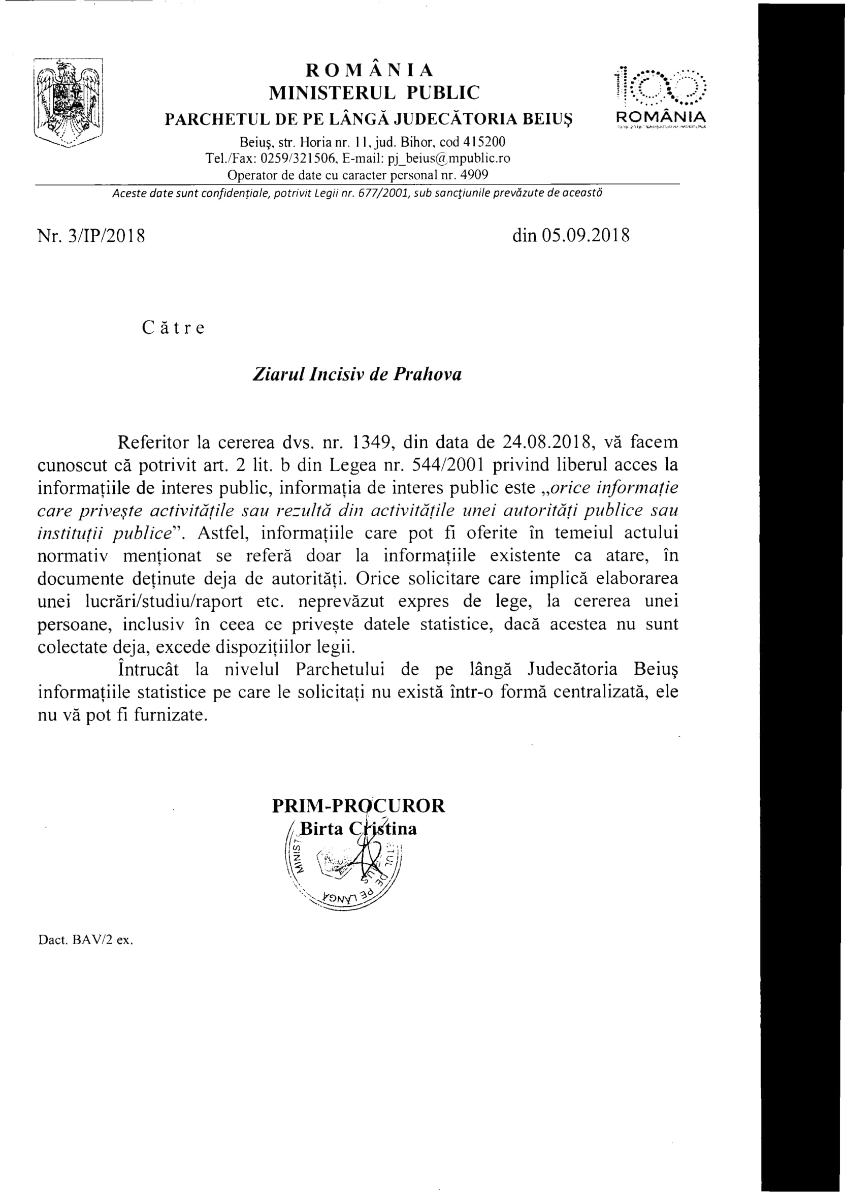 - Adresa Parchetului de pe lângă Judecătoria Cornetu este COLOSALĂ! O tăntică Simion Nicoleta Minodora (prim procuror dealtfel) susține că informațiile solicitate sunt exceptate de la liberul acces la informații publice. Păi băi cocoană, nu ți-am cerut date din dosare ci date despre dosare nesoluționate, fără să solicităm date de identificare ale părților! Venitul mătăluță e informație publică, coană „procuraură”, că ești angajat al statului în funcția de „acuzator public”!