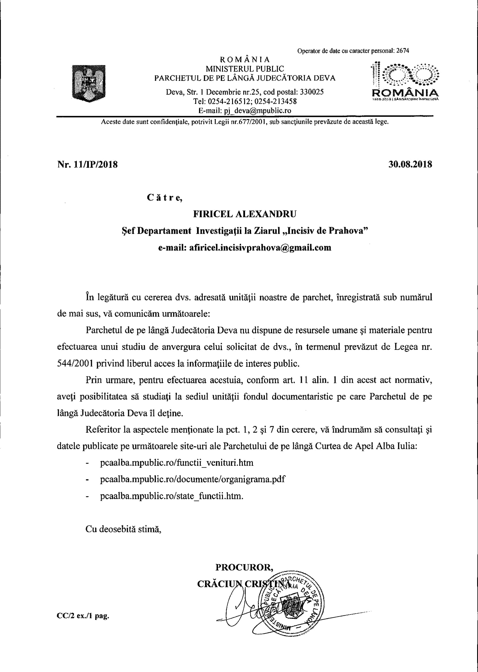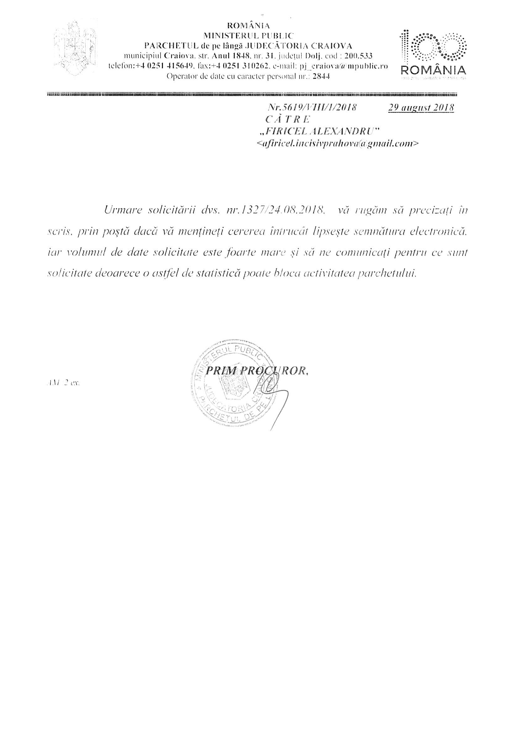- Parchetul de pe Lângă Judecătoria Craiova o avea prim procuror sau a semnat vreun recidivist aflat în incinta acestei entități? Sau femeia de serviciu angajată la această entitate? Nu știm căci individul/individa care a semnat adresa 569/VIII/29.08.2018. Pe sitte-ul Ministeruluui Public se suține că primprocur ar fii unul, Burcă Ion Daniel (reînvestit)…