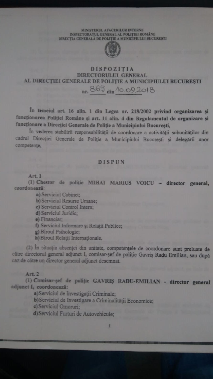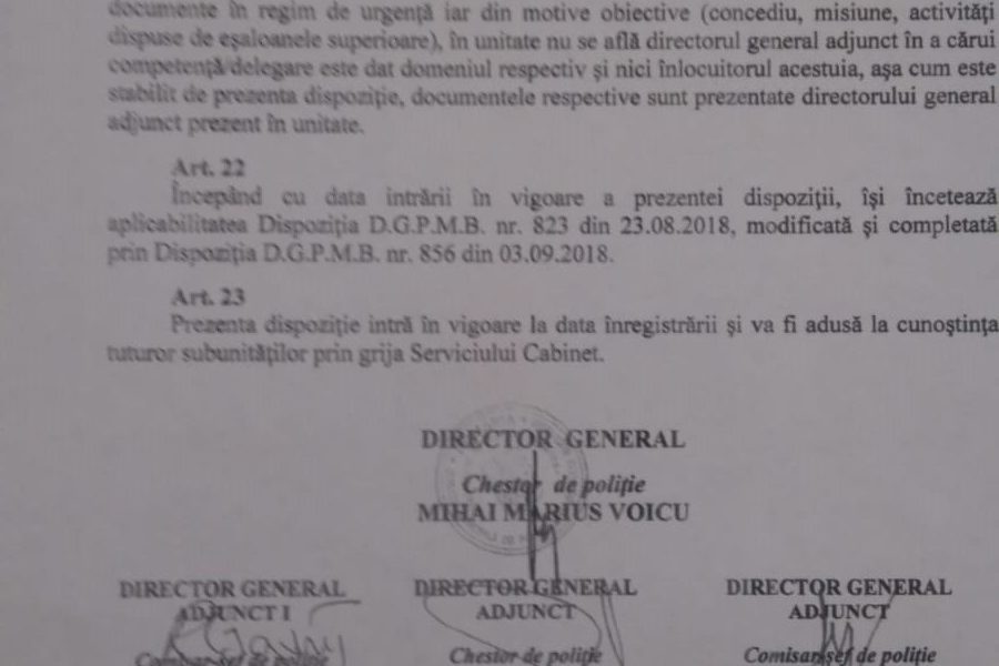 În data de 10 septembrie, revenit din bolînzeală pe scaunu-i de mare ștab la DGPMB, Voicu Marius a emis dispoziția 865 în care, își evidențiază crasa incompetență (a lui și a celorlați semnatari). Încă din preambul se observă că „voința ștabului” e prevăzută într-un regulament intern, (secret de serviciu) nicidecum în Lege… căci Legea îi dă peste bot acestui dobitoc și tagmei lui de „infractori cu epoleți”: Articolul 27^6 din Legea nr.360/2002 privind statutul polițistului (1) Delegarea reprezintă exercitarea temporară de către polițist a unor activități corespunzătoare postului ocupat, în afara locului său de muncă, în aceeași unitate sau într-o altă unitate. Delegarea se dispune în interesul unității în care este încadrat polițistul sau în interesul unității ierarhic superioare.(2) Prin excepție de la prevederile alin. (1), pe perioada delegării, polițistul poate exercita, cu acordul său scris, alte activități decât cele corespunzătoare postului ocupat, stabilite în actul administrativ de modificare a raporturilor de serviciu. Articolul 27^7Delegarea poate fi dispusă pentru o perioadă de cel mult 60 de zile calendaristice într-o perioadă de 12 luni. Delegarea pe o perioadă mai mare de 60 de zile calendaristice într-o perioadă de 12 luni se poate dispune numai cu acordul scris al polițistului. Credeți că Voicu a modificat actele administrative ale subordonaților lui în același timp cu această dispoziție 865? Noi nu!