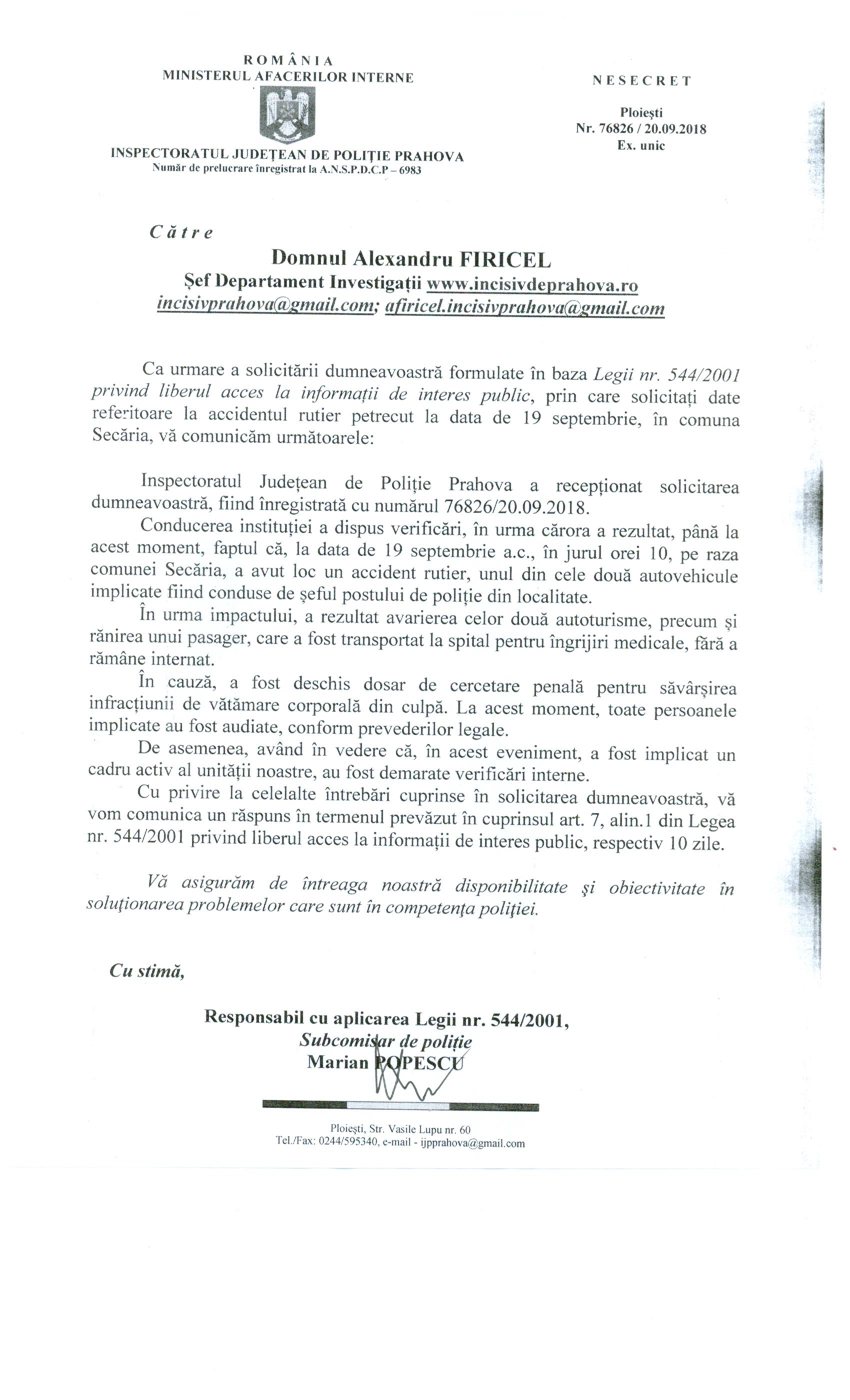 Interpelat IPJ Prahova cu privire la acest eveniment rutier, instituția ne-a comunicat faptul că până la ora 1600 „au fost audiate toate persoanele implicate” în cadrul dosarului penal deschis pentru vătămare din culpă iar la nivel intern, verificări pentru sancționarea disciplinară a „marelui polițist de Secăria”.