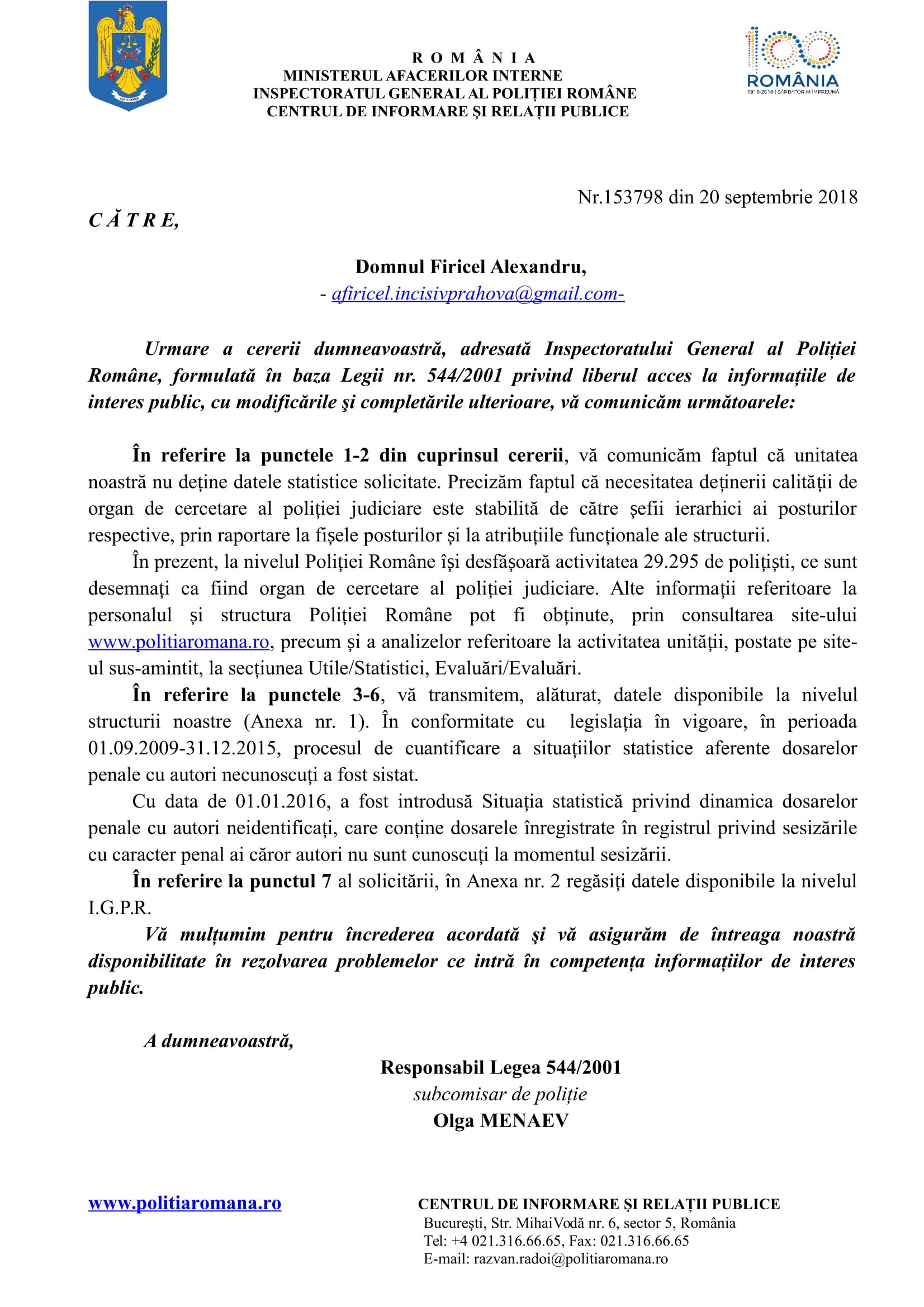 O altă minciună sfruntată a I.G.P.R.-ului (și cea mai dureroasă pentru noi toți dealtfel) constă în faptul că, la data de 17.10.2016 când „Adevărul” a publicat interviul cu Despescu Bogdann (fostul șef al Poliției Române): Şeful Poliţiei Române, despre sutele de mii de dosare cu autor necunoscut şi despre cazul Gigină. „Nu am vorbit niciodată cu părinţii lui Bogdan“ se vorbea de un număr total de „până în 600.000 dosare cu autor necunoscut aflate în lucru la structurile judiciare din Poliția Română”. În adresa IGPR-ului se menționează un număr de 667.318 dosare în același an, 2016. Cine a mințit atunci? Și cine minte acum? mai ales că IGPR-ul susține, cităm: În conformitate cu  legislația în vigoare, în perioada 01.09.2009-31.12.2015, procesul de cuantificare a situațiilor statistice aferente dosarelor penale cu autori necunoscuți a fost sistat. Cu data de 01.01.2016, a fost introdusă Situația statistică privind dinamica dosarelor penale cu autori neidentificați, care conține dosarele înregistrate în registrul privind sesizările cu caracter penal ai căror autori nu sunt cunoscuți la momentul sesizării. Mai exact, „a fost reorganizată evidența dosarelor penale cu autor necunoscut” pentru a se putea minți, oficial, în funcție de interese (politice, personale).