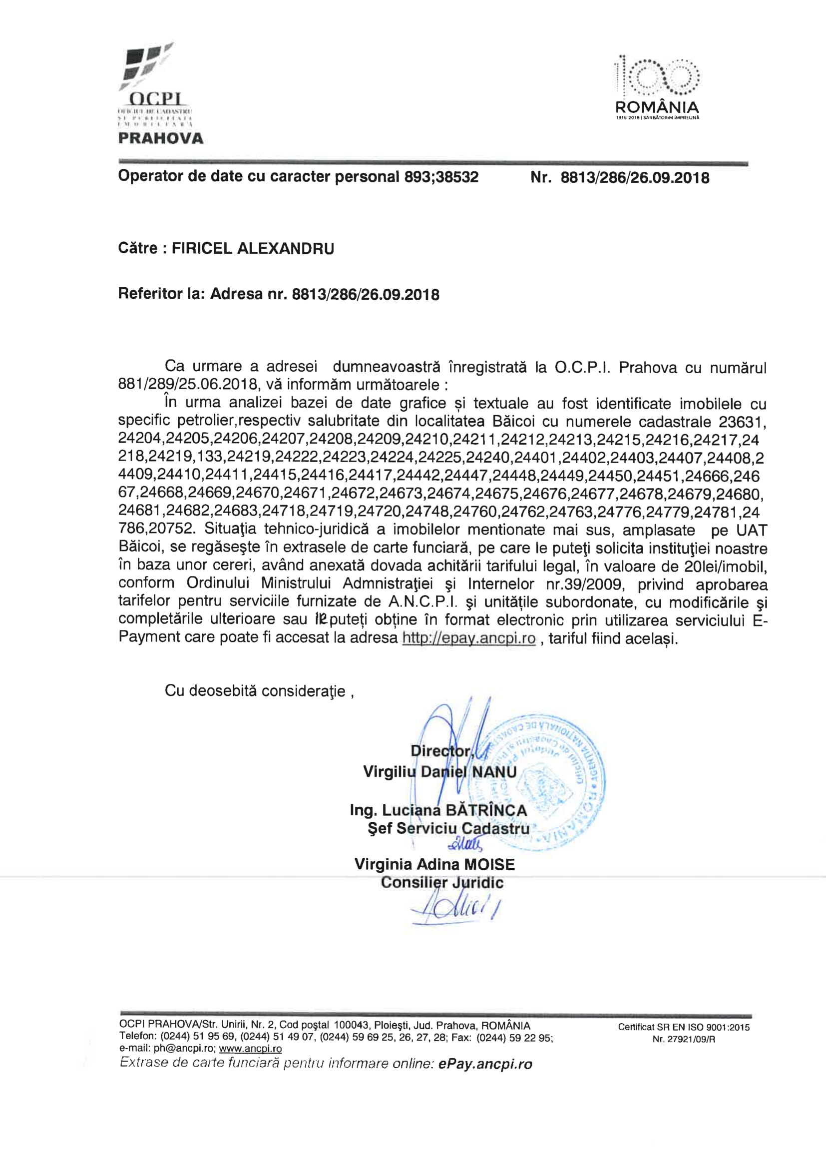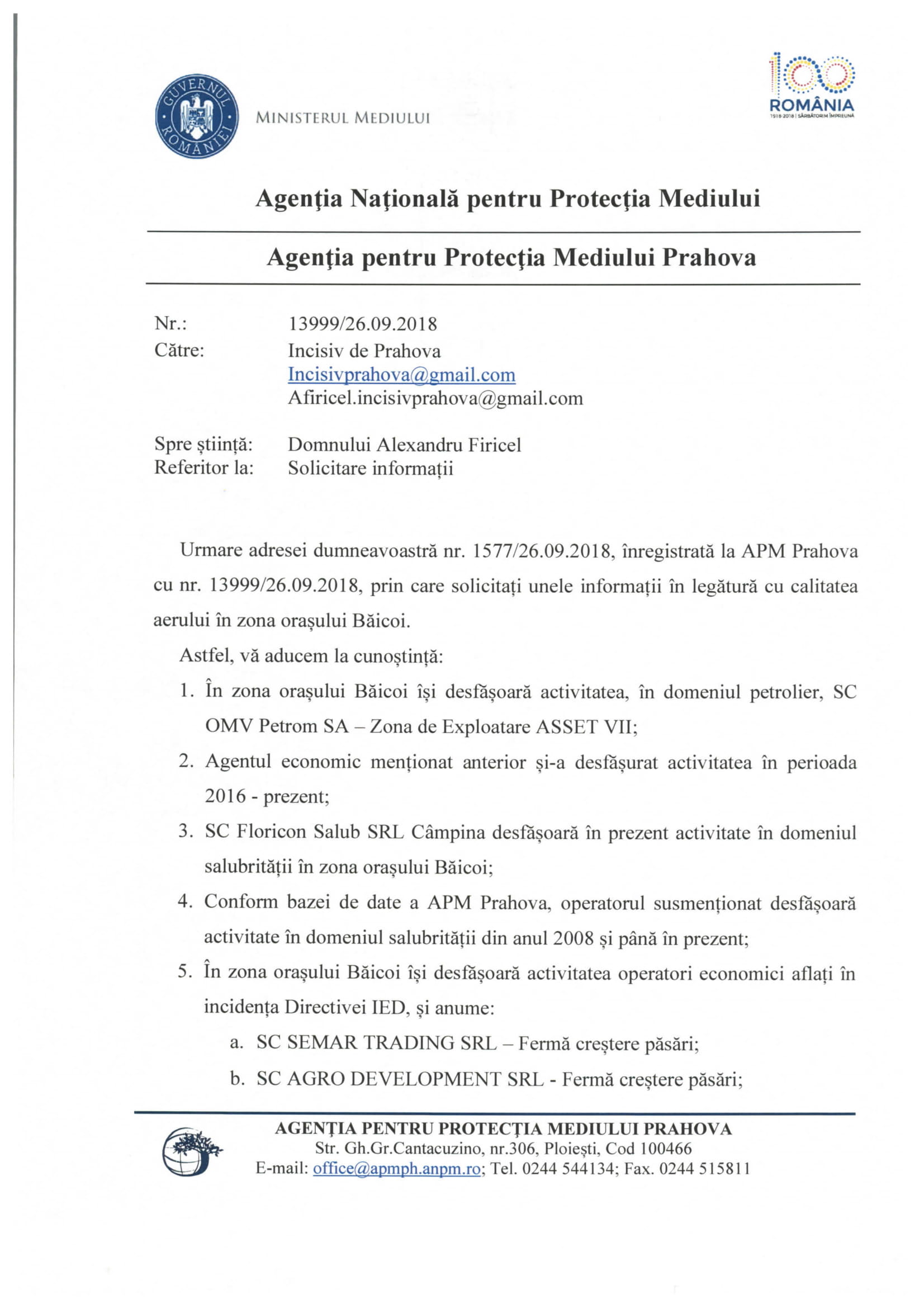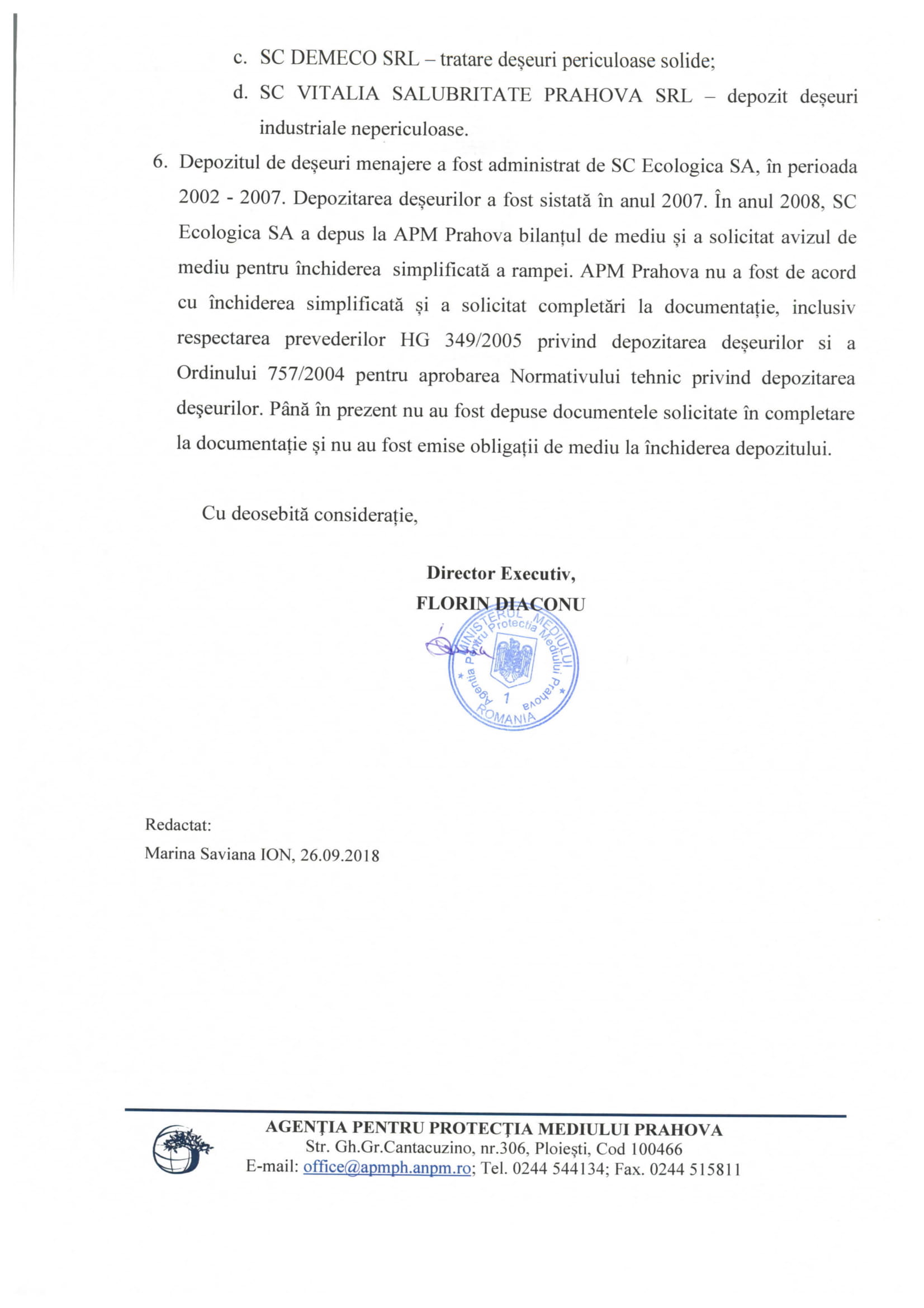 Prin adresa nr.13999/26.09.2018, ApM Prahova susține că fosta societate de salubritate Ecologica S.A. (cod unic de identificare: 14636696, nr. înregistrare în registrul comerțului J29/509/2002, radiată abia în 08 iunie 2015 (dizolvare cu lichidare) din evidențele statului român ) nu a depus toată documentația pentru închiderea simplificată a vechii rampe de gunoi din localitatea Băicoi care (funcționează în continuare, ilegal – locul unde „jmecherii” își aruncă „troacele” fără să îi deranjeze nicio autoritate).