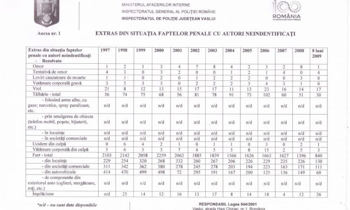 Dacă Direcția Generală de Poliție a Municipiului București (o structură a M.A.I. cu 7.000 posturi petnru angajați) ce trebuie să păzească 2milioane de suflete și bunurile acestora, instituțiile și autoritățile publice centrale și locale aflate pe raza Capitalei are în lucru peste 209mii dosare cu AN (https://www.incisivdeprahova.ro/2018/10/03/exclusiv-d-g-p-m-b-209-585-dosare-cu-autor-necunoscut-nesolutionate-doar-primele-6-luni-ale-anului-2018/), ei bine IPJ Vaslui are în lucru 661.653 dosare cu AN doar în primele 6 luni ale anului 2018. Căci, în anul 2017, /IPJ Vaslui a avut în lucru 6.706.651 dosare cu A.N. Oamenii ăștia din IPJ Vaslui, sunt sănătoși la cap? Ce s-o întâmpla în acest județ: consumă alcool și se bat zilnic între ei dar, dat fiind starea avansată de ebrietate nu se mai recunosc agresorii între ei și faptele intră sub incidența celor cu „autor necunoscut”? Sau cel/cei care au redactat acest „răspuns” 224219/29.09.2018 erau sub influența băuturilor alcoolice și și a loviturilor provocate de „autorii necunoscuți cu care s-au ciomăgit la șpriț”? Căci în situația trimisă de Ministerul Public, la nivelul parchetului de pe Lângă Tribunalul Vaslui (51) și Parchetele de pe Lângă Judecătoriile: Bîrlad (8.268), Huși (1.609) respectiv Vaslui (5.324) sunt 15.252 dosare cu A.N. în lucru. Or trage și pe nas cei din IPJ Vaslui?
