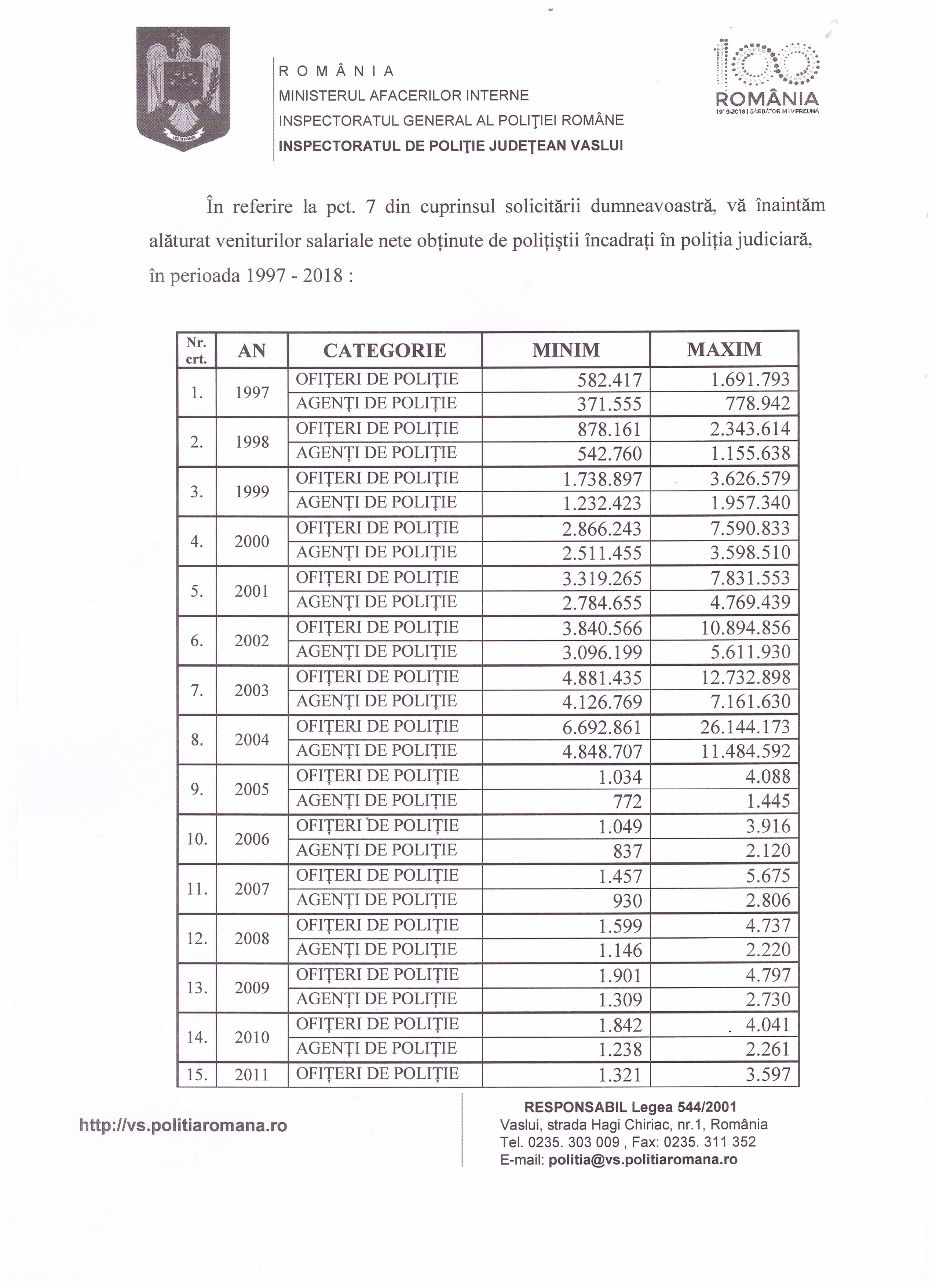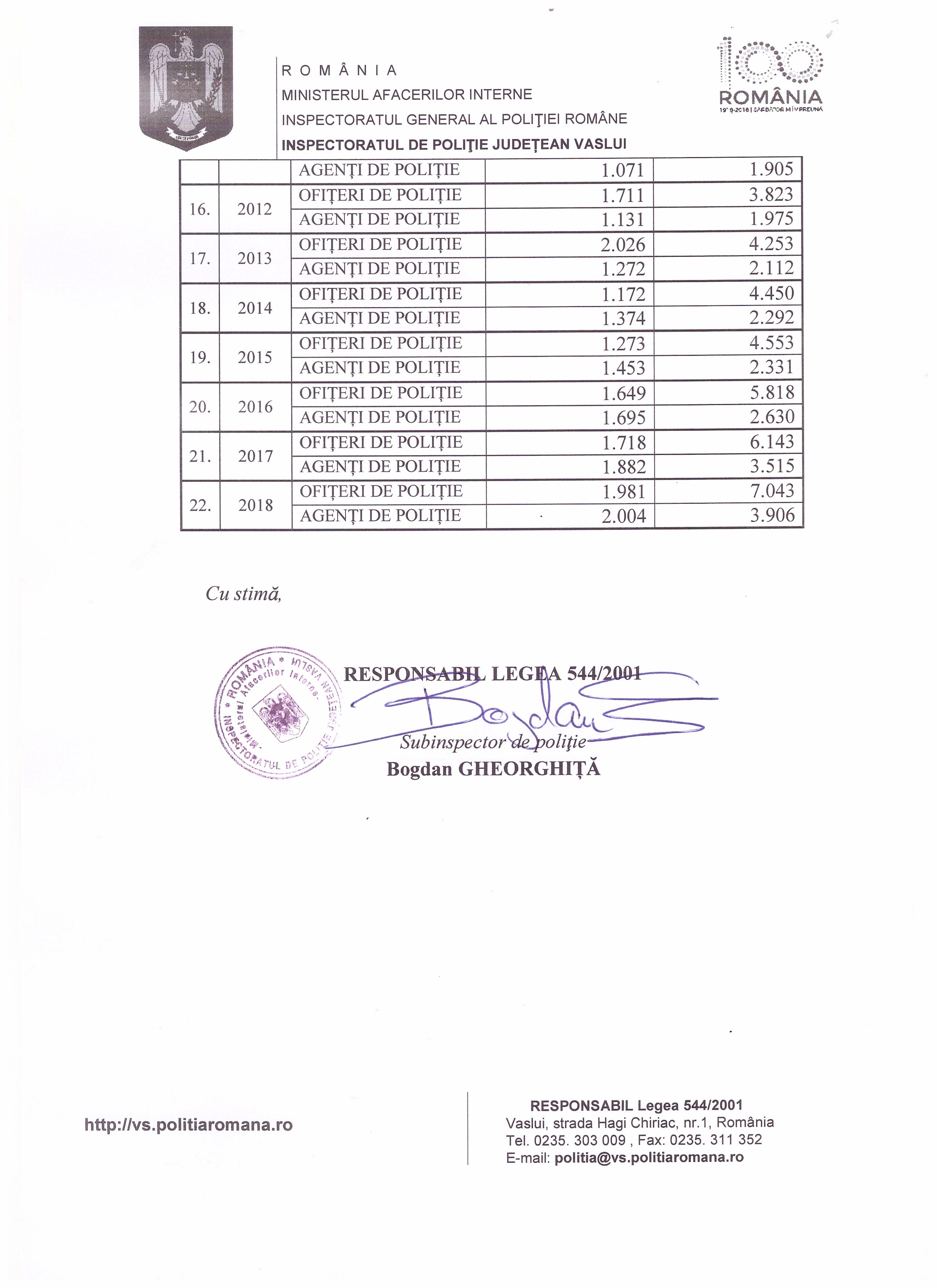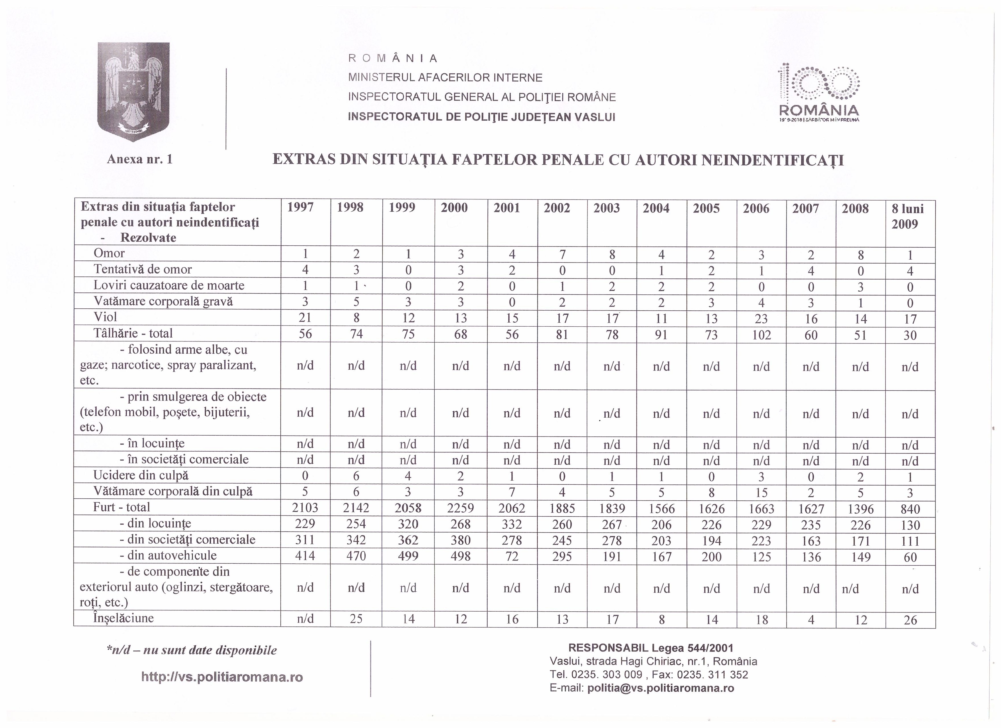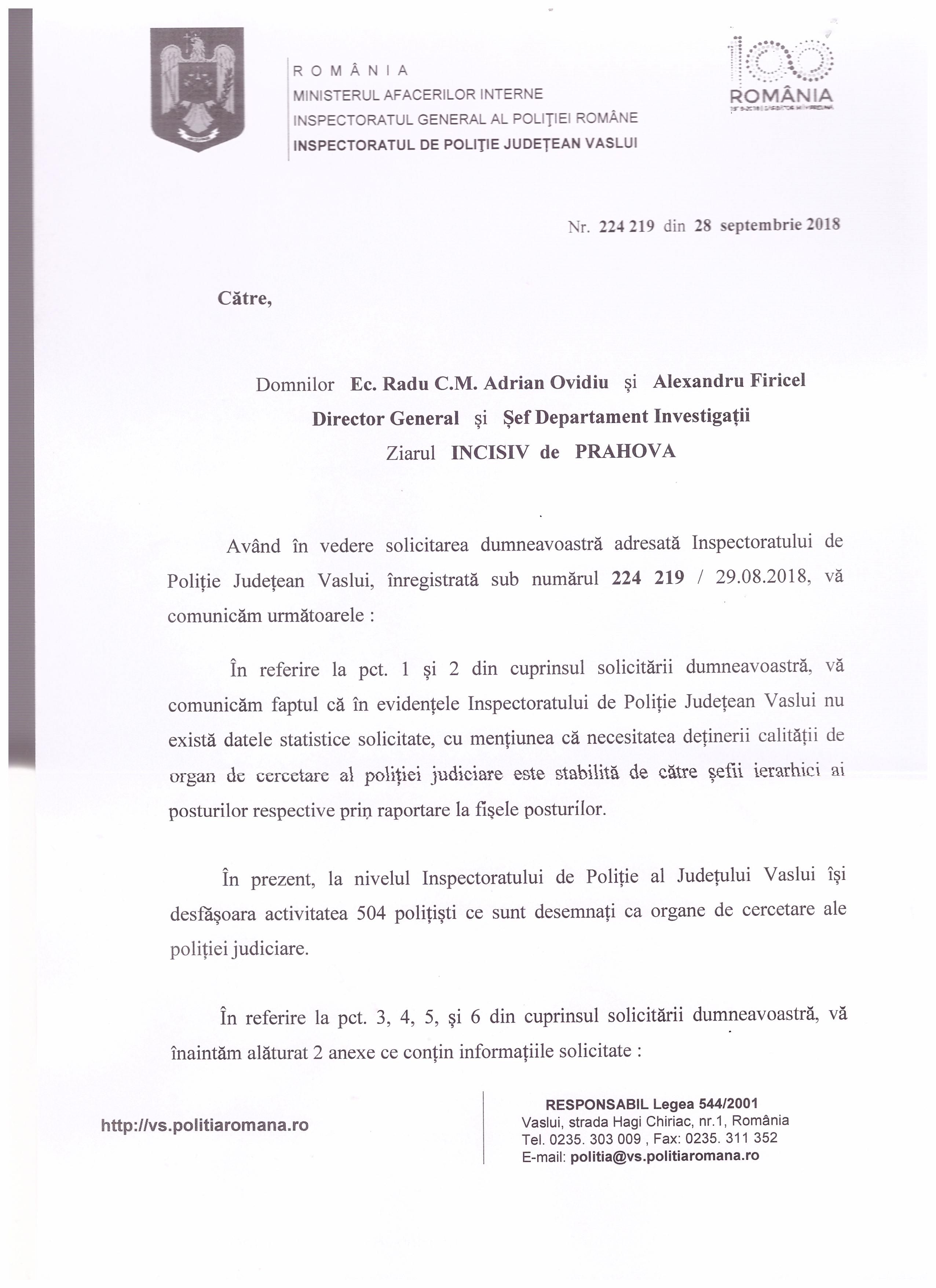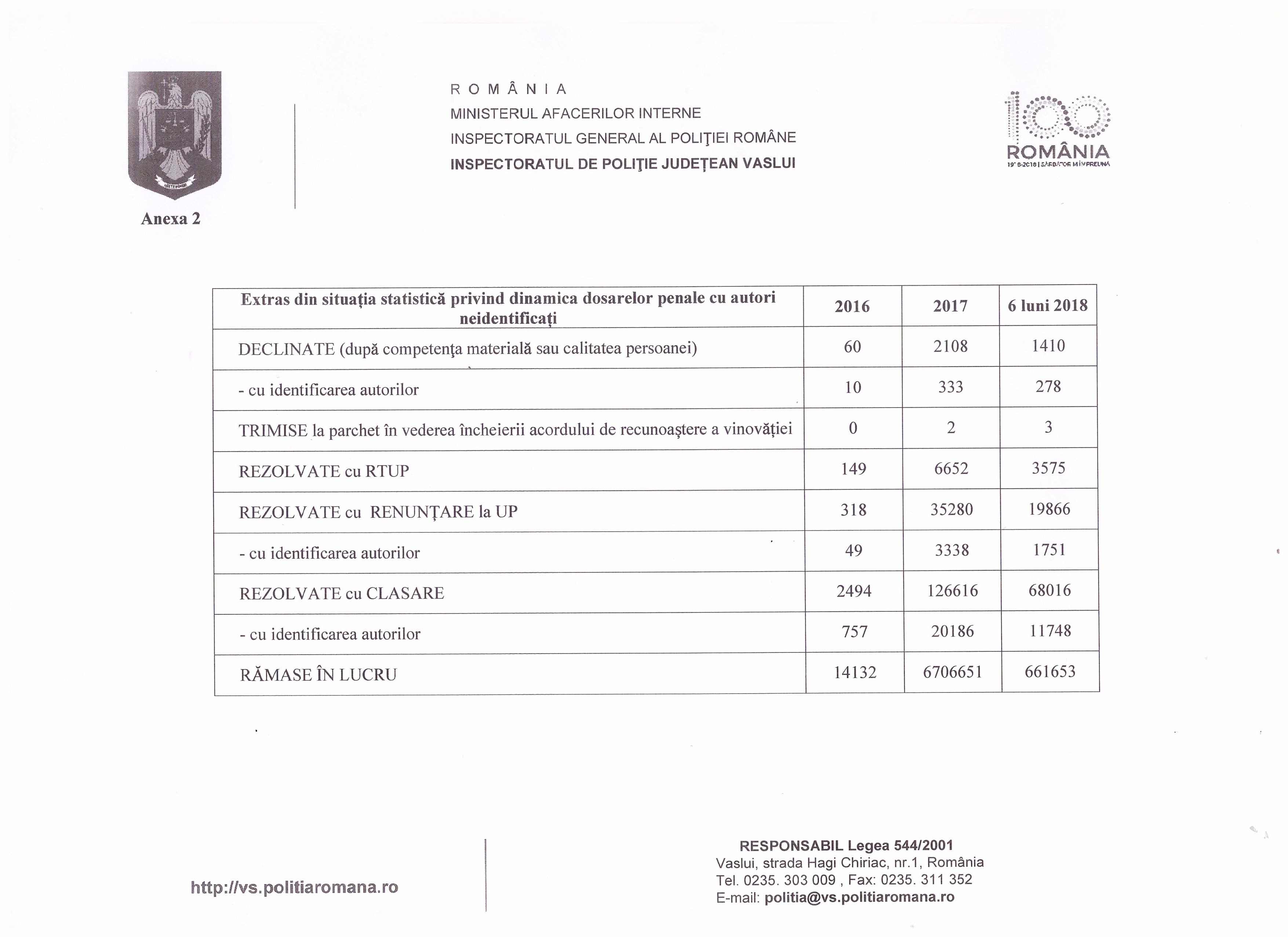 Dacă Direcția Generală de Poliție a Municipiului București (o structură a M.A.I. cu 7.000 posturi petnru angajați) ce trebuie să păzească 2milioane de suflete și bunurile acestora, instituțiile și autoritățile publice centrale și locale aflate  pe raza Capitalei are în lucru peste 209mii dosare cu AN (https://www.incisivdeprahova.ro/2018/10/03/exclusiv-d-g-p-m-b-209-585-dosare-cu-autor-necunoscut-nesolutionate-doar-primele-6-luni-ale-anului-2018/), ei bine IPJ Vaslui are în lucru 661.653 dosare cu AN doar în primele 6 luni ale anului 2018. Căci, în anul 2017, /IPJ Vaslui a avut în lucru 6.706.651 dosare cu A.N. Oamenii ăștia din IPJ Vaslui, sunt sănătoși la cap? Ce s-o întâmpla în acest județ: consumă alcool și se bat zilnic între ei dar, dat fiind starea avansată de ebrietate nu se mai recunosc agresorii între ei și faptele intră sub incidența celor cu „autor necunoscut”? Sau cel/cei care au redactat acest „răspuns” 224219/29.09.2018 erau sub influența băuturilor alcoolice și și a loviturilor provocate de „autorii necunoscuți cu care s-au ciomăgit la șpriț”? Căci în situația trimisă de Ministerul Public, la nivelul parchetului de pe Lângă Tribunalul Vaslui (51) și Parchetele de pe Lângă Judecătoriile: Bîrlad (8.268), Huși (1.609) respectiv Vaslui (5.324) sunt 15.252 dosare cu A.N. în lucru. Or trage și pe nas cei din IPJ Vaslui?