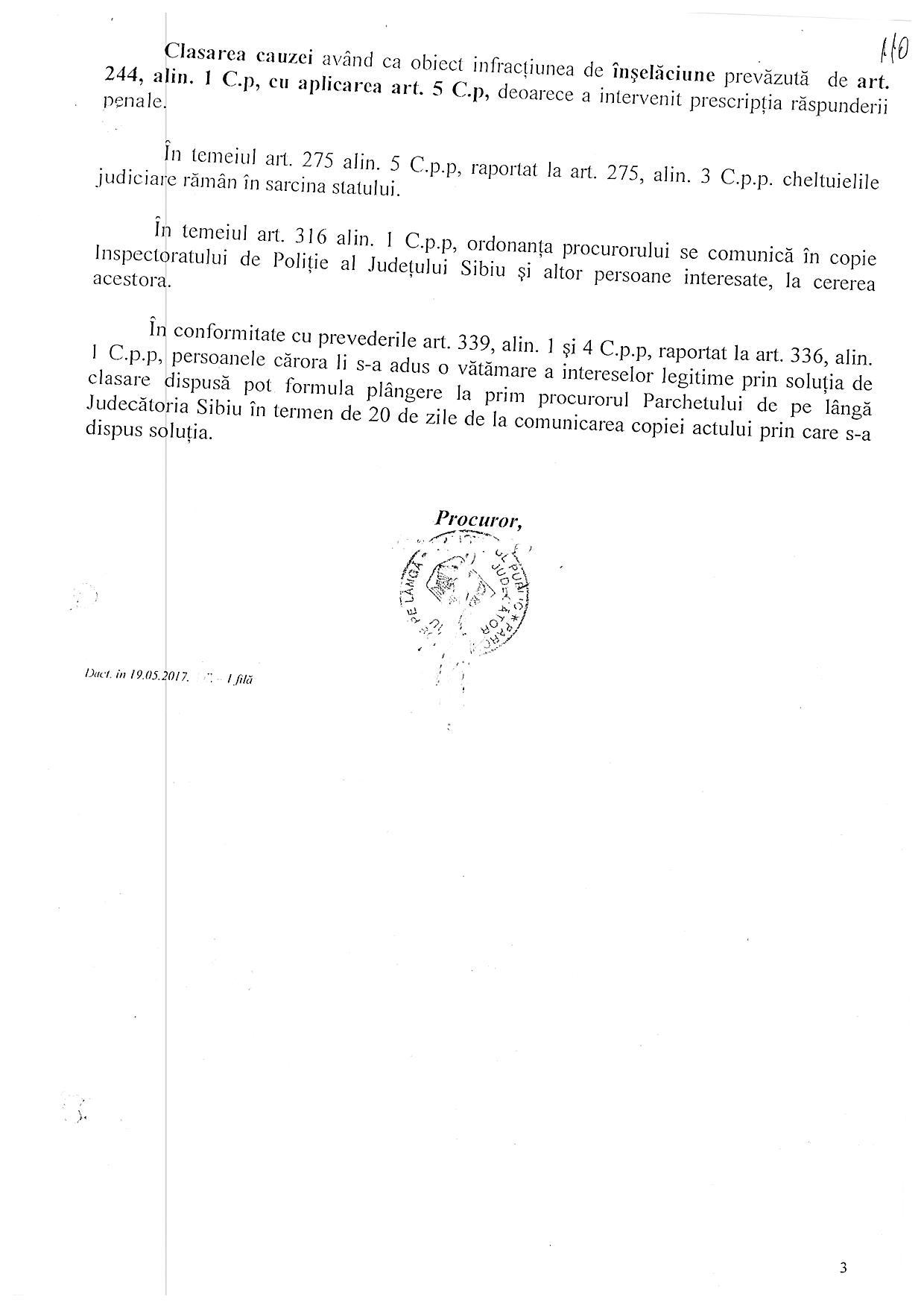 Așadar, la 3 luni de la înregistrarea dosarului penal, prin Ordonața din 19 mai 2017, cauza a fost clasată pe motivul vădit eronat că „fapta s-a prescris”.