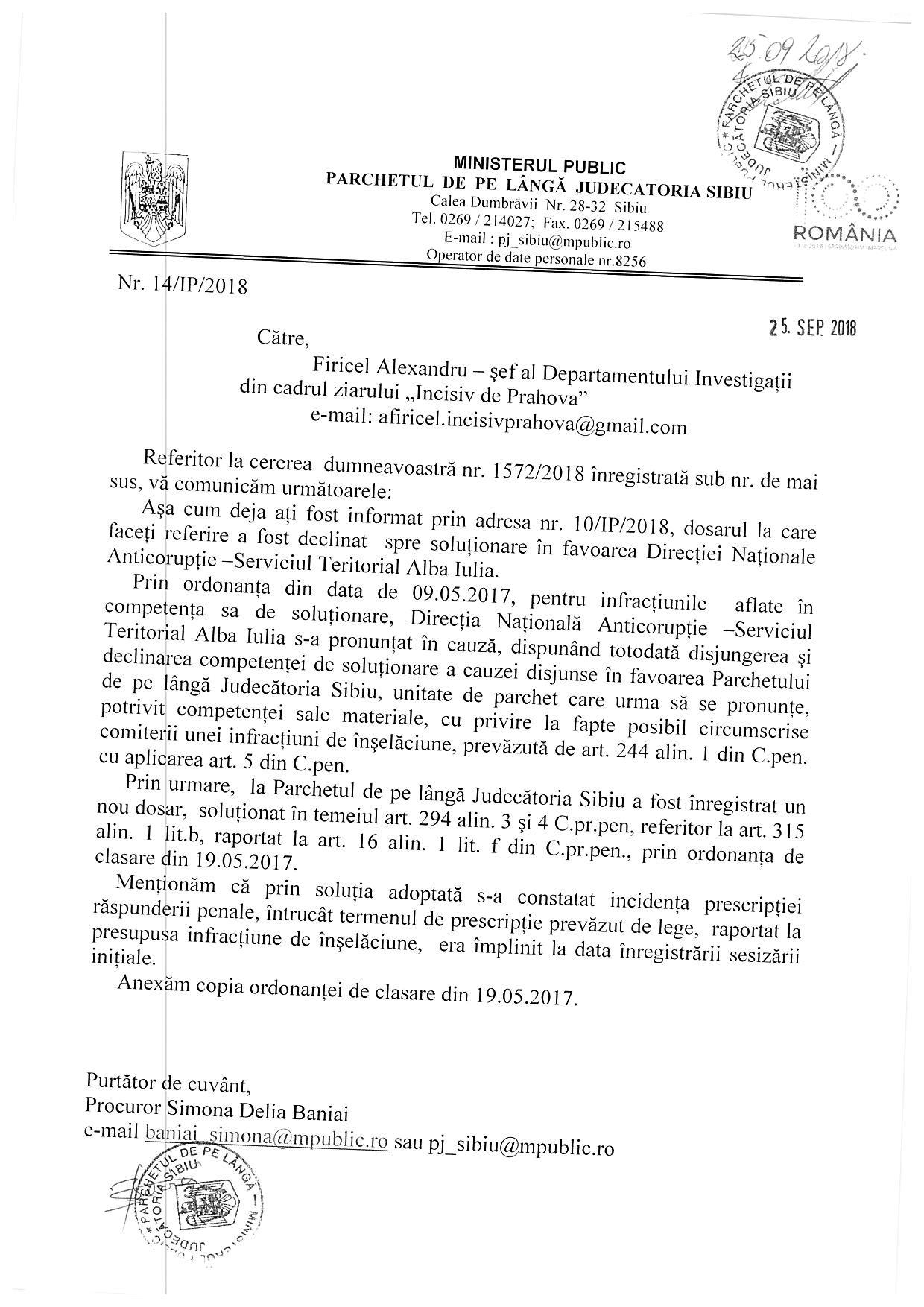 Doamna Bîrsan Anca este o persoană din acest sistem care protejează „pe cine trebuie” și, la rândul ei, este protejată tot de „oameni grei”. După ce s-a constatat că această doamnă „polițistă” a prejudiciat statul român cu 80.000RON pentru sporuri necuveninte, „oamenii sistemului au început să dea din coate” neștiind cum să o salveze pe această doamnă „polițistă”… de birou. Pentru început procurorii, au plimbat dosarul penal între parchete (Parchetul de pe Lângă Judecătoria Sibiu și DNA Alba-Iulia). Abia după ce ziarul incisiv de Prahova a sesizat public că „s-a pierdut dosarul Ancăi Bîrsan”, a fost găsit dosarul penal al Ancăi Bîrsan care, culmea… s-a clasat căci a intervenit „prescripția faptei penale” (depășirea termenului de 5 ani). Deci, procurorul de caz a stabilit că „fapta s-a petrecut în anul 2009” nu a vreut să constate că fapta de înșelăciune este sub formă continuată începând cu anul 2009-data constatării faptei penale (înșelăciune) dar și delapidare (faptă prevăzută de articolul 295 Cod Penal și „omisă”, dealtfel, de „agenții constatatori” dar, mai ales, de procurorul de caz): Articolul 295 Delapidarea(1) Însușirea, folosirea sau traficarea de către un funcționar public, în interesul său ori pentru altul, de bani, valori sau alte bunuri pe care le gestionează sau le administrează se pedepsește cu închisoarea de la 2 la 7 ani și interzicerea exercitării dreptului de a ocupa o funcție publică.(2) Tentativa se pedepsește.