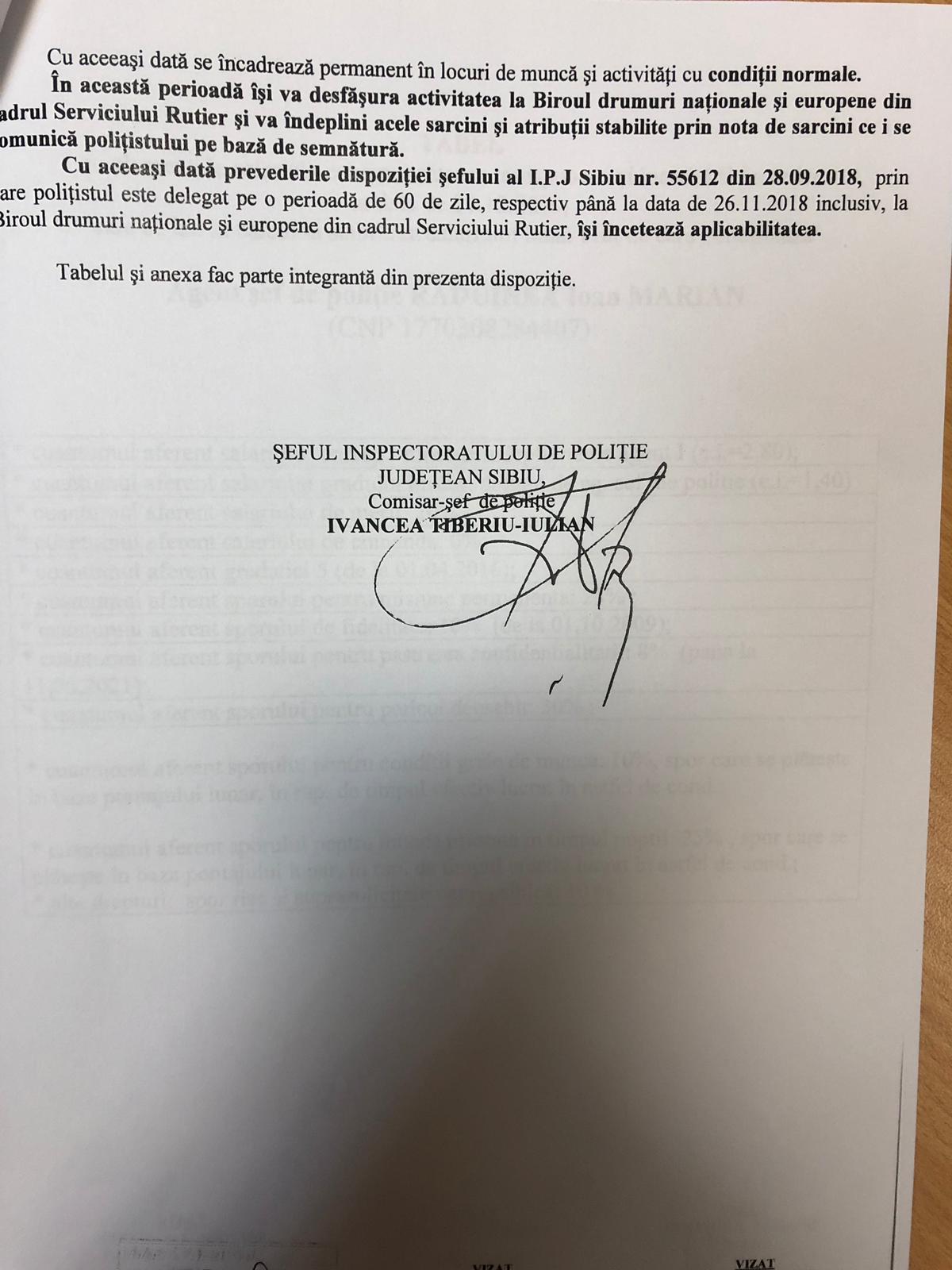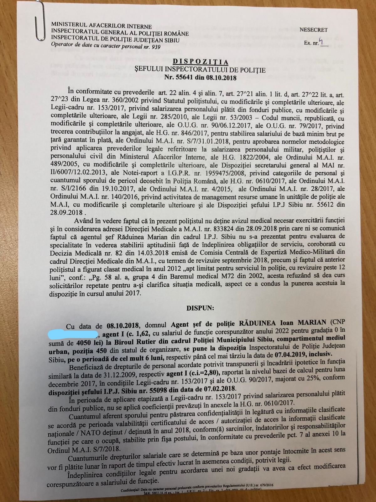 Așa s-a născut dispoziția 55641/08.10.2018 prin care „constată” șeful IPJ Sibiu că polițistul Răduinea e apt limitat și trebuie pus la dispoziție acest „bolând” care are idei și, astfel, se comportă necorespunzător.