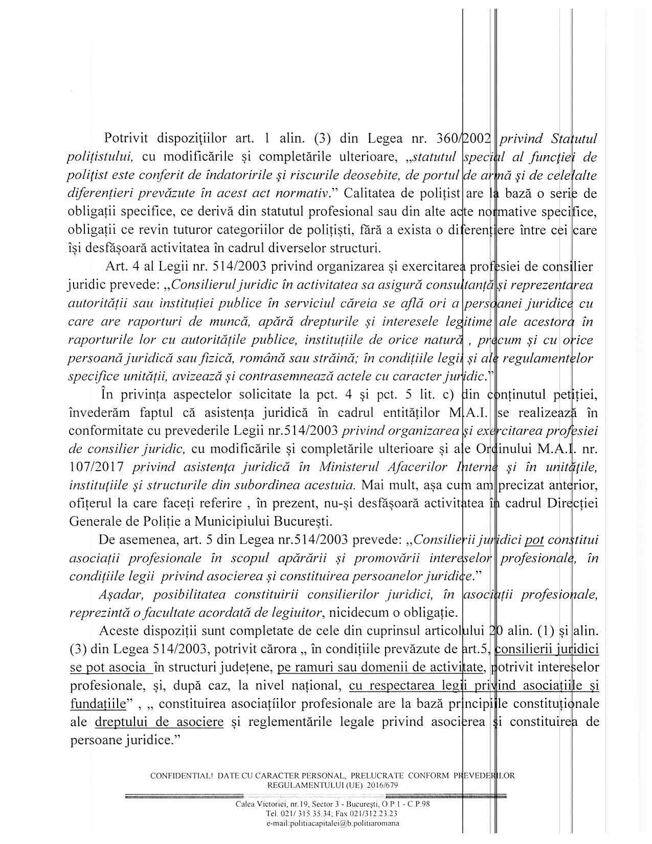 Iar profesia de consilier juridic (apără doar acele interese legitime ale angajatorului, persoană publică sau privată) pe când polițistul apără toți cetățenii și bunrile acestora, instituțiile și autoritățile publice, persoanele de drept privat, Drepturile Fundamentale ale Omului … Se vede „cu ochiul liber” această diferențiere însă, din păcate, nu se dorește să fie aplicată.
