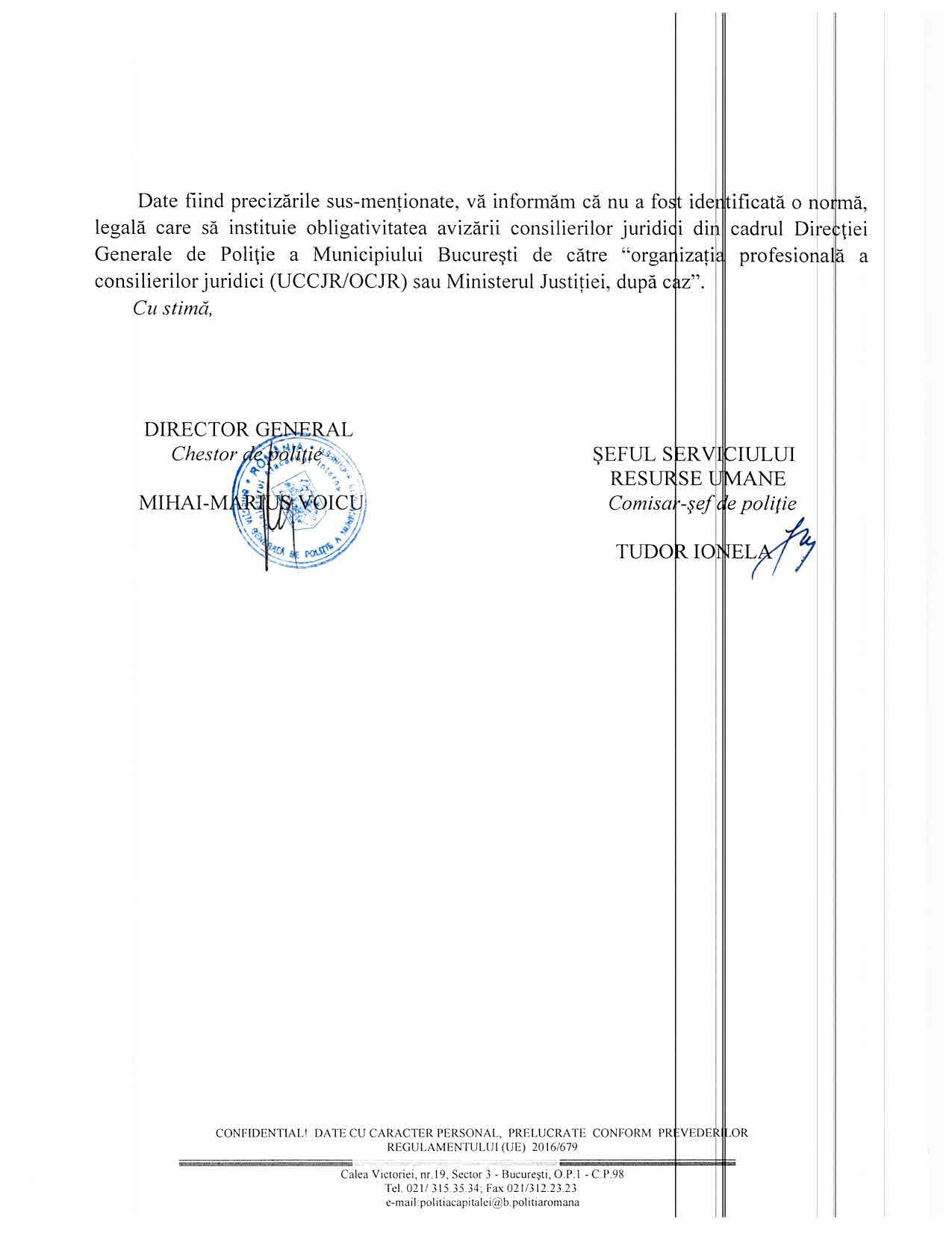 Căci nimic din ce afirmă acești indivizi în adresa nr.771211/02.10.2018, Voicu Marius și Tudor Ionela „nu se pupă” fiindcă atât statutul consilierului juridic publicat cu modificări în Monitorul oficial nr.452/2014 și Legea nr.188/1999 prevede clar: consilierul juridic este funcționar public, cu funcție de execuție nicidecum „șef” și nici „polițist” sau militar”. iar Legea nr.514/2003 prevede clar că și consilierului juridic îi sunt aplicabile prevederile statutului avocatului (Legea nr.51/1995). Suntem convinși că cei doi (Voicu și Tudor) nu au auzit vreodată de articolul 41 teza a IIa a alineatului 1 din Constituție: ART. 41 Munca si protectia sociala a muncii (1) Dreptul la munca nu poate fi ingradit. Alegerea profesiei, a meseriei sau a ocupatiei, precum si a locului de munca este libera.