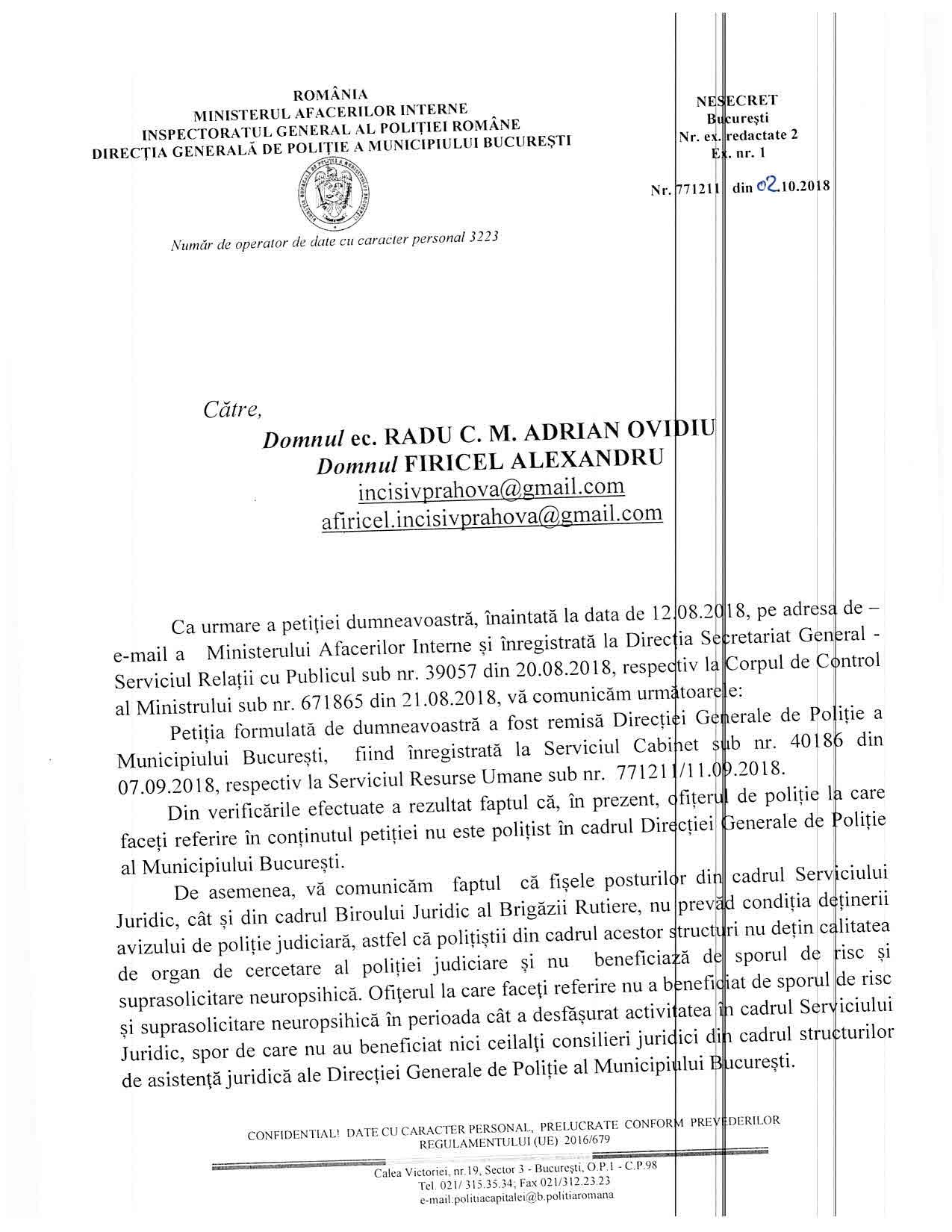 De supărare că i-am deconspiratul „acoperitul” (Donțu Mihai) solicitând public celor avizați, să intre în legalitate, Voicu Marius&co ne spune în adresa nr.771211/02.10.2018 că Donțu Mihai „a dispărut din DGPMB”… i-or fi luat gâtul, așa cum fac mafioții când unul de-ai lor e deconspirat/îi toarnă? Sau l-au „mutat” repede, de frică?