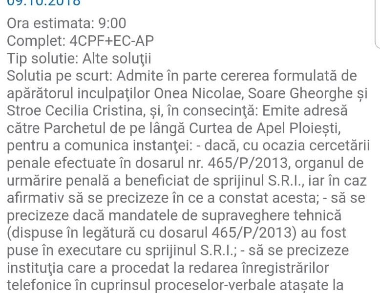 Procedura de cereri şi excepţii din camera preliminară a procesului lui Grigoraş Ioan Dan a fost prezidata initial de judecatorul Dinu Iulian, colaborator SRI şi al procurorului Mircea Negulescu (cunoscut pentru numeroasele sale abuzuri, fiind in prezent exclus din magistratura) -care s-a abţinut în urma sesizării făcute de Grigoraş Ioan Dan la Inspecţia Judiciară, deoarece in calitate de judecator de drepturi si libertati a aprobat interceptarea si inregistrarea convorbirilor telefonice si supravegherea video, audio si/sau prin fotografiere in mediu ambiental a lui Grigoraş Ioan Dan in luna iunie 2016- şi apoi înlocuit de judecătoarea Trandafirescu Zinica, fost ofiter al securitatii cu decizie definitive de politie politica (de noaptea mintii!!!), de asemenea colaborator SRI şi al procurorului Mircea Negulescu. Judecatoarea nu a tinut seama de nici unul din argumentele aduse in memoriul scris la procedura de cereri şi excepţii din camera preliminară a procesului lui Grigoraş Ioan Dan.