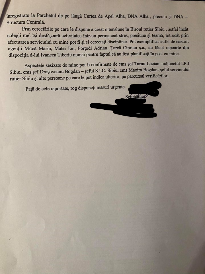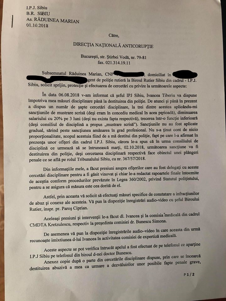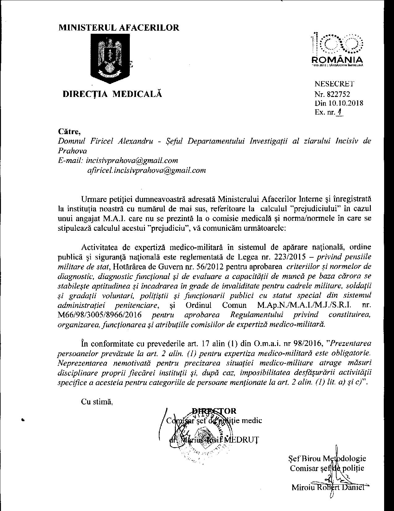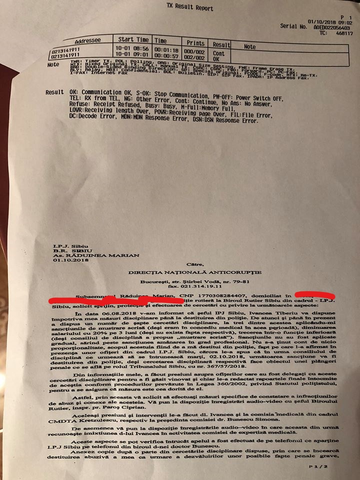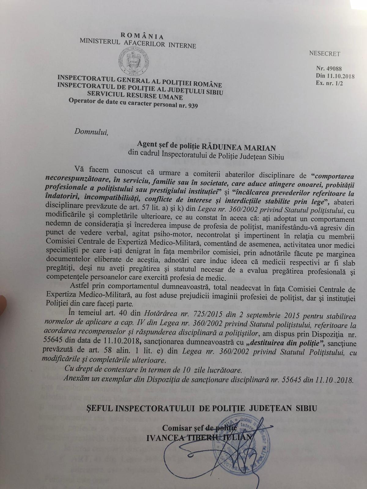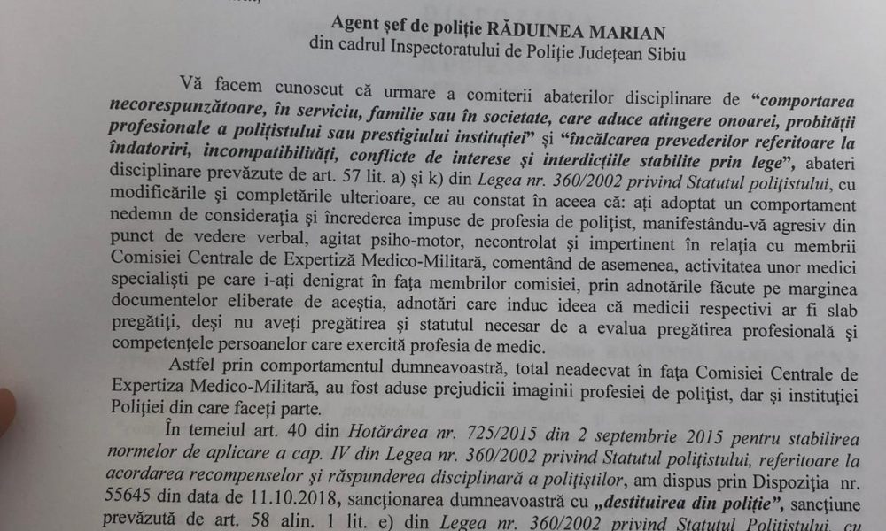 În filmările atașate, reprezentanții comisiei medicale susțin că „a sunat șeful de la Sibiu ca să îl mențină în activitate pe polițistul Răduinea”… cu toate acestea, Răduinea Marian a fost destituit de același șef al IPJ Sibiu conform adresei 49088/11.10.2018. Ce contează că, din 2012-prezent, polițistul Răduinea și-a îndeplinit atribuțiile conform legii și „apt limitat” fiind, indiferent de vicisitudini?