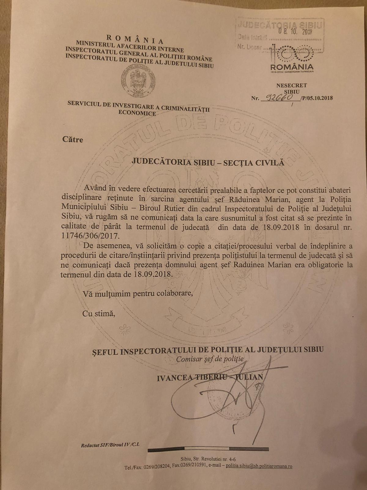De ce? Fiindcă, în primul rând, Răduinea a avut „tupeul” de a veni în fața instanței și a se apăra de acuzațiile șefului IPJ Sibiu, Ivancea Tiberiu în procesul ilegal și imopral intentat de Ivancea lui Răduinea pentur „postările necuviincioase de pe FaceBook” (adresa ilegală a Serviciului de Investigare a Infracțiunilor Economice nr.92660/05.10.2018 semnată de însuși reclamantul și șeful I.P.J. Sibiu, Ivancea Tiberiu prin care solicită, cu nesimțire, instanței să-i comunice dacă „era necesară prezența lui Răduinea în ședința de judecată din 18.09.2018”).