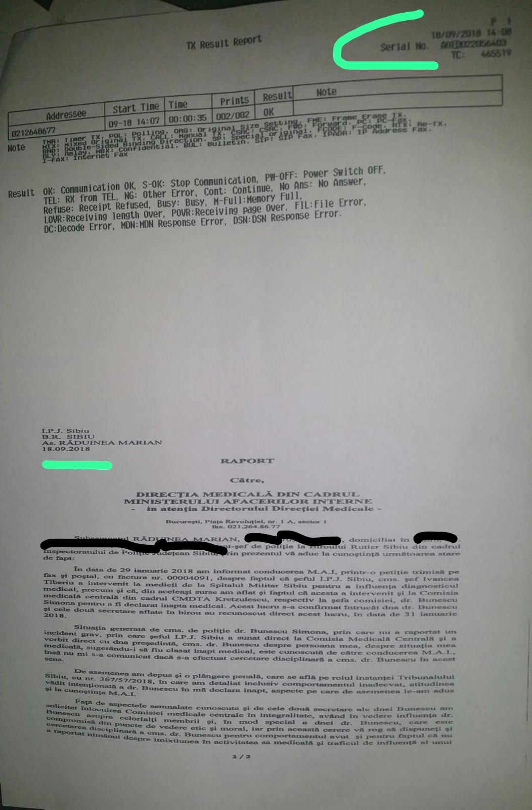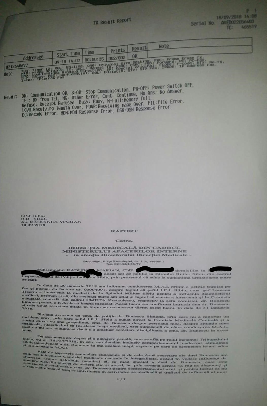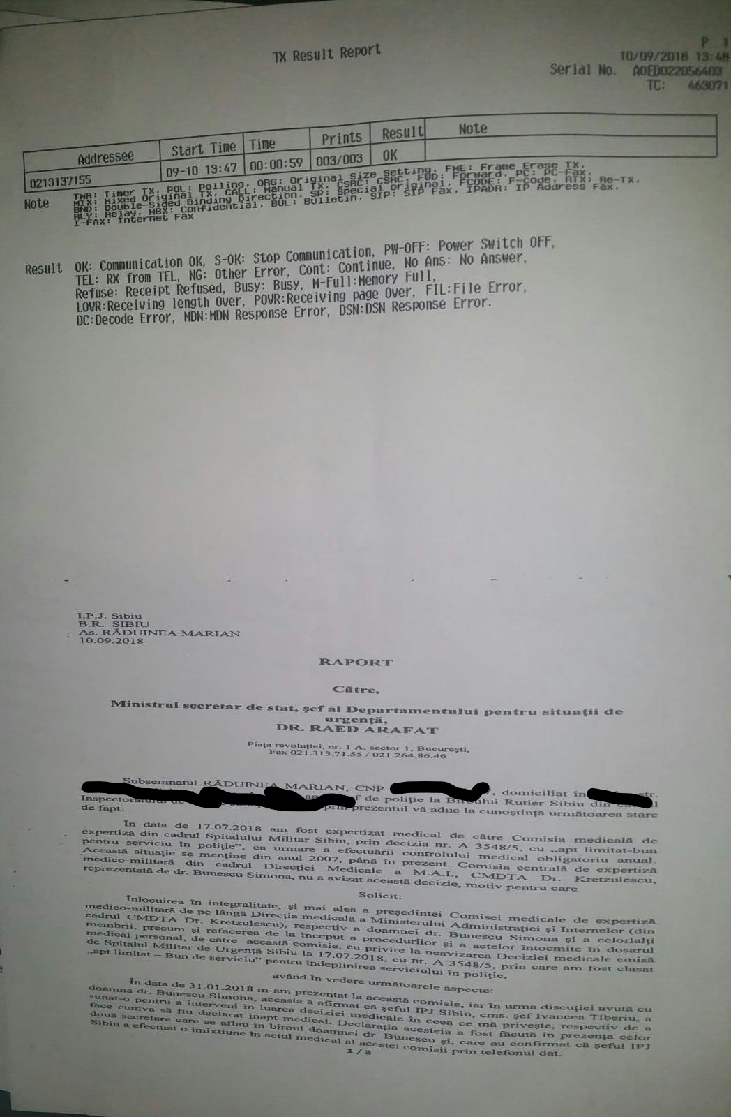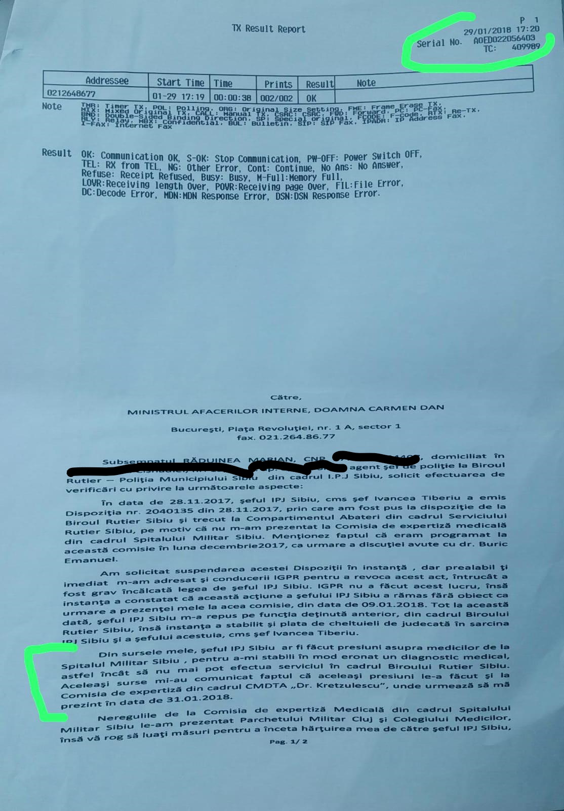 Vă rugăm să observați, domnule inspector general și faptul că agentul de poliție Răduinea Marian a înaintat sesizări și informări atât către Direcția Națională Anticorupție cât și Ministerul Afacerilor Interne cu privire la gravele abuzuri și ilegalități la care este supus de IPJ Sibiu prin multitudinea de cercetări disciplinare dispuse abuziv împotriva acestuia, inclusiv cu privire la ultima cercetare disciplinară, instituții de la care nu a primit răspuns (atașăm fax).
