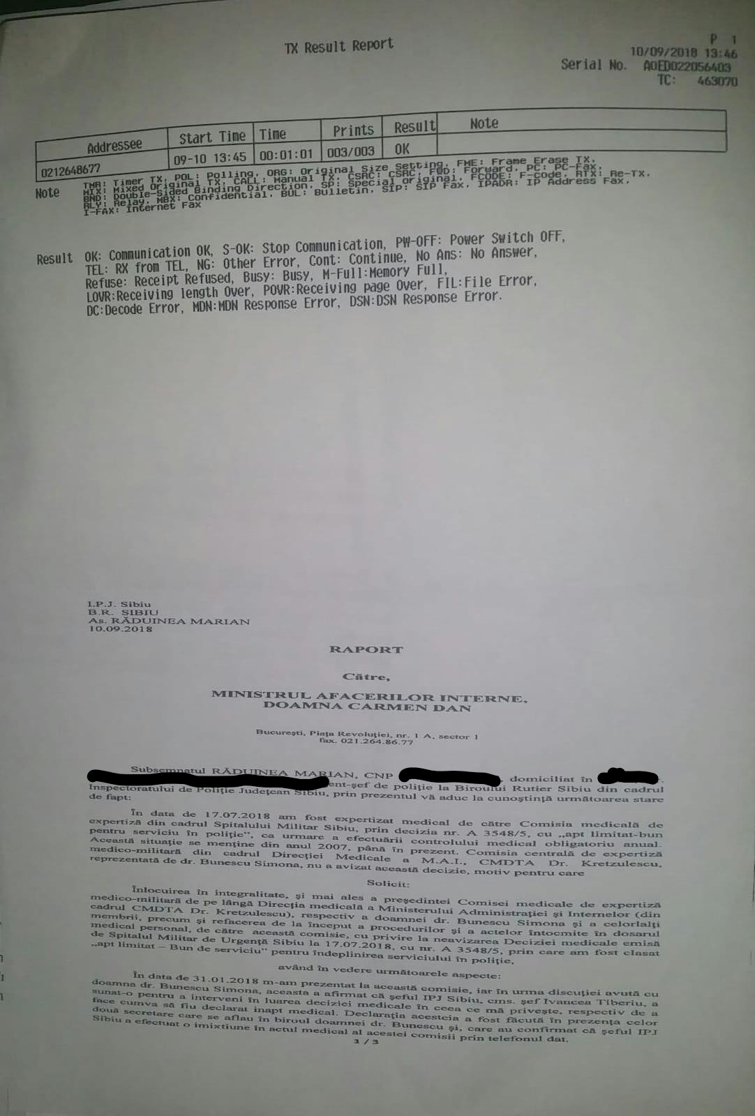 Cu respect vă aducem la cunoștință, doamna ministru că în M.A.I.-I.P.J. Sibiu sunt aproximativ 50 de polițiști care sunt clasificați „apt limitat” și împotriva cărora nu s-a dispus nicio măsură, chiar dacă aceștia nu s-au prezentat la Comisiile Medicale. Așadar, este evident tratamentul discriminatoriu la care a fost supus domnul Răduinea Marian mai ales că, prin adresa nr.53265/31.03.2018 I.P.J. Sibiu a recunoscut faptul că abia în anul 2018 a alocat fonduri pentru îndeplinirea obligației legale a angajatorului de a supune angajații la controale medicale periodice.