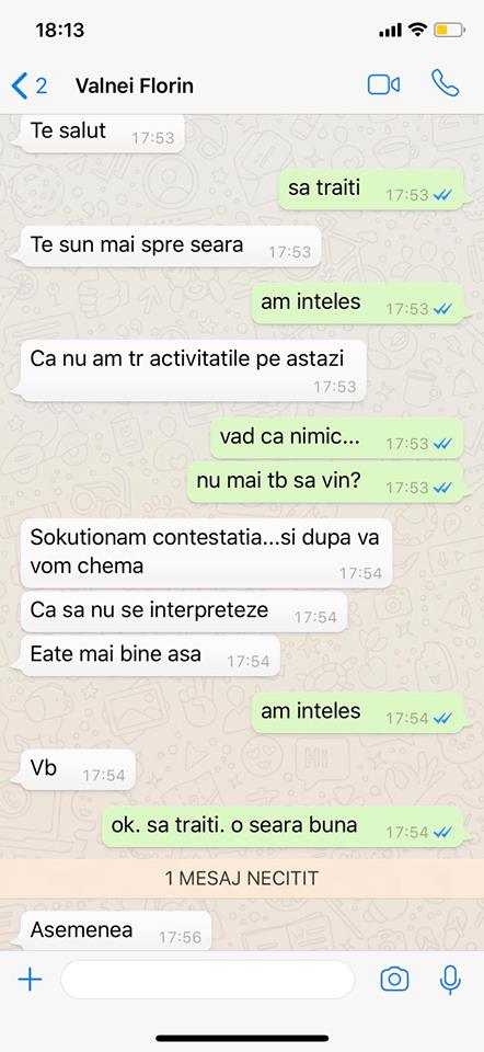 Iar Vâlnei (că d’aia e el „mare sindicalist”) a aplecat capul în fața stăpânirii și, în conversația privată din seara zilei de 16.10.2018 cu Răduinea Marian îi zice că: „Soluționăm contestația și apoi vă chemăm”. Păi cum o „soluționați” măi, sindicalistule Vâlnei? Îl dați afară pe Răduinea Marian și apoi ziceți că: „noi am soluționat cauza. Am făcut tot posibilul în baza Legii. mai mult nu se poate, că nu avem pârghii legale. Dar, instanța va hotărî!” Frumos discurs, nu avem ce să spunem: cel puțin un an de zile de instanță (asta, în cazul în care nu vor fi ridicate excepții de neconstituționalitate care se soluționează în circa 2 ani de Curtea Constituțională a României din cauza volumului enorm de dosare – excepții).