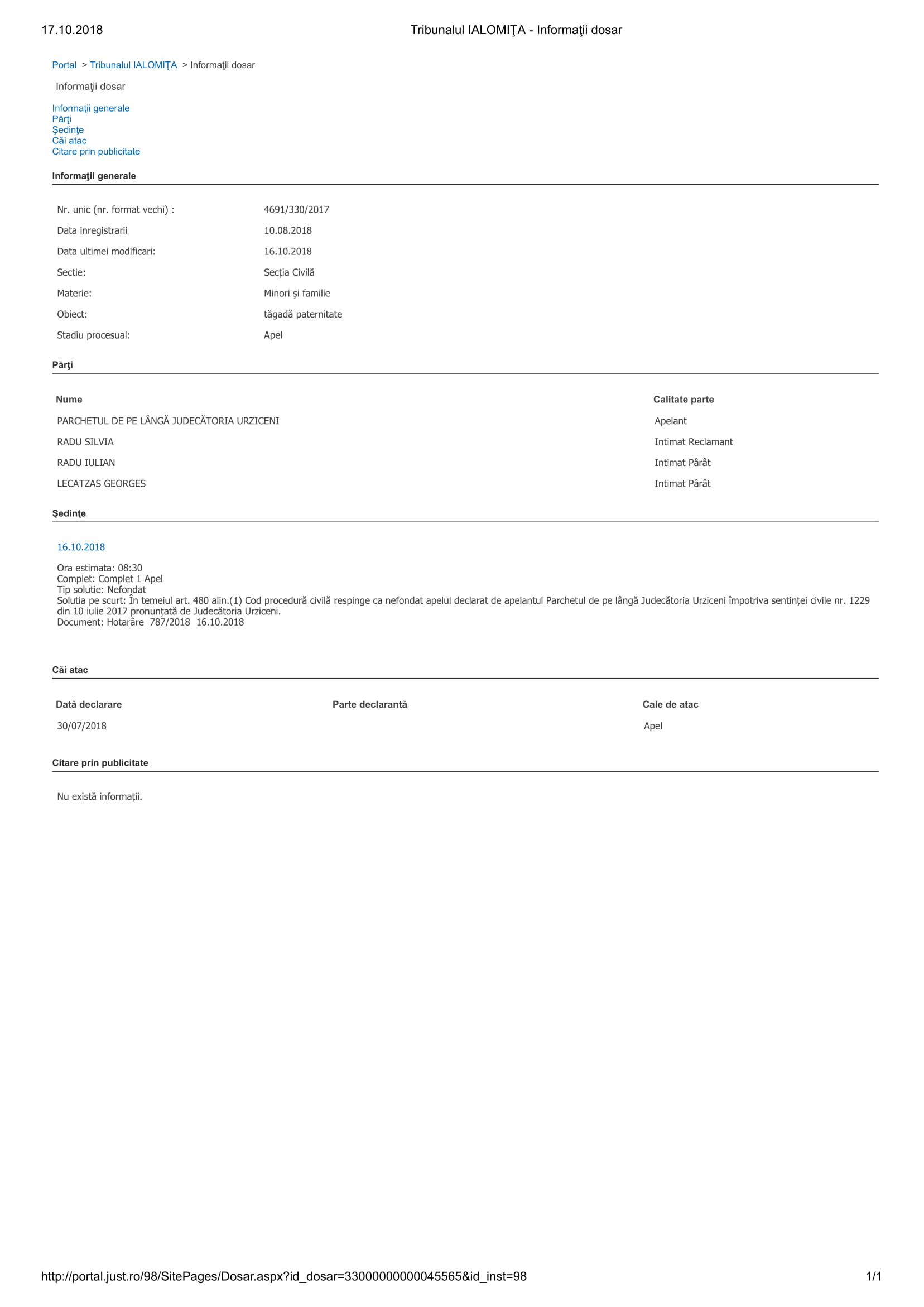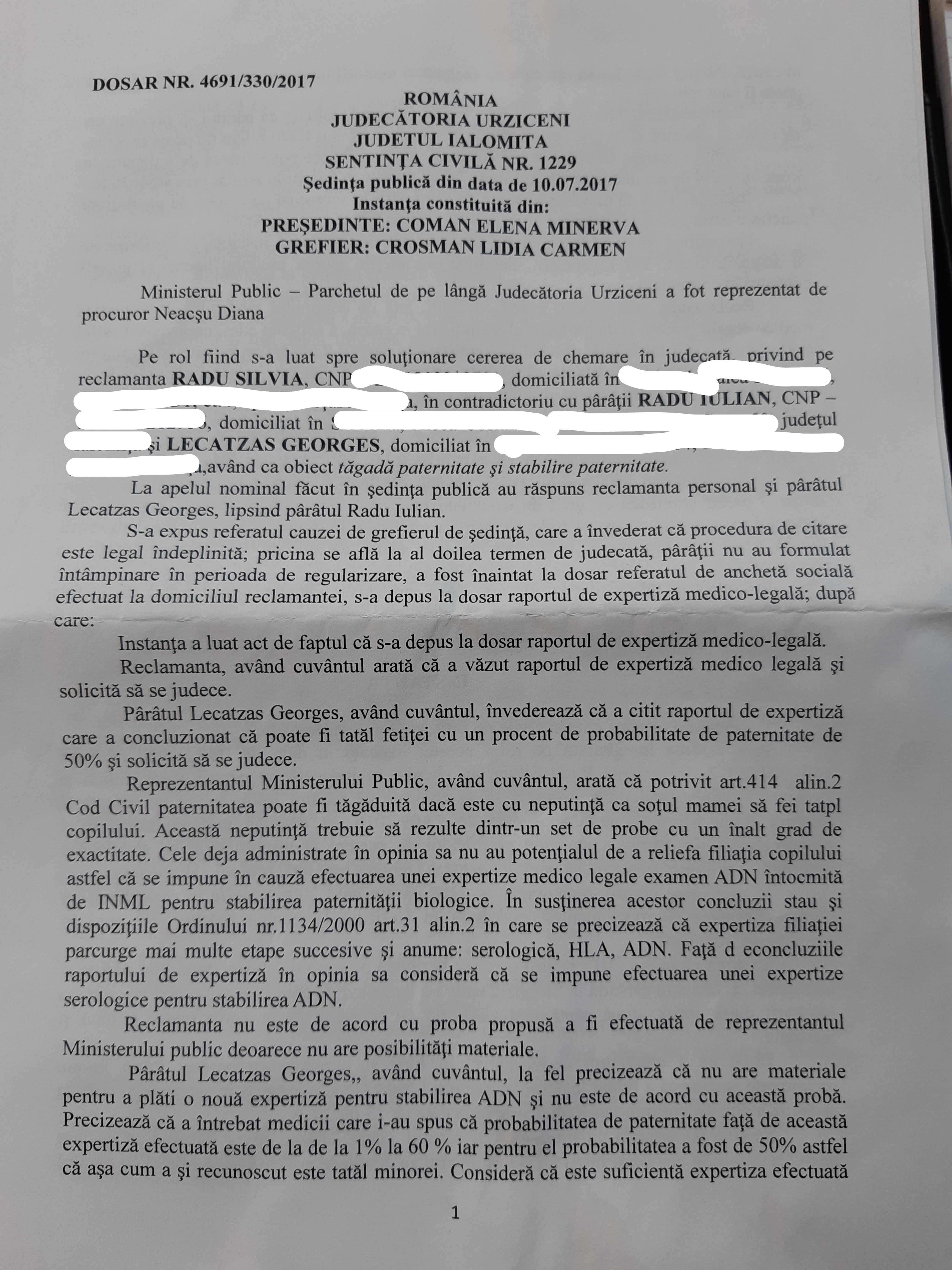 Cazul ialomițeanului Lecatzas Georgesz „a lăsat cu gura căscată” familia specialiștilor și experților în drept: procurorul Andrieș din cadrul parchetului de pe Lângă Judecătoria Urziceni a făcut apel în cauza privind tăgada de paternitatea localnicului Lecatzas Georgesz unde, doamna judecător Coman Elena Minerva a stabilit conform: legii, probelor și martorilor audiați în cauza nr.4691/330/2017 că Lecatzas Georgesz este tatăl minorei. Cu toate acestea, procurorul Andrieș a înaintat cerere de apel deși probele erau indubitabil în favoarea petenților. În cauza de apel judecată de președintele Tribunalului Ialomița, domnul Toma Ion, acesta doar că „nu a dat de pământ” cu procuroarea prezentă în sala de ședință pentru înaintarea unei cereri de apel vădit nefondate în care se invoca inclusiv faptul că Lecatasz Georgesz nu ar fi tatăl minorei Radu Carmen întrucât nu a fost efectuat testul ADN (un test foarte costisitor și care nu ar fi avut relevanță în urma testelor efectuate de Institutul Național de Medicină Legală cu privire la paternitatea lui Lecatsaz Georgesz).