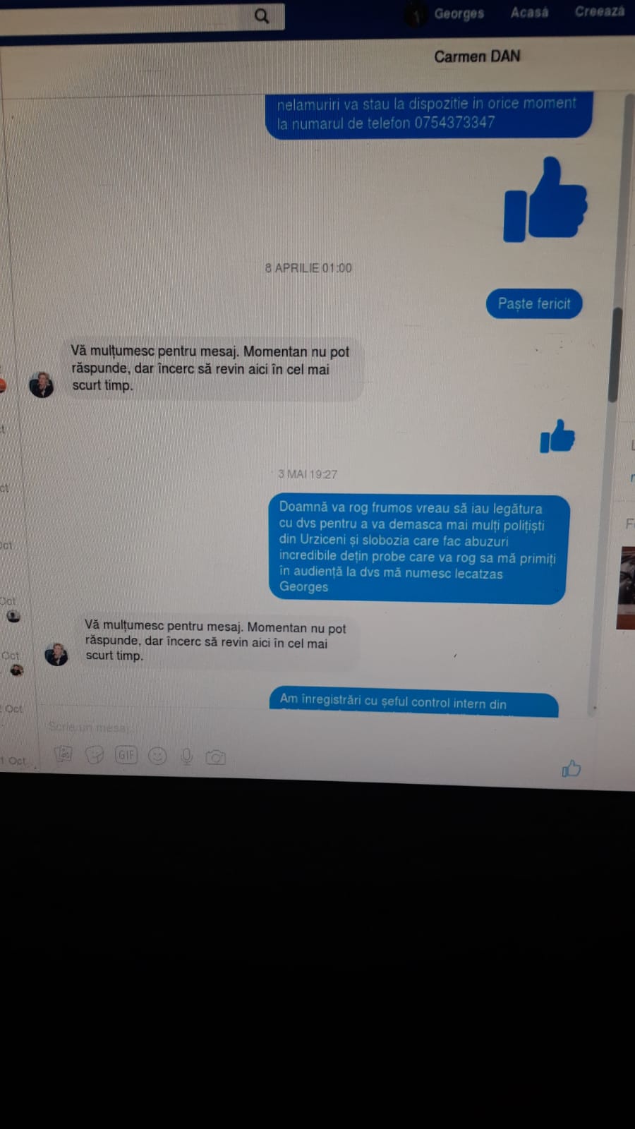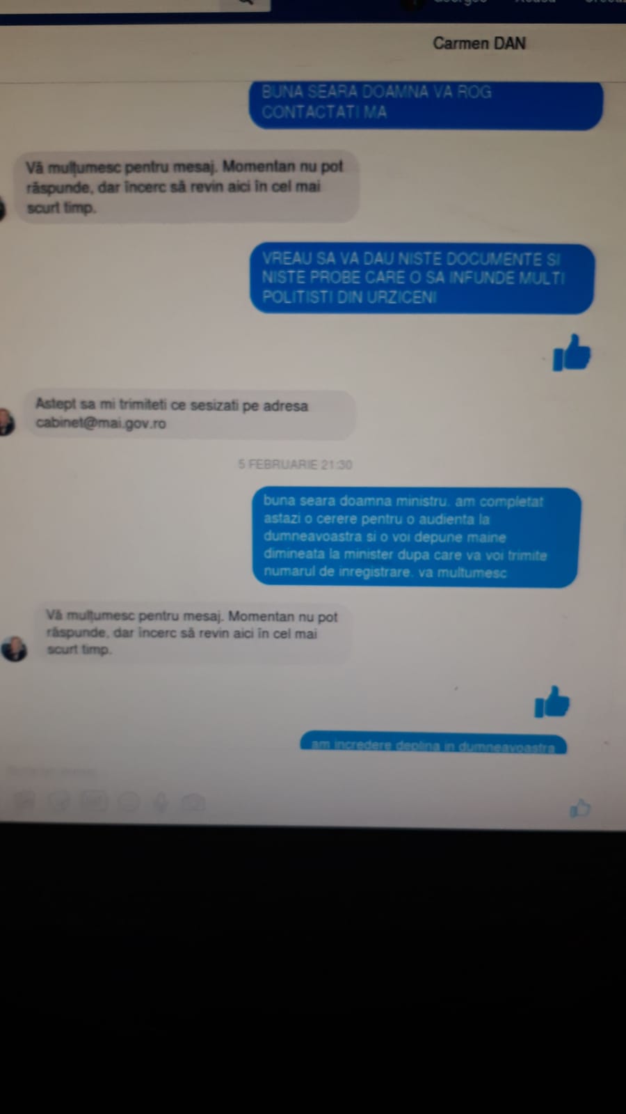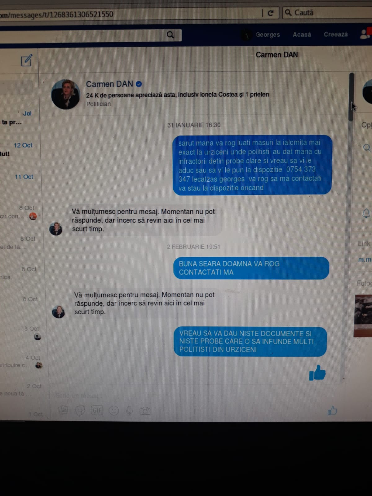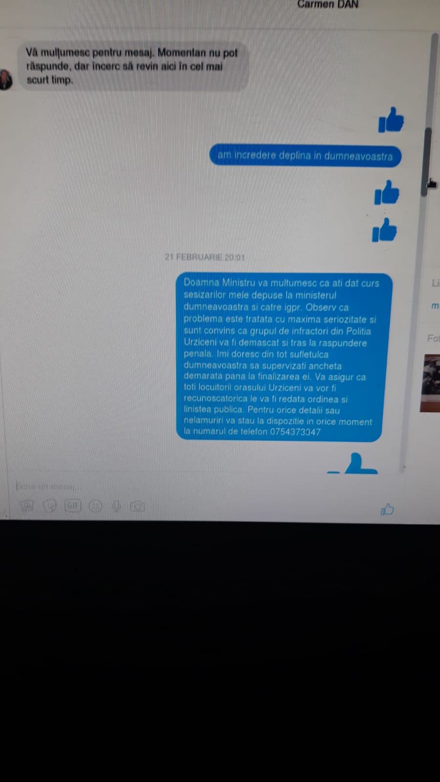 Ministra Internelor, Carmen Dan, a fost sesizată prin rețeaua de comunicații Messenger. I-au fost expuse fapte din Orașul Urziceni de către Lecatasz Georgesz care, ulterior a și avut o întâlnire cu oficiali M.A.I. dar și cu adjunctul I.G.P.R., Dragnea Florian… și atât. Cei din M.A.I. și I.G.P.R. nu sunt interesați de dramele pe care le trăiesc oamenii din județul Ialomița sub dominația interlopilor bugetari și a stăpânilor acestora, interlopii „veridici”. Doar este cunoscut faptul că partidele politice, politica în general este susținută cu bani negrii proveniți din activitățile de crimă organizată: proxenetism, muncă la negru (sclavie), trafic de: droguri, arme, carne vie, organe etc. Chiar și fostul politician „costarican” Elena Udrea a recunoscut aceste aspecte … așa cum a recunoscut public și fostul vicepreședinte PNL, Viorel Cataramă (https://www.revista22.ro/viorel-catarama-partidele-politice-sunt-structuri-mafiote-extrem-de-bine-organizate-80-din-banul-public-se-fura-clasa-politica-trebuie-maturata-democratia-romaneasca-de-fatada-43008.html).