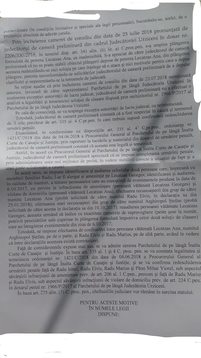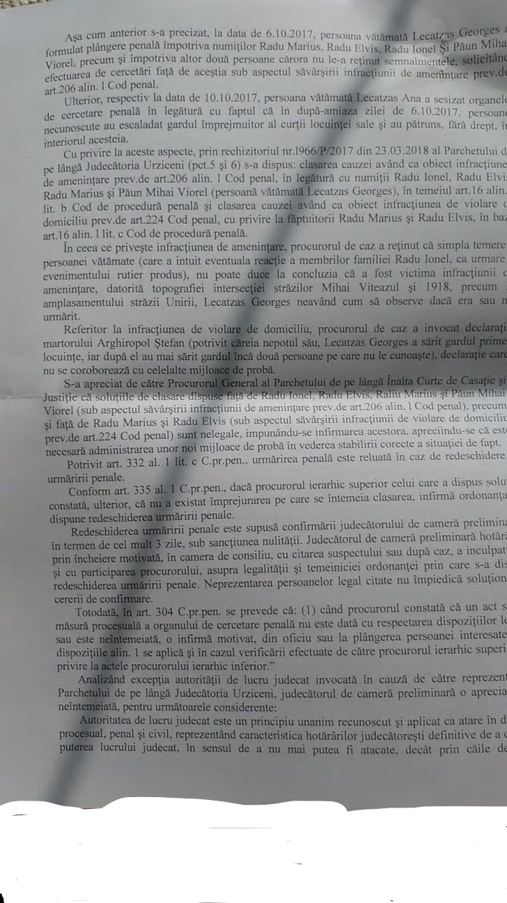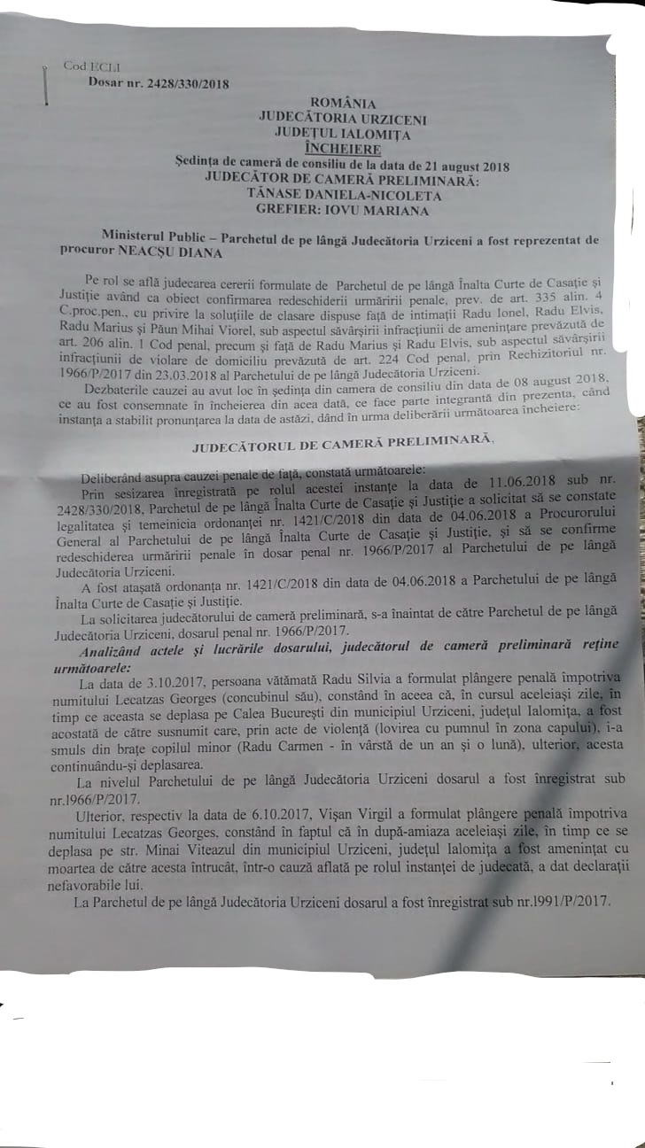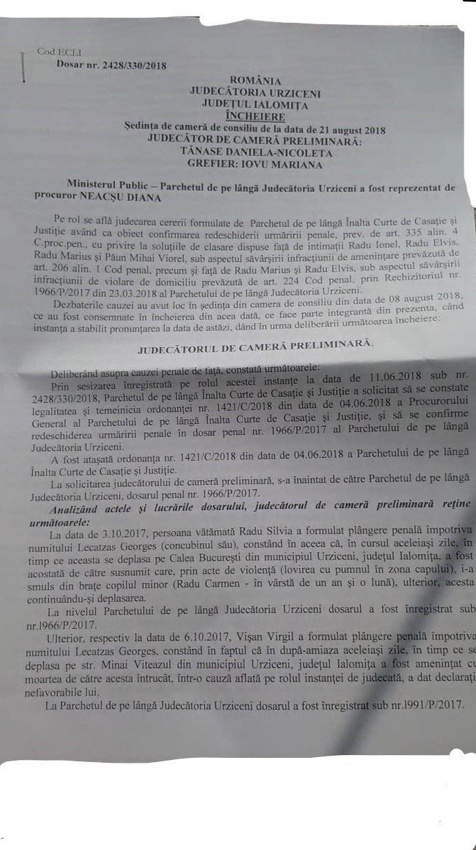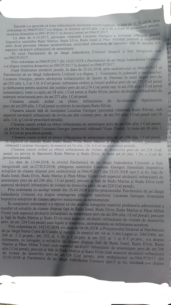 Procurorul General al României a sesizat faptul că indivizii certați cu Legea și bunele moravuri din Orașul Urziceni: Radu Ionel, Radu Elvis, Radu Marius și Păun Mihai Viorel au beneficiat de protecția unor procurori ialomițeni. Prin Ordonanța nr.1421/C/04.06.2018, Procurorul general al României a constatat nelegalitatea soluțiilor de clasare a faptelor de: violare de domiciliu și amenințare, soluții emise de procurori ai Parchetului de pe Lângă Judecătoria Urziceni. Iar instanța de judecată a menținut soluția Procurorului General al României prin încheierea din 21 august 2018 în dosarul nr.2428/330/2018, obligându-i pe protectorii infractorilor, „procurori” să refacă dosarul cauzei și să înceapă urmărirea penală împotriva indivizilor certați cu legea și bunele moravuri.