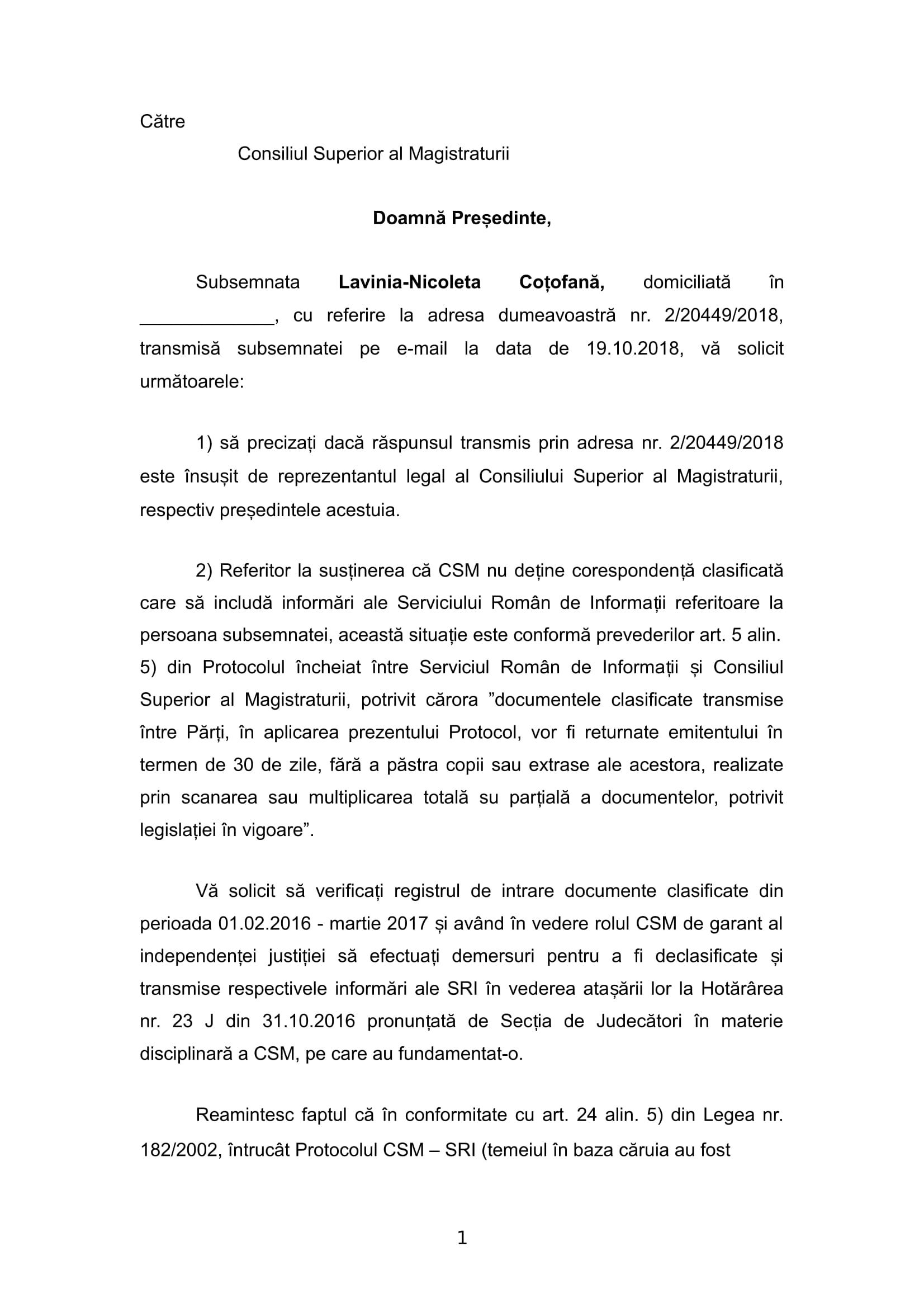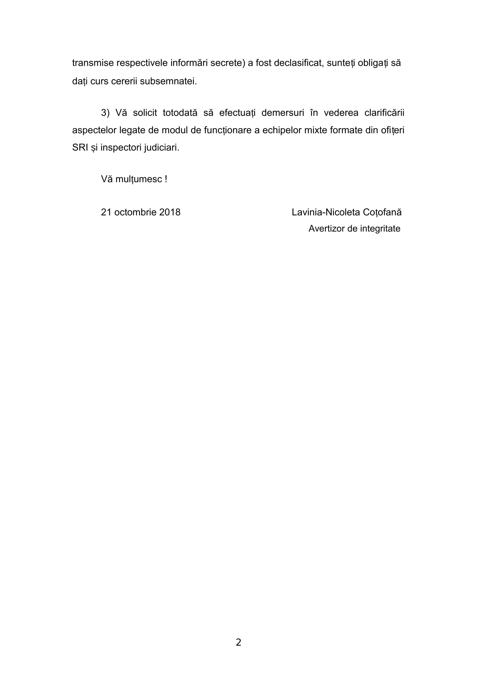 O informație bomba transpare dintr-o cerere a avertizorului de integritate Nicoleta Lavinia Cotofana adresată Consiliului Superior al Magistraturii referitoare la existența unor echipe mixte formate din ofiteri de informatii si inspectori judiciari în baza Protocolului secret încheiat de Inspecție cu SRI. Judecatoare Cotofana, ofițer SRI în rezervă cere clarificarea modului în care au funcționat aceste echipe si a actelor pe care le-au întocmit. Lavinia Cotofana este cunoscută ca fiind o persoană care nu face afirmatii care sa nu se confirme. Astfel încât suntem in prezenta unei adevărate bombe. Sursele noastre spun că inspectorii, în baza Protocolului secret încheiat de Netejoru si Geani cu SRI au facut acte concrete, au solicitat măsuri pe care le-au si prelungit, exact ca in penal. Atasam cererea judecatorului Nicoleta Cotofana. Vom reveni. (Ec Adrian Radu).