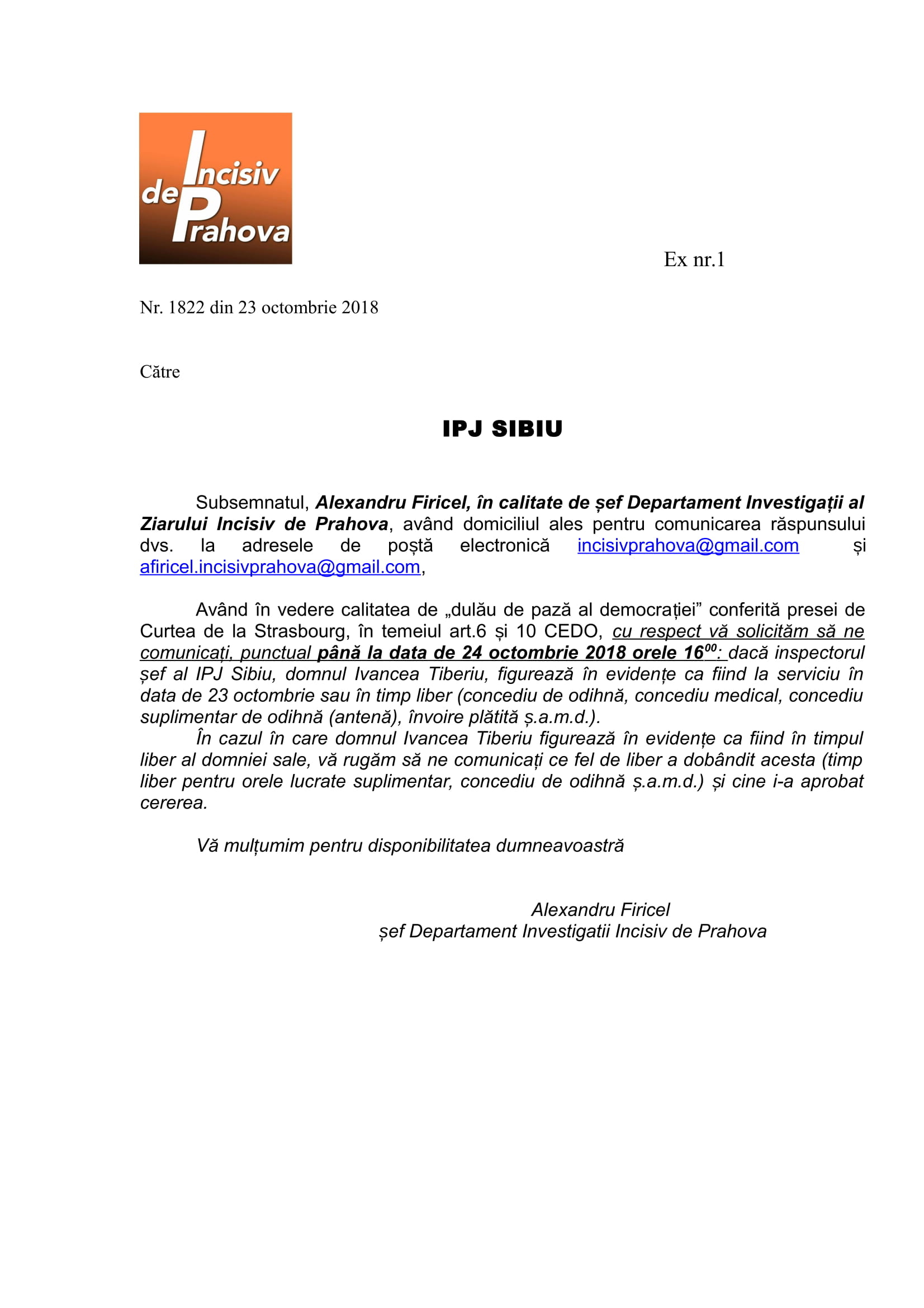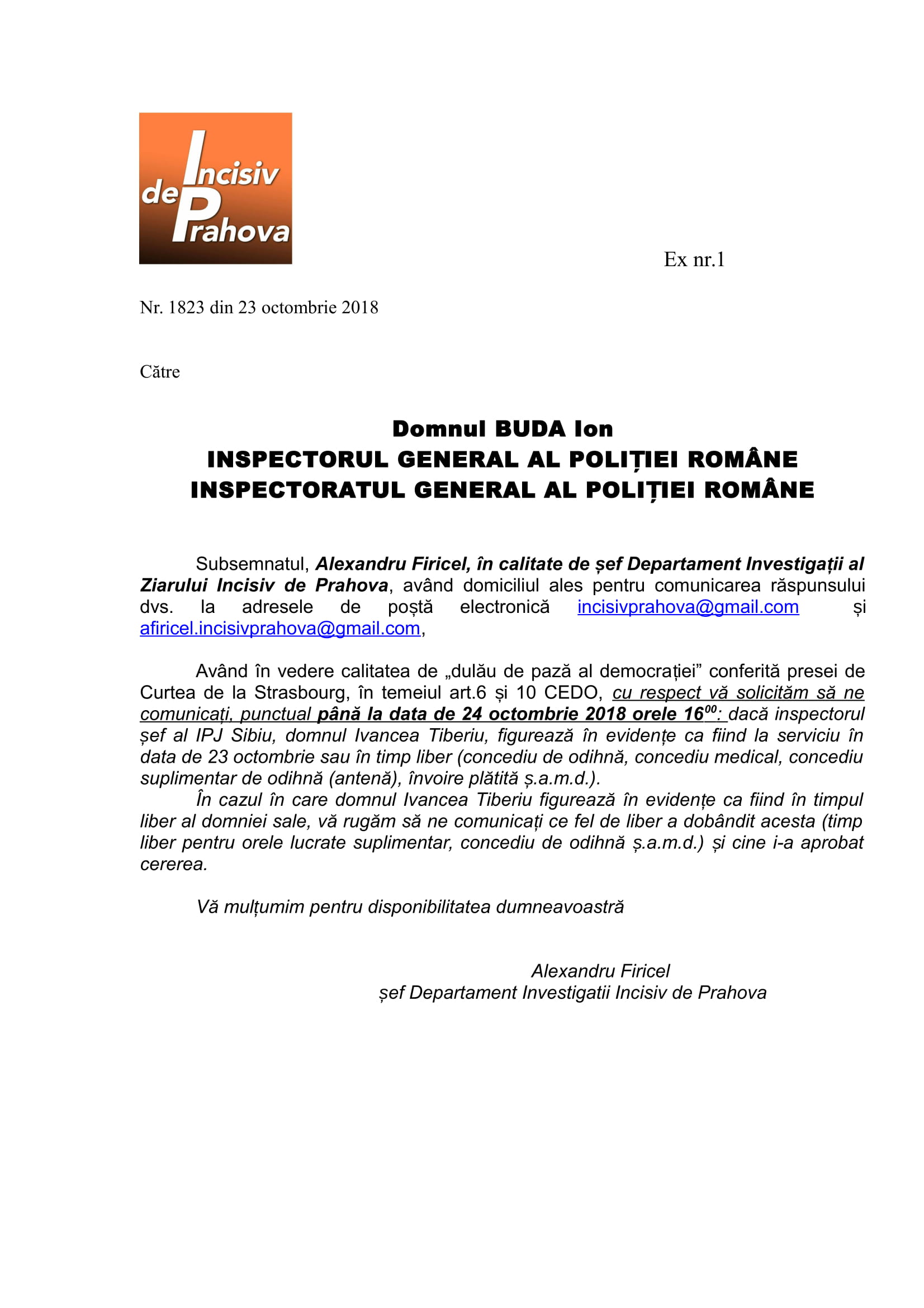 Așa că, am făcut și noi niște solicitări… către IPJ Sibiu și IGPR să ne zică dacă nea’ Ivancea era: liber (dacă da, ce fel de liber) sau figura la locul de muncă… că dacă „pârlitu’ de Răduinea” nu are dreptul să se apere în fața instanțelor de judecată „fiindcă așa vrea nea’ Ivancea”, să știm și noi … și dumneavoastră, cititorii noștri.