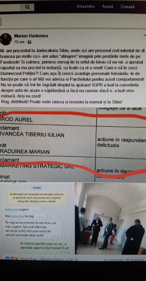 Noi am înțeles că șeful IPJ Sibiu, Ivancea Tiberiu, face tot ce îi stă în putință să arate, și în această cauză, judecătorului că „Răduinea e un mare nenorocit care postează mesaje denigratoare la adresa Luminiii Poliției Române” însă, pe tărâmul instanțelor de judecată, „mahării cu epoleți” nu mai sunt la ei acasă… mai ales că judecătorii nu învață și aplică același „drept” din M.A.I.: „bă! tu să faci ce vor mușchii mei că aicia io mi’s tartoru’, nimeni altcineva!”