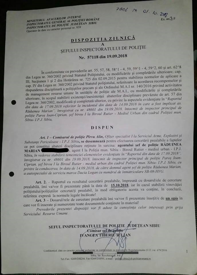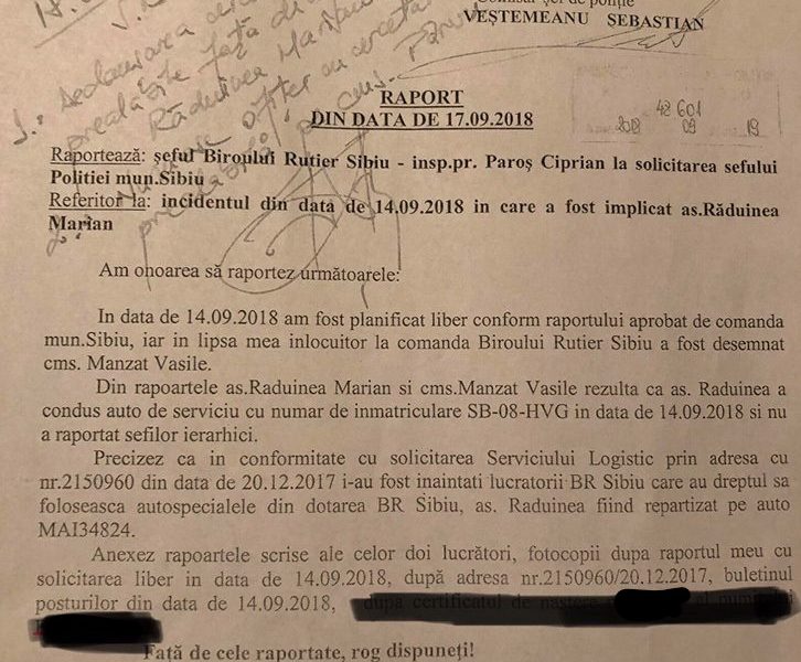 „Neisprăvitul” Răduinea și-a permis (auzi și tu neobrăzare la el!) să ia o mașină de serviciu, în timpul de lucru, pentru a-și îndeplini atribuțiile din fișa postului și nu i-a zis lui „șefuțu” Paroș căruia-i tremură izmenele când aude cuvântul „Ivancea”… că „șefuțu” era în concediu în acea zi (14.09.2018)… și alt șef nu mai era pe acolo. pentru că „nu cunoaște Legea”, polițistul Răduinea Marian și-a anunțat deplasarea în interesul serviciului, dispecerului (ofițerul de serviciu) pentru ca în caz de un eveniment neprevăzut să se cunoască motivul și locația unde se deplasează Marian Răduinea. De ce nu l-a sunat pe șeful IPJ Sibiu, domnul Ivancea Tiberiu? sau pe domnul Buda Ioan, șeful Poliției Române? Sau, de ce nu, pe doamna ministru Carmen Dan? „Nenea șefu’/tanti ministra, îmi dați voie să iau mașinuța de serviciu să mă „plimb” pentru rezolvarea unei probleme de serviciu? Promit că merg la păcănele și la cârciumă înainte, să beau bine și să trag ceva pe nas ca să am curaj să conduc titiul M.A.I.”