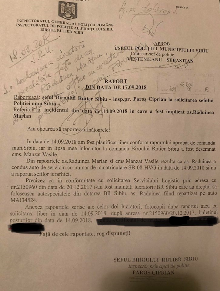 În aceasta „cercetare” apare un raport al sefului adjunctului IPJ Sibiu, cms sef Catalin Nicolescu, care declara ca l-a vazut pe agentul Răduinea in aceeasi zi, la aceeasi ora, in localitatea Cisnădie, acționând cu acelasi autoturism pe care este montat aparatul radar. Culmea e că acest agent a „gresit” data… agentul Raduinea fiind in Cisnădie, dar cu o zi înainte de aceasta intâmplare. Cum a ajuns acel sofer al adjunctului sa facă raport, e un mister… Probabil la presiunile sefului său, ținând cont de faptul ca dl Nicolescu este împuternicit pe funcția de adjunct al IPJ Sibiu, nu ocupa functia prin examen, iar aceasta împuternicire se prelungește (sau nu, depinde cât de bine prestează) doar de catre „Dumnezeul Sibiului”, Ivancea Tiberiu.