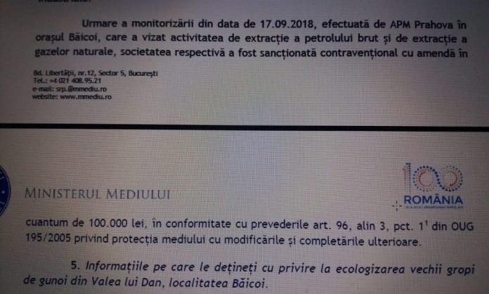 Iar Ministerul Mediului ne comunică prin adresa nr. 44671 /MD/15.10.2018 că: Urmare a monitorizării din data de 17.09.2018, efectuată de APM Prahova în orașul Băicoi, care a vizat activitatea de extracție a petrolului brut și de extracție a gazelor naturale, societatea respectivă a fost sancționată contravențional cu amendă în cuantum de 100.000 lei, în conformitate cu prevederile art. 96, alin 3, pct. 11 din OUG 195/2005 privind protecția mediului cu modificările și completările ulterioare (1. obligația persoanelor fizice de a funcționa cu respectarea prevederilor autorizației de mediu și a persoanelor juridice de a funcționa cu respectarea prevederilor autorizației/autorizației integrate de mediu pentru activitățile care fac obiectul procedurilor de reglementare din punct de vedere al protecției mediului).