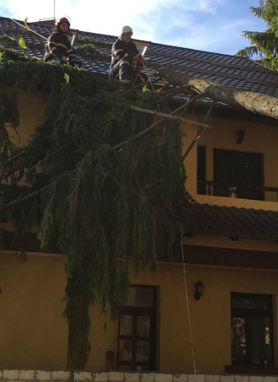 Pericol deasupra unei case din Sinaia. Afla de ce au intervenit pompierii de la ISU Prahova, înarmați cu fierăstraie și scări.