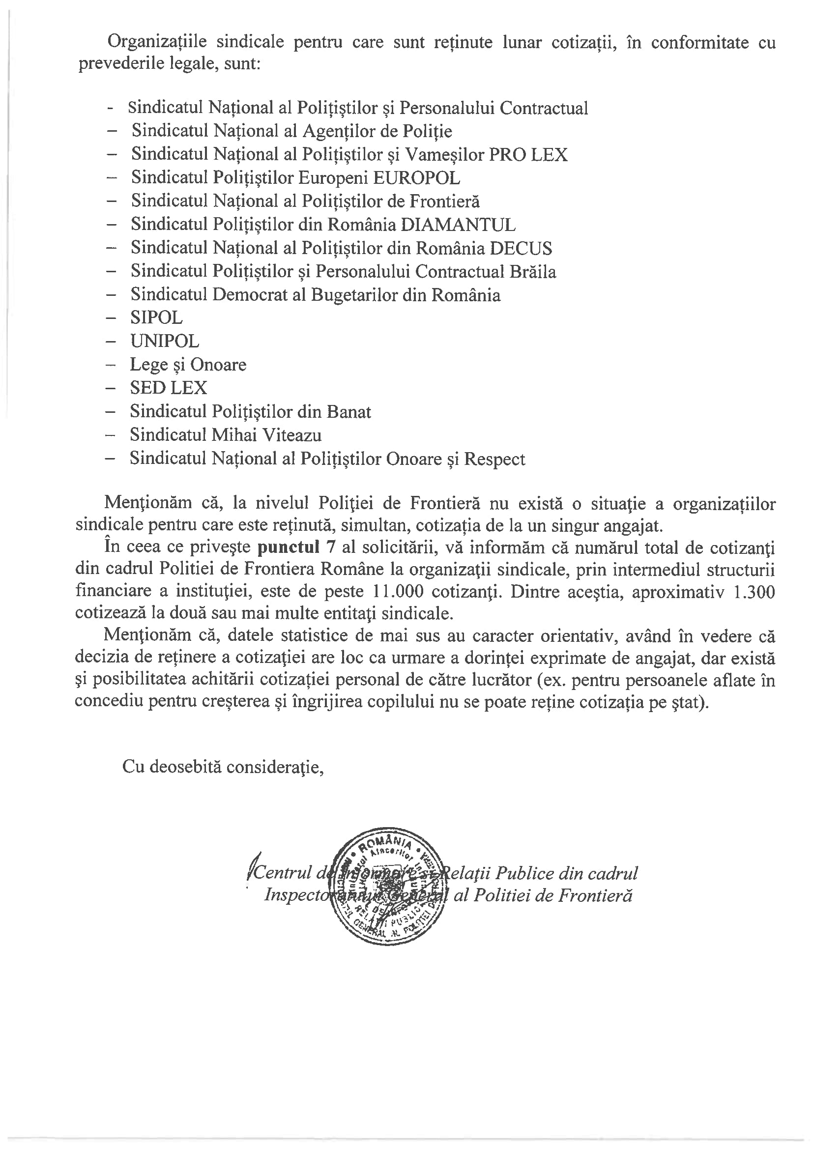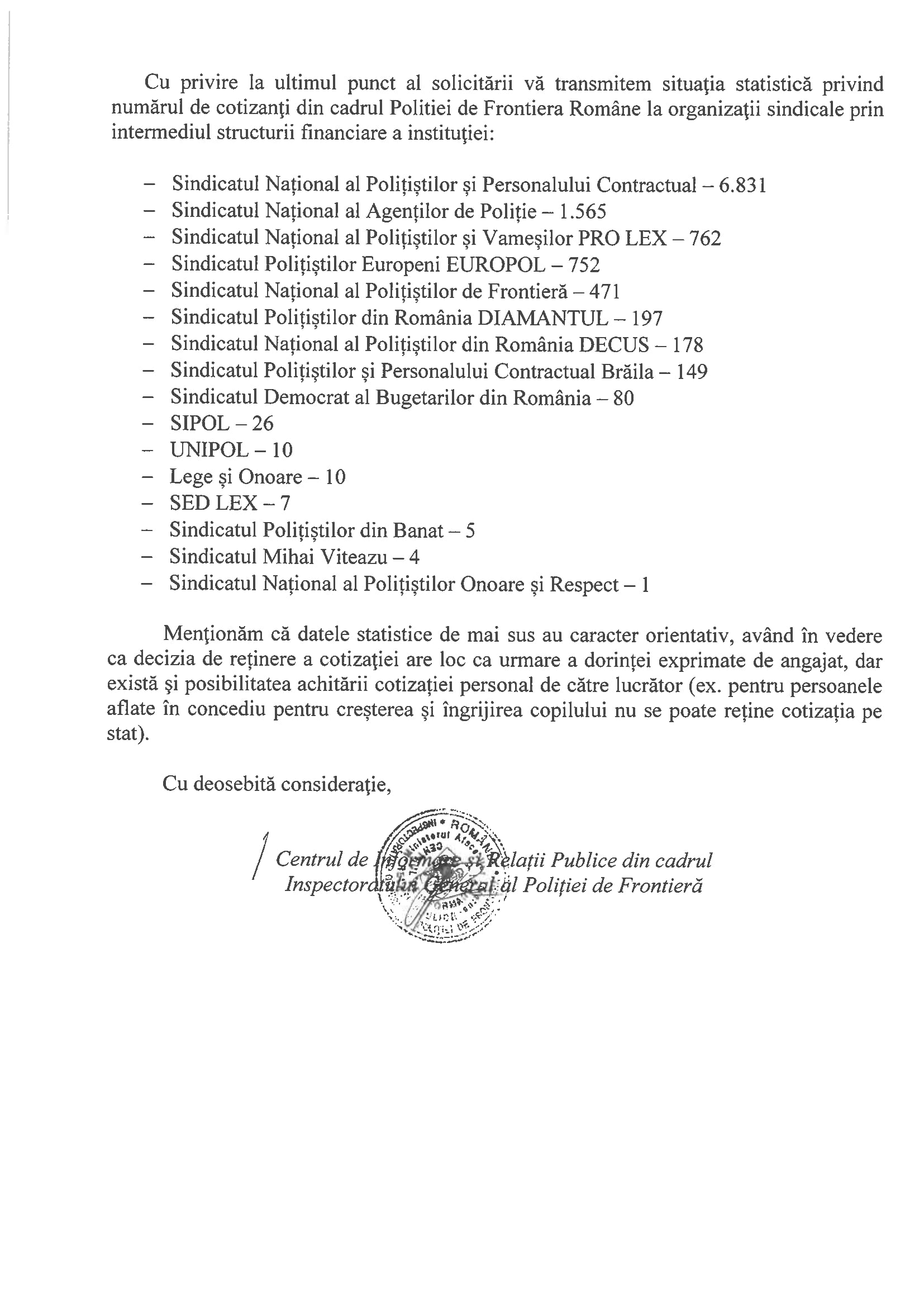 Așadar, Poliția de Frontieră Română are ca și angajați: 13.500 polițiști de frontieră și 920 personal contractual, adică un total de 14.420 angajați. Doar Sindicatul Național al Polițiștilor și personalului Contractual deține un număr impresionant de membrii: 6.831. Din cei 14.420 angajați (dacă am considera că fiecare angajat al Poliției de Frontieră Române ar fi membru într-un singur sindicat – cea ce ar fi eronat), 11.038 sunt membrii în sindicate, ceilalți 3.382 de angajați nefiind înscriși în vreo organizație sindicală.