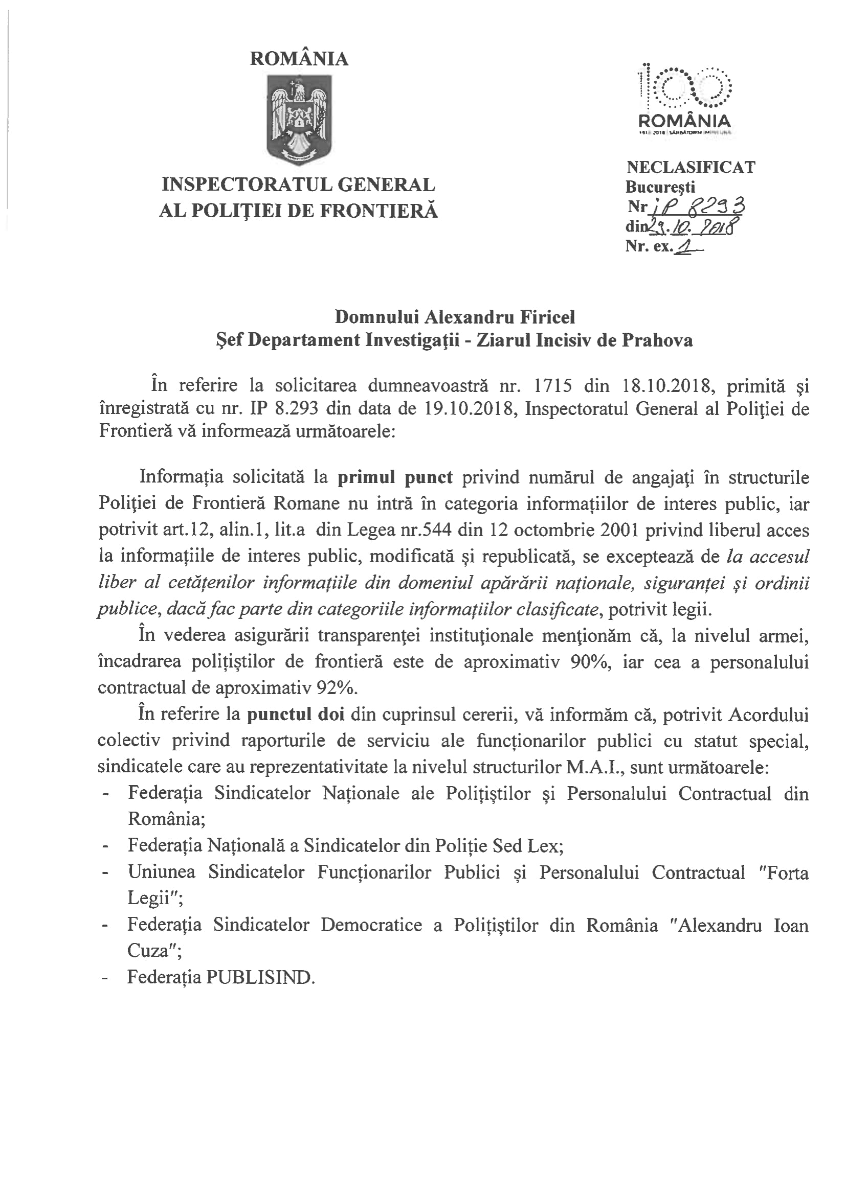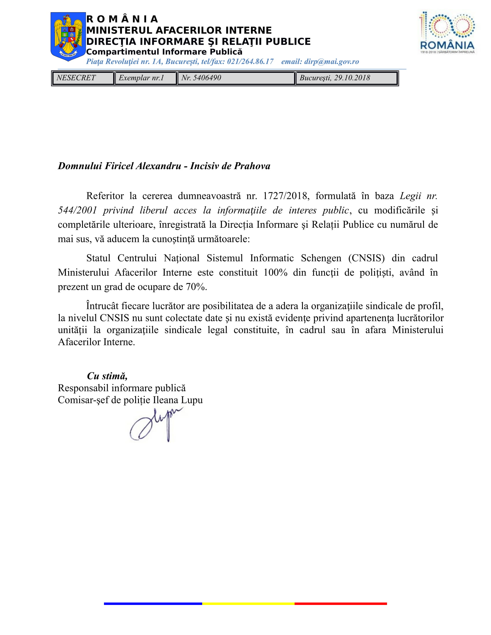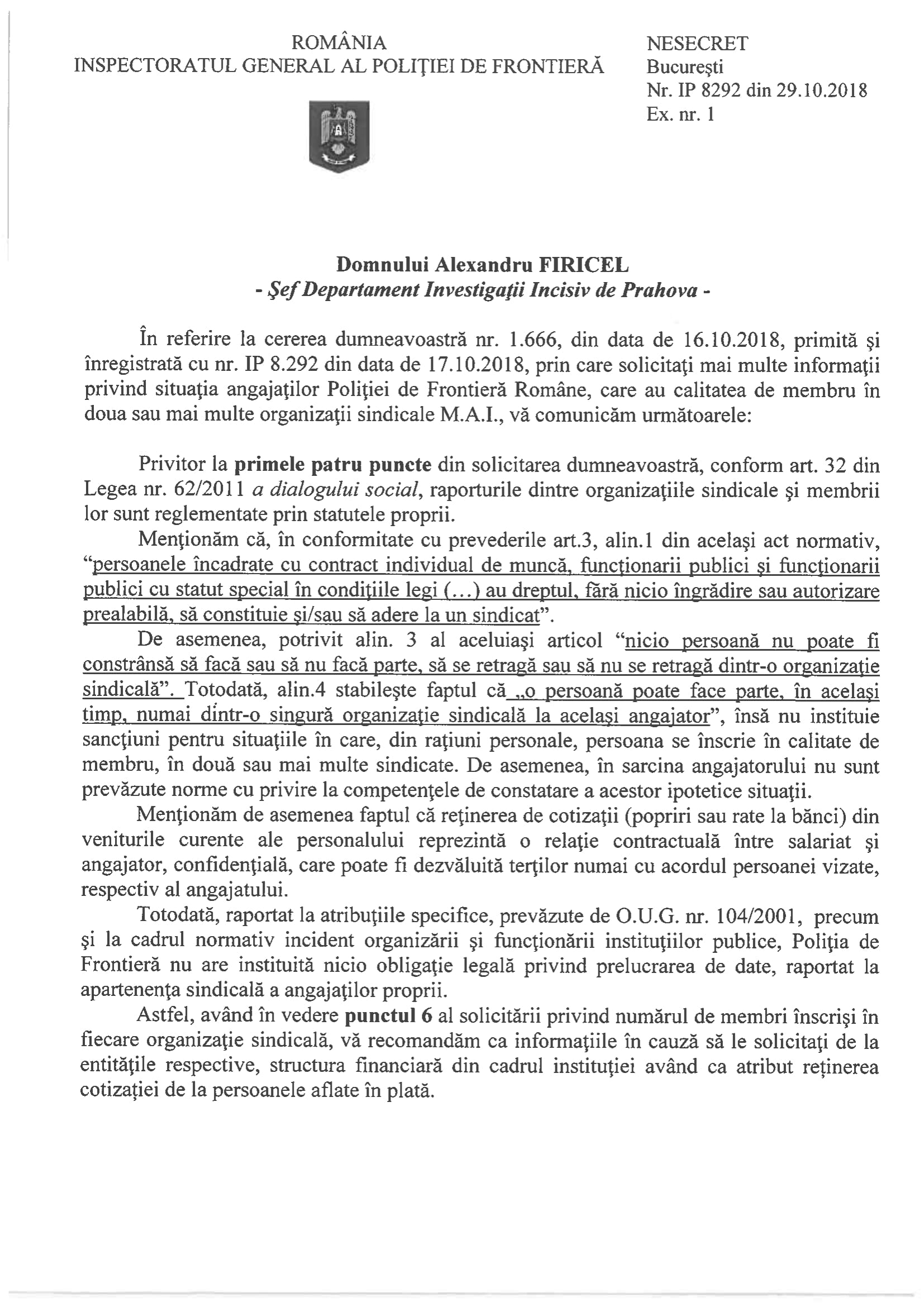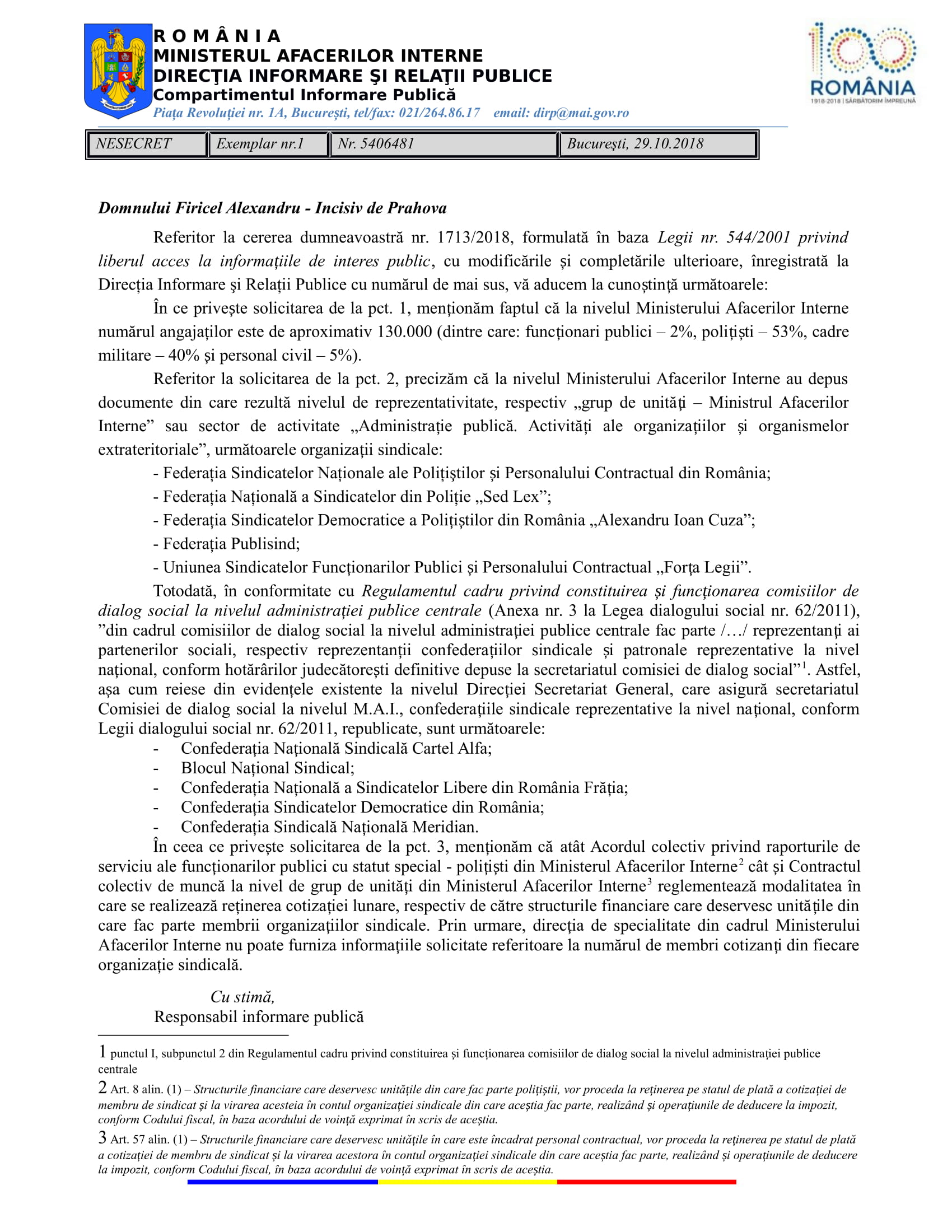 O recunoaște M.A.I. -ul prin adresa nr. 5406490/29.10.2018 prin care refuză să ne comunice câți angajați sunt în Centrul Național SIS și câți membri sunt în sindicate (dintre angajații CNSIS), sperând aceștia că Ministerul Public și Instanțele de judecată vor fi, în continuare, mințite cu înscrisuri emise în fals, cuprinzînd date nereale despre falsa reprezentare sindicală din M.A.I., iar „oamenii sistemului” vor rămâne, în continuare, „la butoane”.