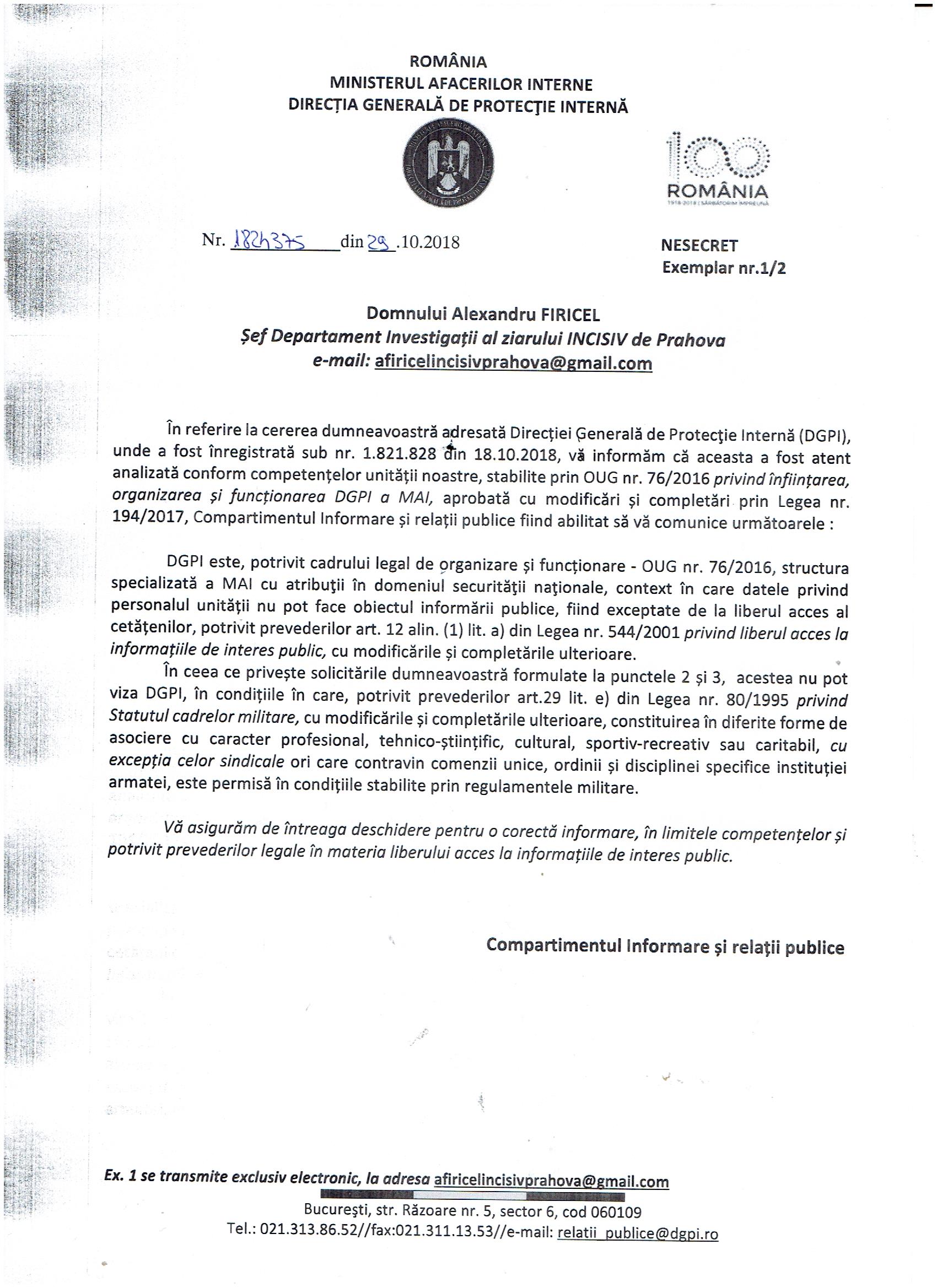 Direcția Generală de Protecție Internă M.A.I. susține că „e atât de secretă”, încât nu ne poate furniza date despre numărul de angajați și aderarea lor la sindicate… că sunt militari. Adică, la DGPI, femeia de serviciu e militar… doar culege informații cu mătura… ca și popii-militari din M.A.I. ce se doreau a fi racolați de DGA – dacă nu au și fost racolați – (după ce ieșea de sub sutana popii, angajatul M.A.I. trebuia să fie turnat la DGA în baza „sfintei spovedanii” … exact ca pe timpul comuniștilor)… aha!