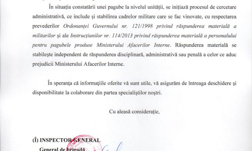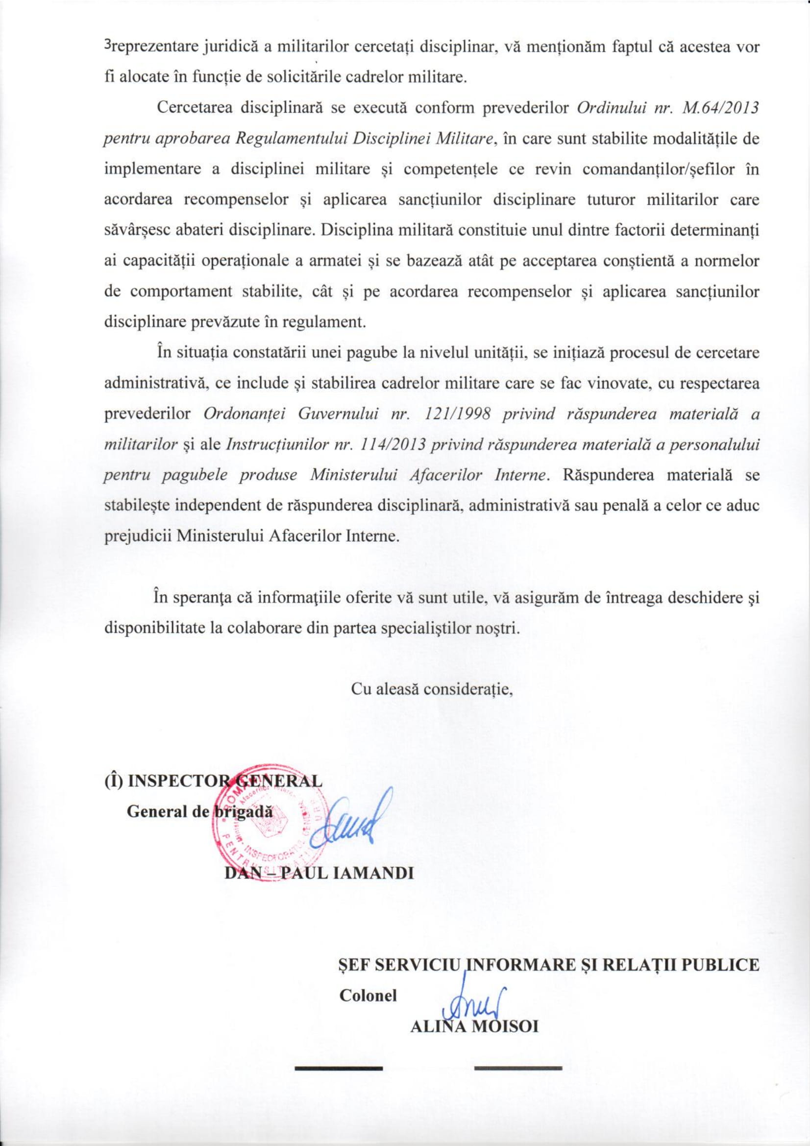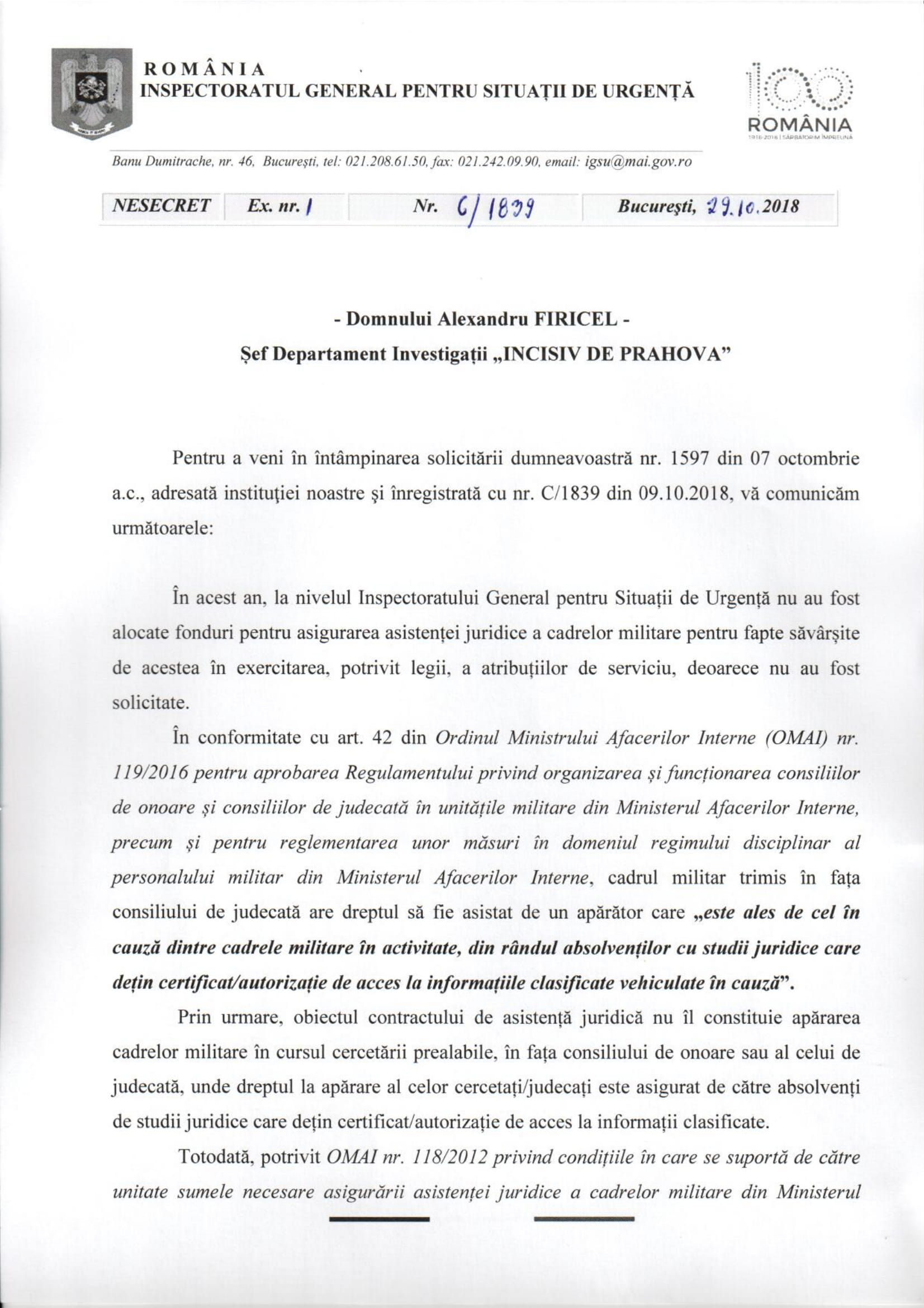 Aceeași adresă susține că „nu subsizstă o obligație legală pentru ca IGSU să încheie contracte cu avocați pentru apărarea militarilor în cauzele disciplinare”. Așa o fi, însă articolul 24 din Constituție care își are sediul în articolul 6 al Convenției EDO nu face distincție între cetățenii României. Iar dreptul la apărare este garantat fiindcă așa a votat poporul român Constituția României, drept constituțional, fundamental, care nu se aplică „pe ochi frumoși” ci tuturor cetățenilor acestei țări. Iar dreptul de acces la Justiție trebuie să fie asigurat tuturor cetățenilor acestei țări, indiferent de profesie, încă de la data vătămări unui drept fundamental, potrivit articolelor: 21, 52, 124 și 126 Constituție care prevede că accesul la Justiție nu poate fi îngrădit, judecătorul având obligația să judece cauzele primordial conform CEDO, Tratatelor Internaționale la care România este parte, dreptului european (comunitar), Constituției și Legii. Iar Deciziile Curții Constituționale se aplică pe durata întregului proces (de la data vătămării dreptului până la soluționarea cauzei de către instanța de judecată)… fiindcă așa a decis Curtea Constituțională a României în jurisprudența sa obligatorie de la data publicării în Monitorul Oficial, chiar dacă decizia Curții a fost publicată după ce a fost vătămat dreptul persoanei (pe durata procesului).