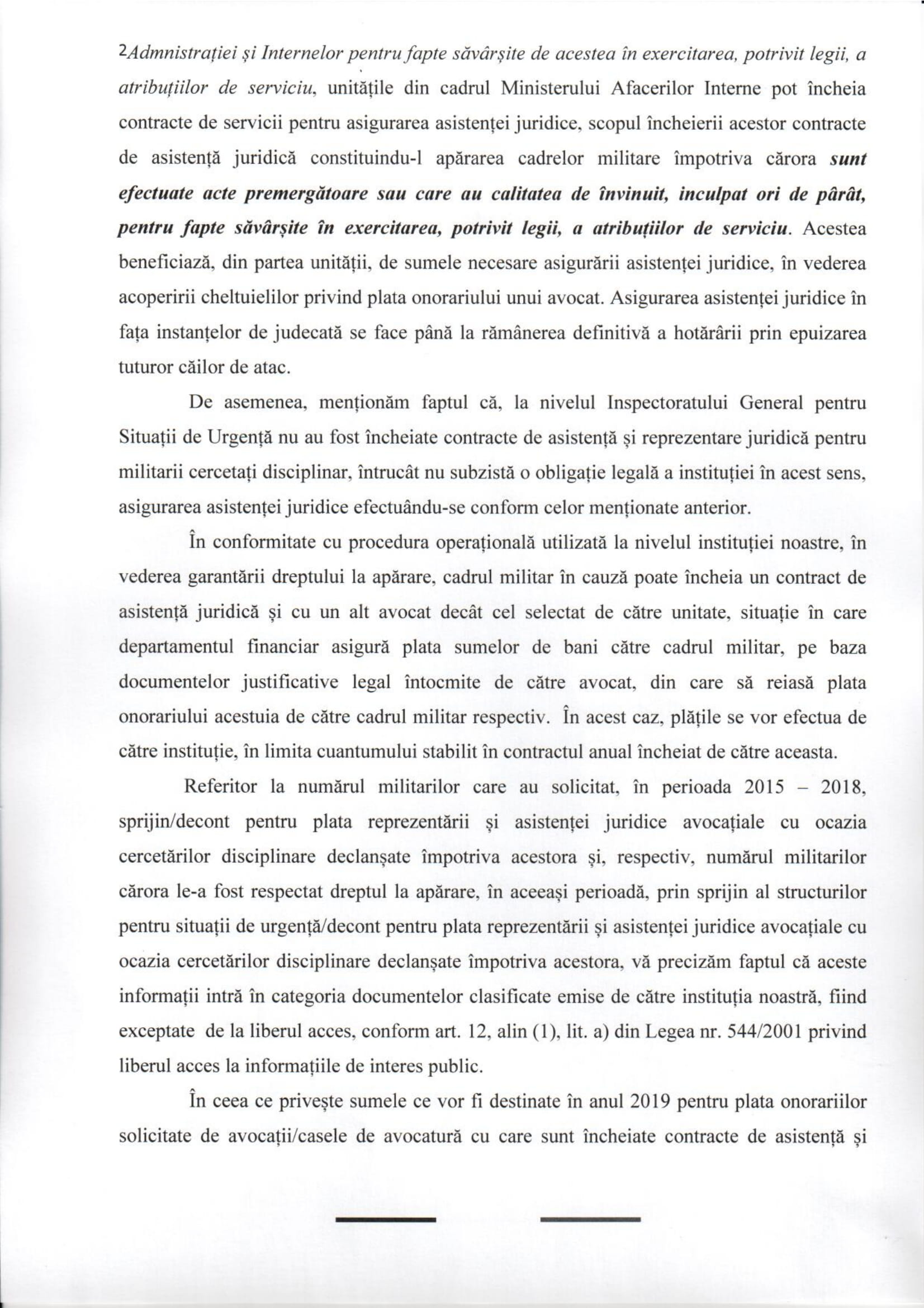 Aceeași entitate a M.A.I.-ului (I.G.S.U.) susține că militarii care au beneficiat de decontare aserviciilor avocațiale „sunt informații clasificate fiindcă așa au vrut ei”. Înțelegem de aici că în IGSU dreptul la apărare se efectuează „pe pile”/doar pentru șefi, deconturile acordate pentru serviciile avocațiale „nefiind publice”… Deci, banul public se oferă discreționar, „cu dedicație”, iar asta e o informație clasificată, nepublică… deși Legea privind protecția informațiilor clasificate nr.182/2002 și articolul 13 al Legii privind informațiile de interes public nr.544/2001 interzic cu desăvârșire cliasificarea informațiilor care ascund abateri de la Lege.