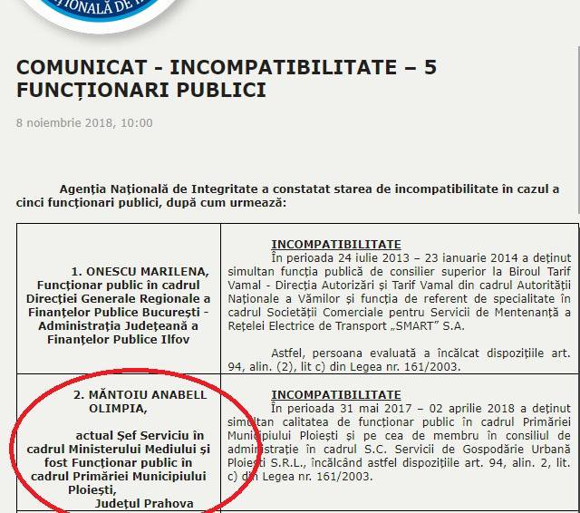 Agenția Națională de Integritate a constatat starea de incompatibilitate în cazul a cinci funcționari publici, printre care și Anabell Olimpia Măntoiu, fost secretar al municipiului Ploiești.