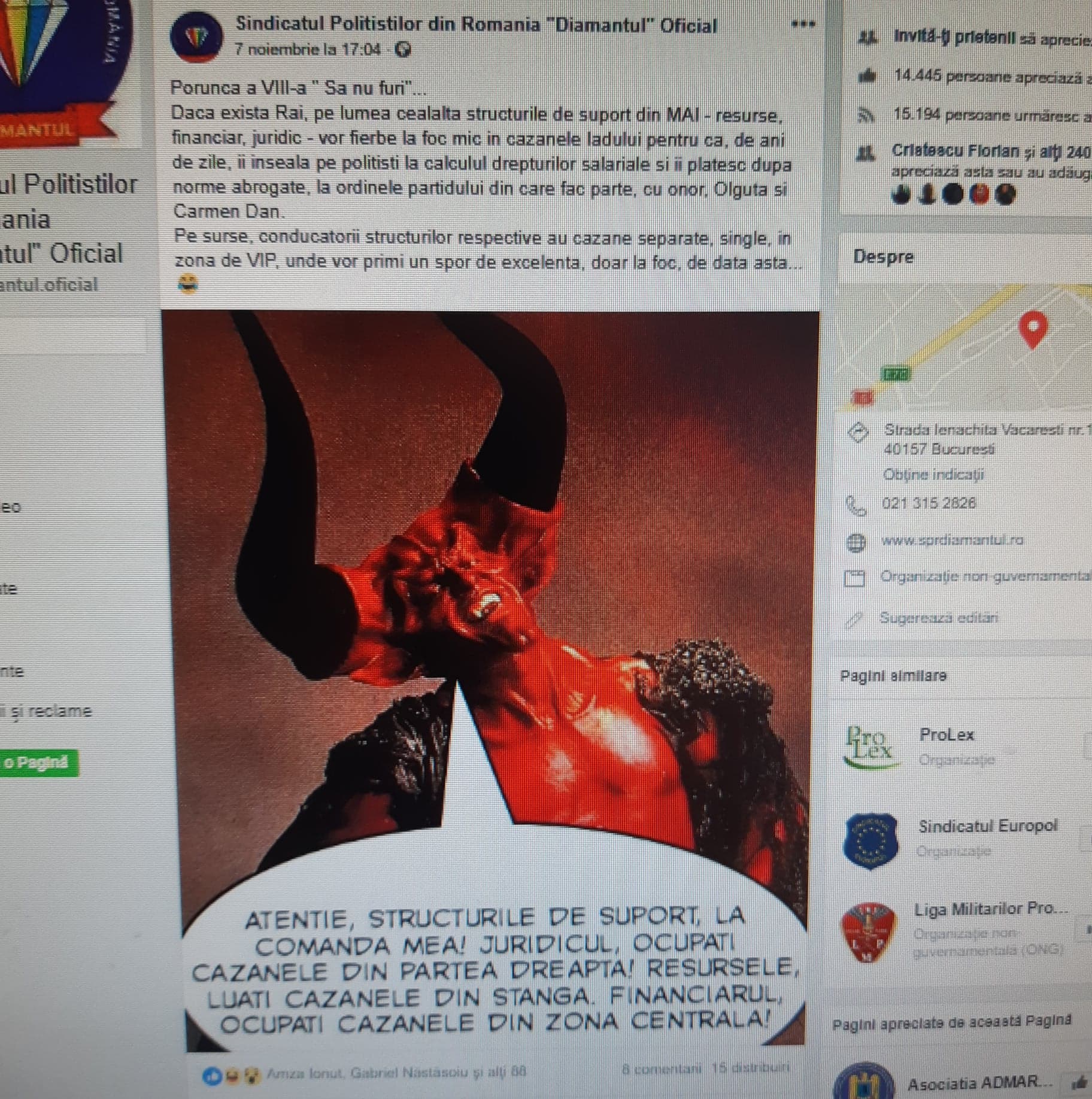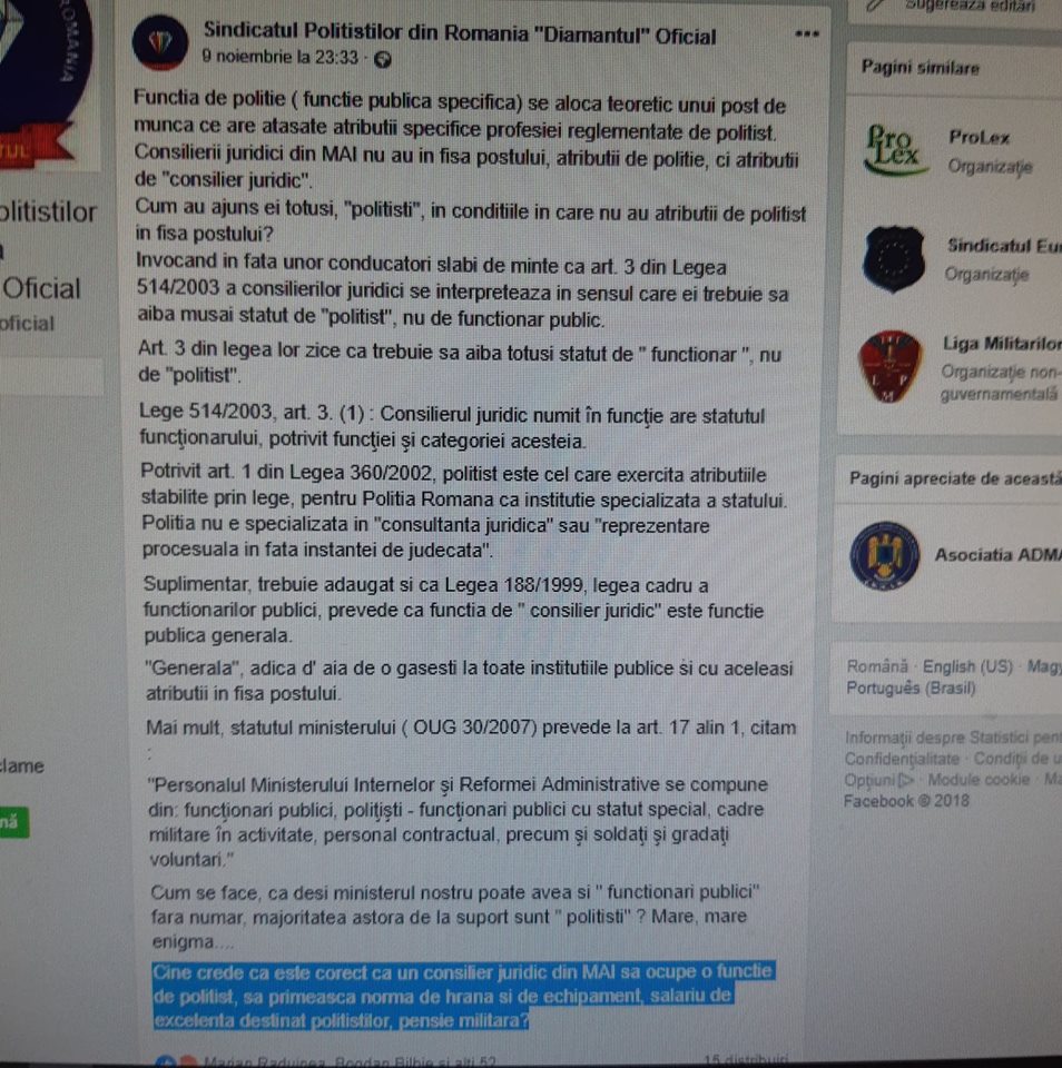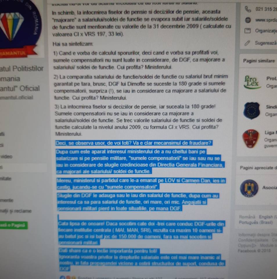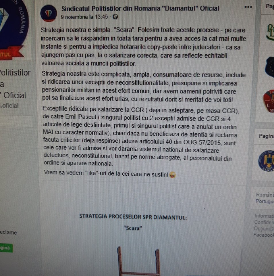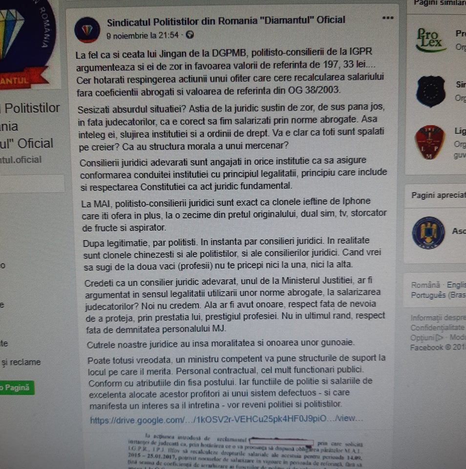 După ce a „fentat”: Legea, Bugetul de Stat și Bugetul organizației sindicale „Diamantul” prin majorarea salariului de la minimum pe economie la 10.000net/lună pentru a dobândi pensia de 6.000RON/lună și, după ce a „scăpat” de toți liderii sindicali incomozi afacerilor de tip criminal organizat promovate de actualii pensionari M.A.I.: Păscuț și Șerbănescu, Păscuț Emil își atacă colaboratorii… „mușcă mâinile care i-au pus pensia de partid în brațe”. Într-o postare din 17.11.2018 orele 17.04 de pe pagina oficială de Facebook a „diamanților”, cineva (postarea nu e asumată de niciun „lider diamantin”) scrie că: „să nu furi” și începe să „guițe” că cei din structurile suport ale M.A.I. îi fură pe polițiști. Zău? dar voi ăștia de la diamantul, Păscuț și Șerbănescu, care v-ați făcut pensii de la stat „pe nașpa”, cu bani de acasă ș.a.m.d., de ce nu ziceți nimic de cum i-ați înșelat pe membrii, pe „colaboratorii voștri”? Hai, măi „cinstiților”, postați public (și semnați-vă postările) că sunteți „nevinovați”… nu mai aruncați voi cu piatra în ceilalți în condițiile în care și voi ați „faultat” legea, „colaboratorii” și proprii membri de sindicat… Aveți curaj, „cinstiților diamantini”?