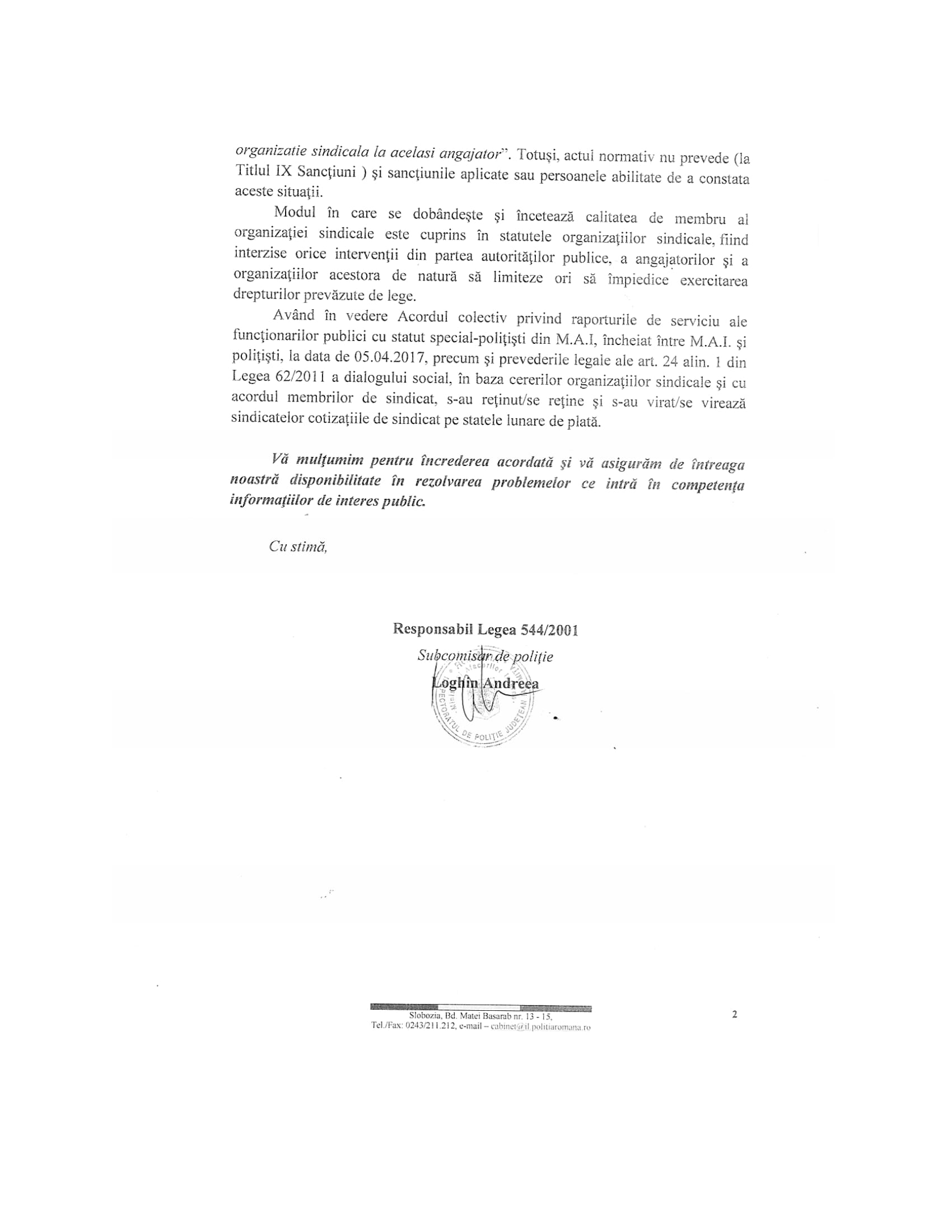 N.R. Sperăm ca decidenții din IPJ Ialomița să respecte Legea nu „voința sindicaliștilor” sau a oricărei alte persoane, căci funcția managerială nu înseamnă doar: bani, prime și alte beneficii personale ci este atribuită „la pachet” și cu o mare răspundere: aceea de a avea grijă de ceilalți, să vegheze la respectarea Legii. Să înțeleagă și decidenții din IPJ Ialomița că ialomițienii vor servicii publice de calitate, implicit al Poliției. Iar un serviciu public de calitate este oferit doar de angajați profesioniști motivați nicidecum de angajați care trăiesc și muncesc cu teamă: „oare cât îmi mai taie din leafă luna viitoare” sau „oare când: îmi vor repara autoturismul/calculatorul; vor achiziționa tehnica necesară/rechizite/ consumabile” etc.