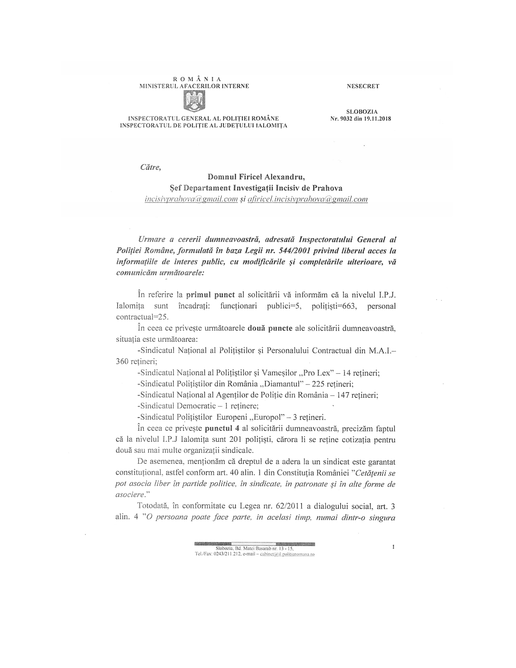 În Ipj Ialomița situația celor 690 de angajați (5 funcționari publici, 25 personal contractual și 663 polițiști) înscriși ca și membrii de sindicat, este următoarea: