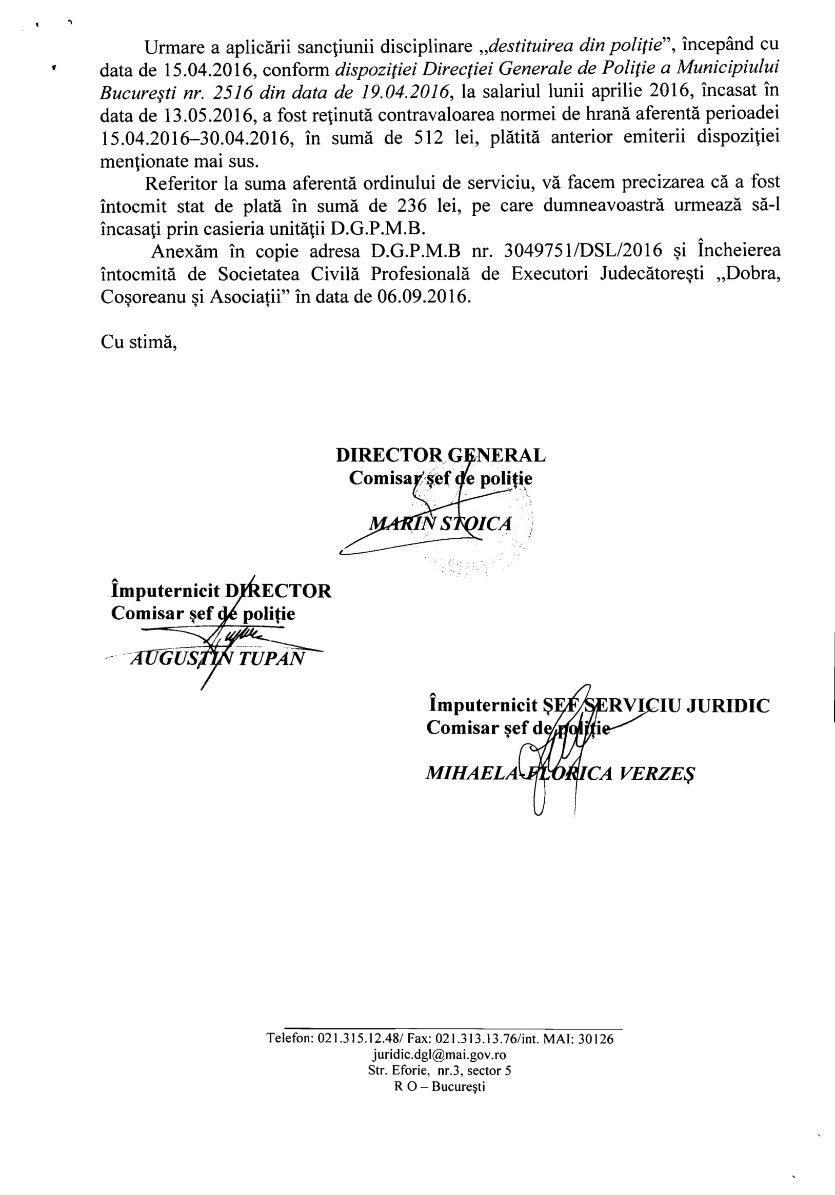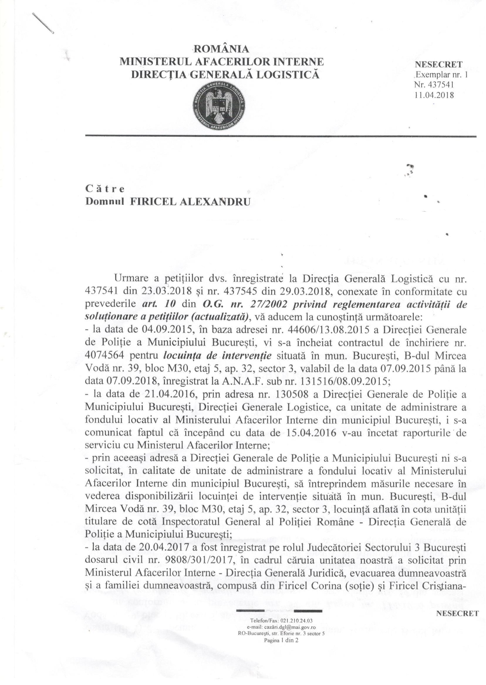În data de 14.11.2018, după ce i-a fost comunicată somația de evacuare (executare) silită de către Societatea de executori Judecătorești Dobra, Coșoreanu&Asociații, Alexandru Firicel s-a adresat societății executoare: „De ce nu au depus la dosarul cauzei de executare (evacaure) și încheierea Judecătoriei Sectorului 3 din data de 29.01.2018?” Executorul judecătoresc Stancu Marian a susținut că „nu a știut”… că „i-a băgat sub nas judecătorului doar ce i-a dat M.A.I.-ul…” exact ce trebuia ca să aprobe executarea și aruncarea în stradă a lui Alexandru Firicel, în pragul iernii: contractul de închiriere expirat în data de 04.09.2018 și care nu a mai fost prelungit (sau întocmit unul nou) în baza încheierii din 29.01.2018 fiiindcă falșii polițiști din M.A.I. – structura de logistică (Direcția Asigurare Logistică Integrată) condusă de polițiștii de birou: Peligrad Ion, Tupan Augustin și Trucă Mihai-Dan „nu au vrut”… Degeaba s-a adresat Alexandru Firicel ministrei Carmen Dan și M.A.I.-ului că aceștia stau ascunși în birourile luxoase așteptând ca Alexandru Firicel să fie aruncat în stradă cu soția și fetița de 8 ani, cu doar 3 zile înainte de 01.12.2018 (dată când orice evacuare este interzisă de Lege) dar, mai ales, „pentru sărbătorirea Unirii tuturor Românilor lor” nicidecum a tuturor românilor (inclusiv cei care îi critică și le evidențiază incompetența, abuzurile, ilegalitățile).