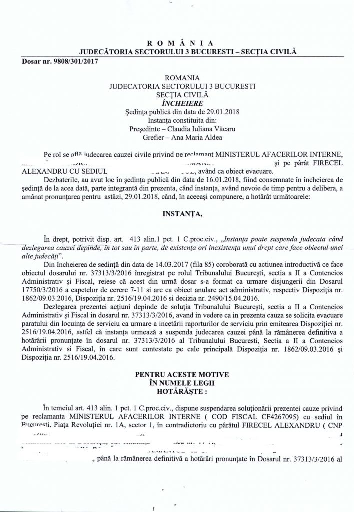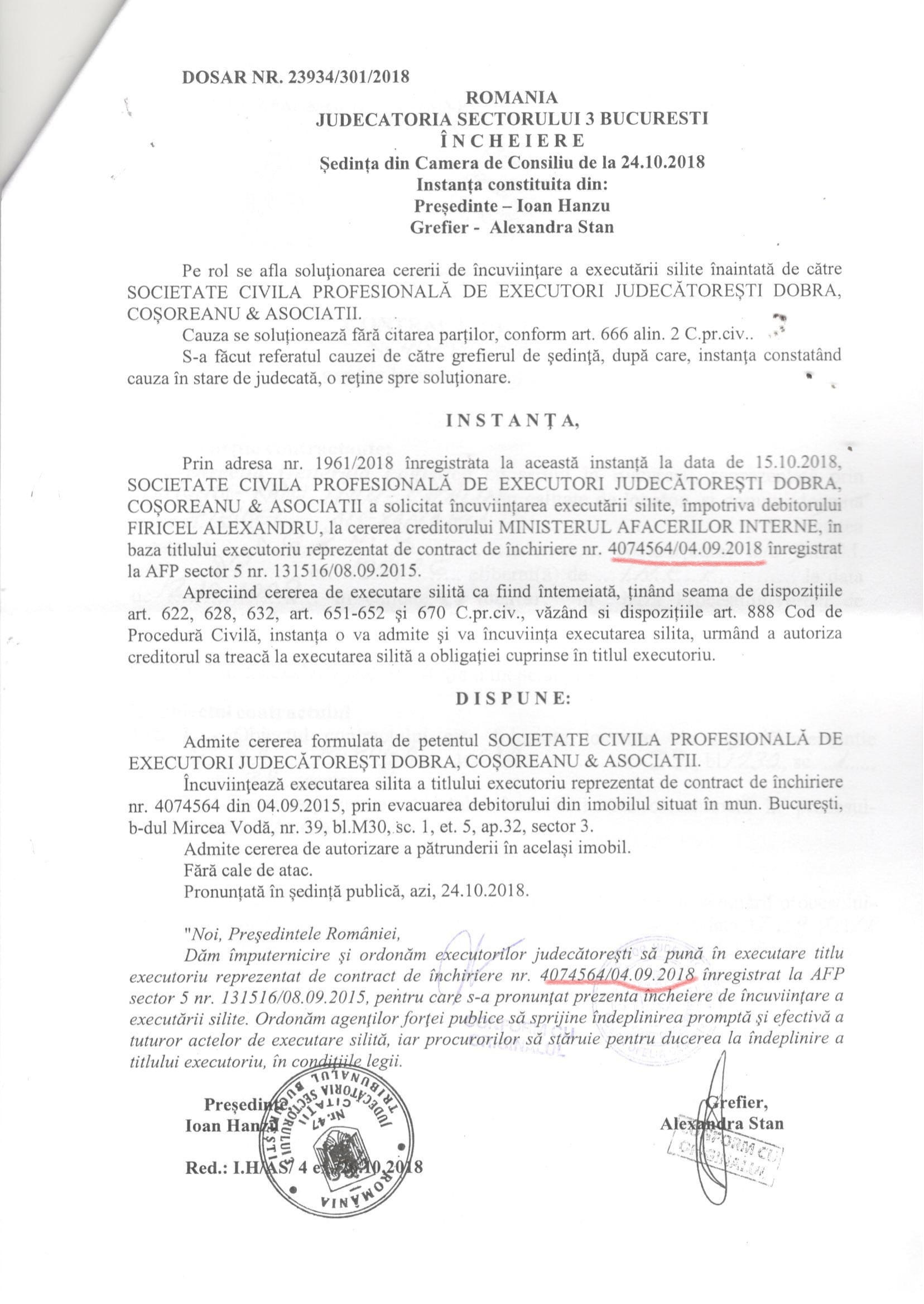 Dar, pentru că falșii polițiști din structurile suport ale M.A.I. au comportament infracțional, mitoman, politicianist, în luna octombrie 2018 au revenit la Judecătoria Sectorului 3 prin aceeași Societate de executori Judecătorești Dobra, Coșoreanu și Asociații. M.A.I. „a omis” să depună la dosarul cererii de executare (evacuare) silită hotărârea instanței din 29.01.2018 în dosarul nr.9808/301/2018 prin care instanța a trimis la plimbare M.A.I.-ul… așa că, Judecătoria Sectorului 3 a admis cererea M.A.I. de executare (evacuare) silită pentru Alexandru Firicel.