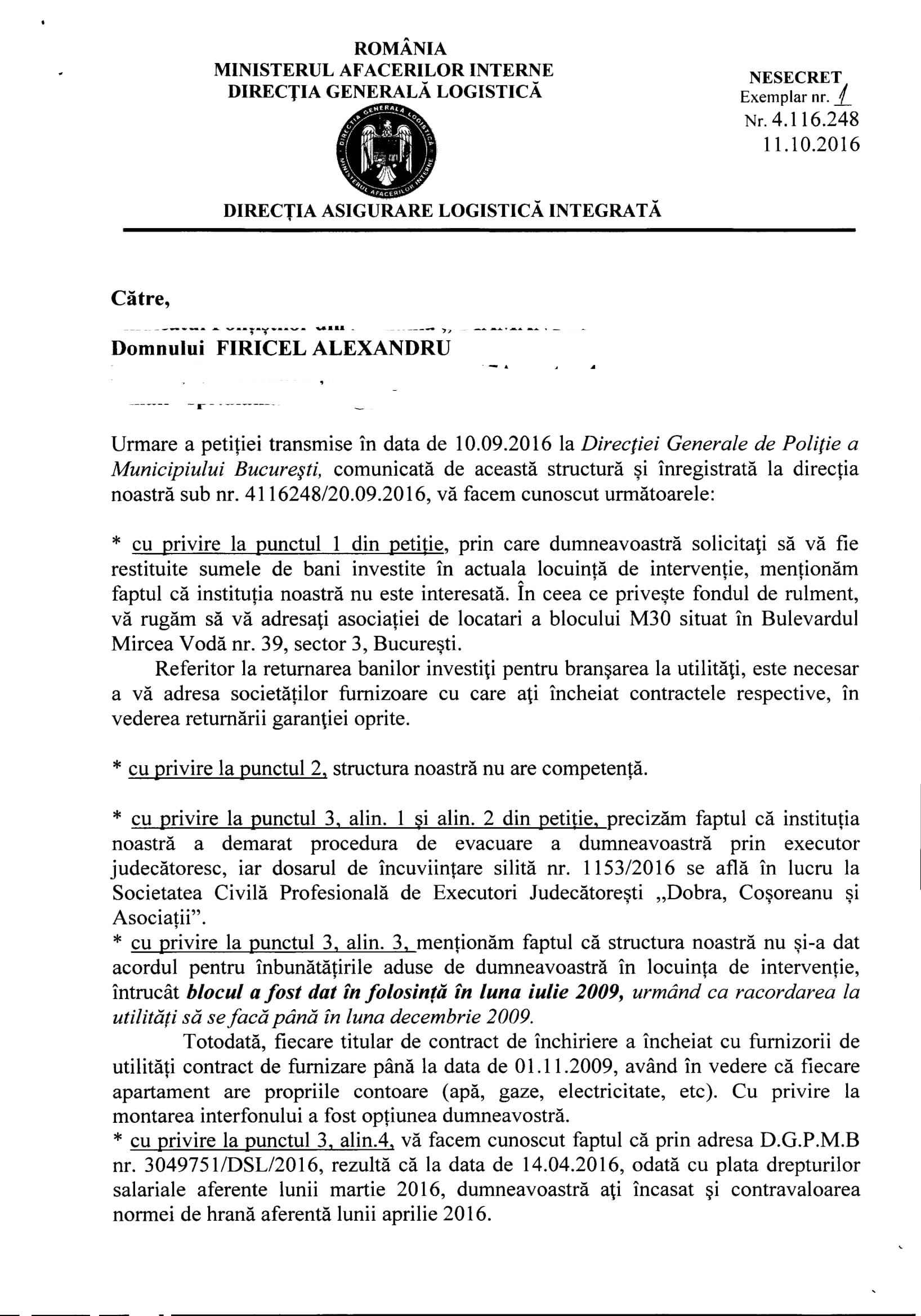 Întrucât sediile M.A.I. din Piața Revoluției nr.1A, Sector 1 și str Eforie nr.3-5, Sector 5 din Capitală nu doar că sunt departe de blocul situat în bld.Mircea Vodă nr.39, Sector 3 ci au și fost construite anterior anului 2009, nicio locuință din București a statului român aflată în administrarea M.A.I. nu se circumscrie regulii impuse de Legea locuinței. Cu toate acestea, fiindcă „ministrul e suveran”, acesta semnează orice îi bagă sub nas „șobolanii” cu epoleți din structurile suport. Astfel, blocul din Mircea Vodă a fost transformat în „bloc de locuințe de intervenție” cu încălcarea legii unde doar câțiva „amărășteni” au reușit să obțină un contract de locațiune pe o durată de 3 ani. Printre cei „rătăciți” în această repartiție a fost și Alexandru Firicel, „polițist de birou” în Aparatul central al M.A.I. („căpușă cu epoleți”) și, ulterior, polițist criminalist la Secția 13 Poliție. După ce a primit repartiția, la aproape un an de zile, Alexandru Firicel s-a mutat, în interesul serviciului la Biroul Criminalistic al Secției 13 Poliție. Bineînțeles că Aparatul central al M.A.I. nu a fost de acord ca Alexandru Firicel să rămână în locuința de intervenție „colegii” din structurile suport făcînd tot posibilul să-l evacueze … până la urmă, fără succes.