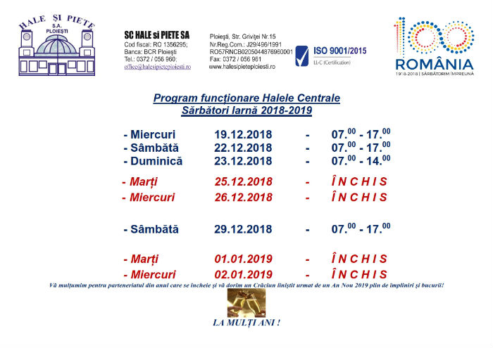 Pe 01 Decembrie 2018, sărbătorim împreună 100 de ani de România, iar noi cei de la SC Hale și Piețe SA suntem pregătiți să dăm startul evenimentului „100 de ani de Romănia – Sărbători de Iarnă 2018” care celebrează acest Centenar.
