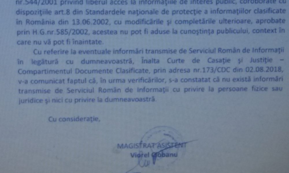 Totodată, v-am solicitat să precizați cine a făcut verificările de Securitate în cazul dumneavoastră, dacă au existat motive pentru care niciunul dintre adjuncți nu a putut să îndeplinească cerințele minime, dacă aceastea au fost concretizate într-un rezultat urmare a verificărilor de Securitate, respectiv dacă celor patru adjuncți – vicepreședinții Î.C.C.J. li s-a retras autorizația de acces la documente clasificate și dacă da, care au fost consecințele, dintre cele stipulate de art. 39 din Legea nr. 182/2002 privind protecția informațiilor clasificate.