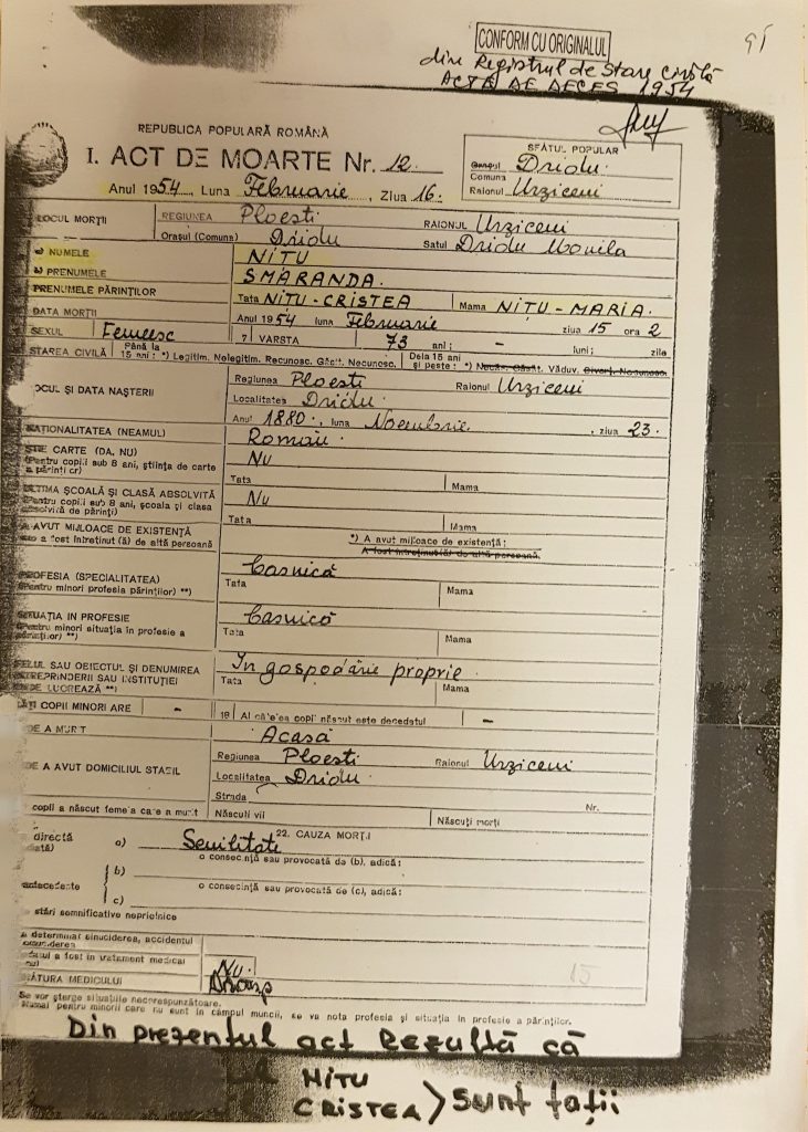 Cu mentiunea faptului ca: NITU SMARANDA care de fapt este BANU SMARANDA este fiica legitima a lui BANU NITU CRISTEA si a lui BANU MARIA.