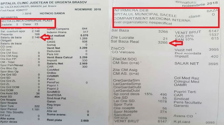 Alăturat, cel al unei infirmiere debutante cu VECHIME ZERO dintr-un COMPARTIMENT de medicină internă din spitalul MUNICIPAL Săcele, jud. Brașov, unde este înscrisă ca salariu de bază suma de 3.266 lei.