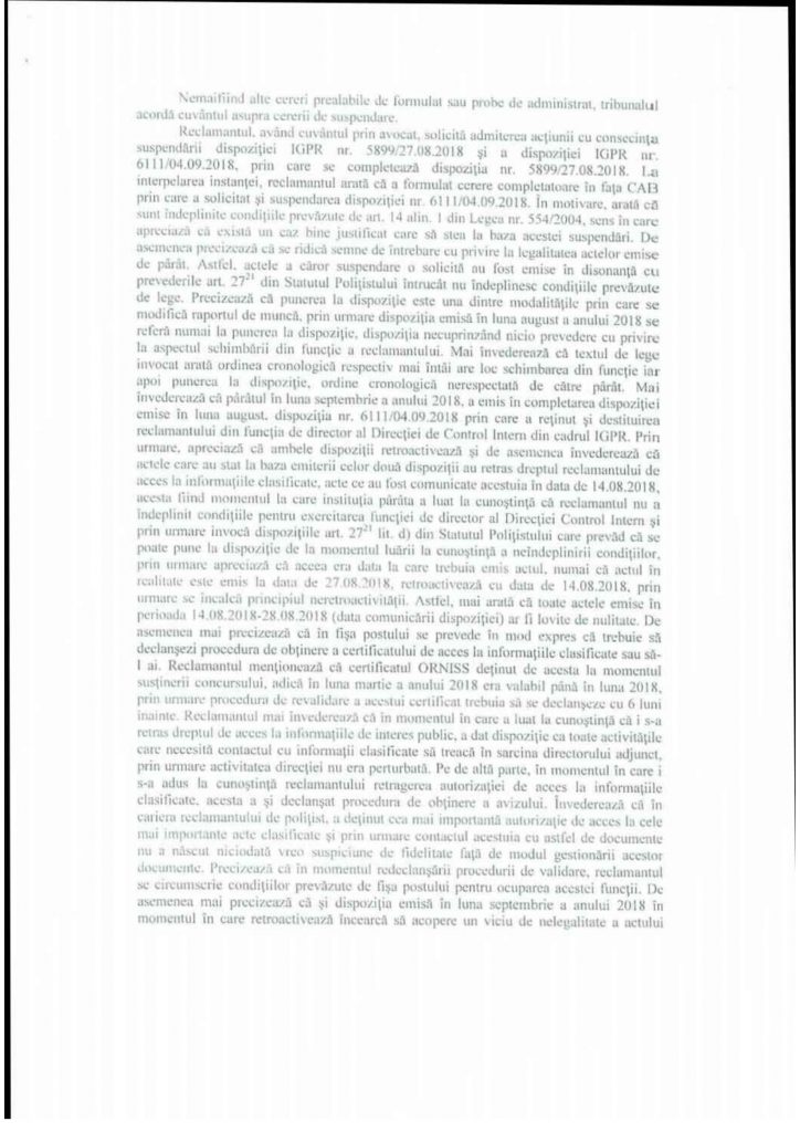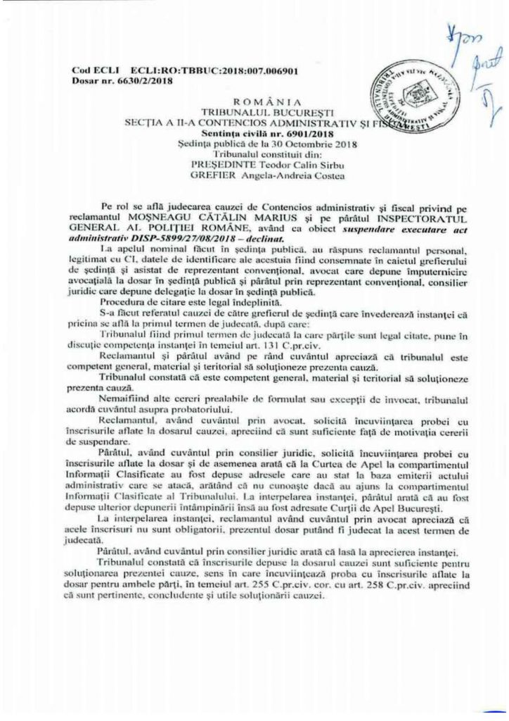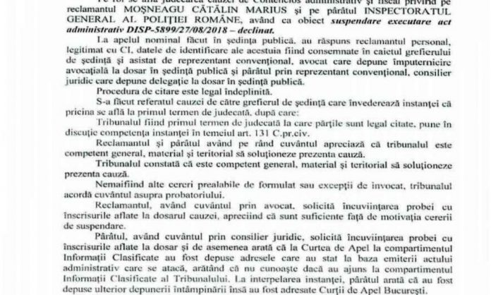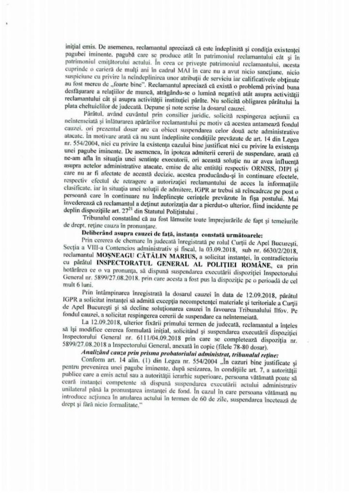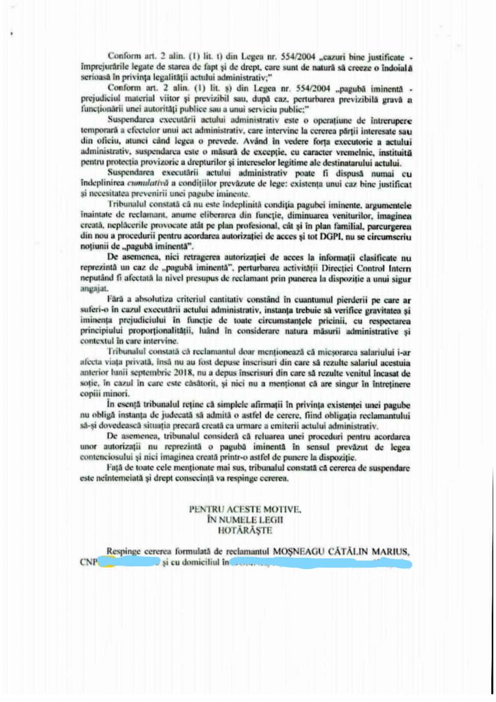 În atare condiții, cum putea un judecător imparțial, corect, să admită cererea de suspendare a actului administrativ unilateral acestui „expert milițian” Moșneagu? Numai că, Moșneagu Cătălin nu gândește așa… el crede că i se cuvine totul… orice… că, „fără el, totul e pustiu”. Poate, dar într-o altă Lume, în care Legea și Ordinea e făcută și menținută de debili și ilegaliști, nicidecum de oameni, judecători imparțiali. (Ciprian P.).