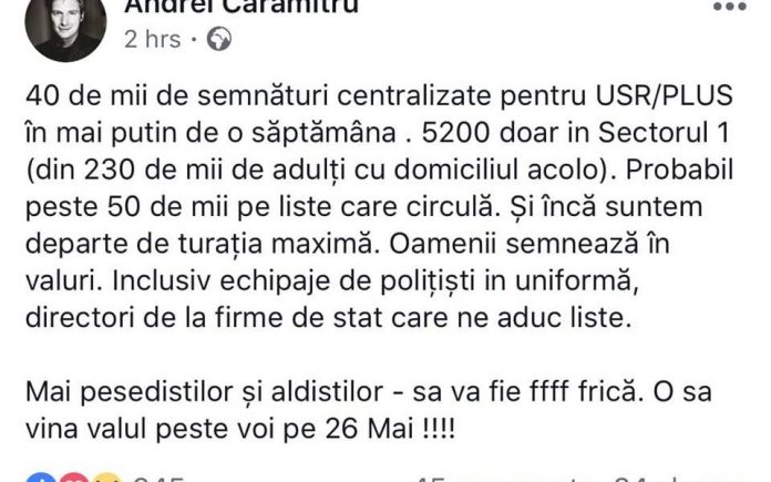 Andrei Caramitru scapă o informație gravă: Echipaje de politiști în uniformă și directori de la firmele de la stat strâng semnături pentru USR/PLUS
