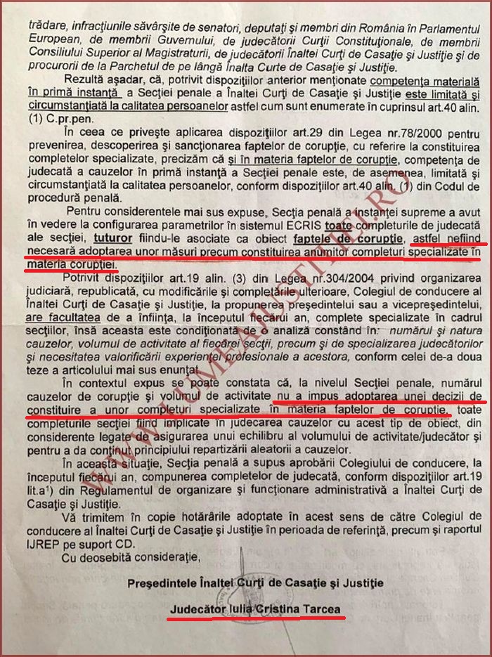 Raspunsul de la Inalta Curte a venit circa doua saptamani mai tarziu, in 11 martie 2019, cand presedinta instantei supreme judecatoarea Cristina Tarcea a marturisit ca in perioada 2014-2018, la Sectia penala, nu au fost constituite complete specializate pe infractiuni de coruptie. Acest lucru s-a intamplat intrucat, sustine Cristina Tarcea in raspunsul pe care Lumea Justitiei il publica in exclusivitate, competenta materiala in prima instanta a Sectiei penale este limitata de calitatea persoanelor judecata.