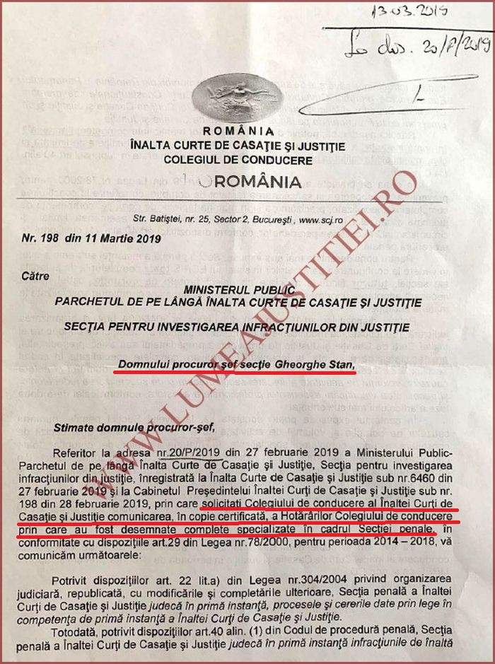 Lumea Justitiei prezinta in exclusivitate documentul prin care Inalta Curte recunoaste ca nu are complete specializate in infractiuni de coruptie, desi legea cere imperativ acest lucru. Este vorba despre un raspuns pe care presedinta Inaltei Curti Cristina Tarcea (foto dreapta) l-a trimis, in 11 martie 2019, procurorului sef al SIIJ Gheorghe Stan si in care confirma ca la Inalta Curte nu exista complete specializate. Raspunsul judecatoarei Cristina Tarcea a fost transmis la SIIJ in urma unei adrese formulate de procurorul sef Gheorghe Stan, in data de 27 februarie 2019, in dosarul nr. 20/P/2019, in atentia Colegiului de conducere al Inaltei Curti de Casatie si Justitie, caruia ii solicita sa puna la dispozitia Sectiei Hotararile Colegiului de conducere prin care au fost desemnate completele specializate in cadrul Sectiei penale pentru perioada 2014-2018.